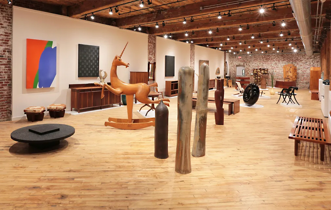 Moderne is accustomed to evolution. In 1985, Aibel received a phone call about “used furniture” that a doctor was selling. A stash of George Nakashima pieces, it laid the foundation for Aibel’s reputation as the world’s preeminent Nakashima dealer. This encouraged Aibel to delve deeper into the American Craft Studio movement, showcasing vintage selections from the likes of Wharton Esherick, Sam Maloof, and Arthur Espenet Carpenter.