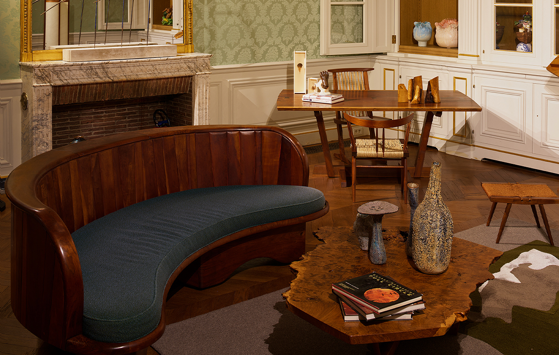 Moderne Gallery’s exhibit at Design Miami/Paris will feature iconic furniture and metalwork by George Nakashima, Wharton Esherick, L. Brent Kington, and Gyokusendo, alongside a curated selection of both historic and contemporary ceramics by esteemed artists David Gilhooly, Estelle Halper, Joost Van Den Toorn, and Zein Daouk. The dominant focus will be on rare and important furniture and lighting by George Nakashima made from 1936-1990.