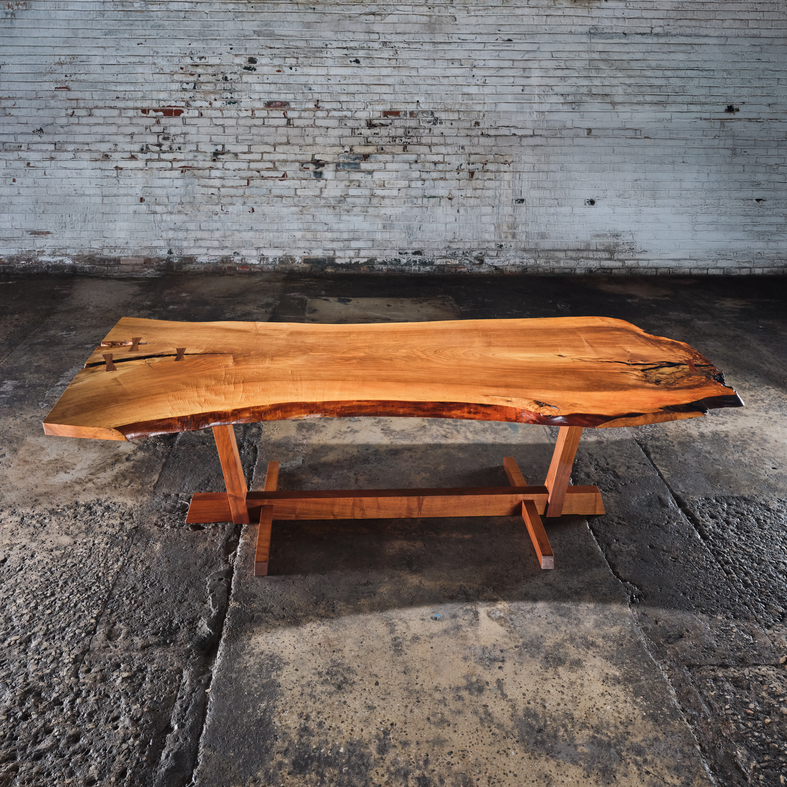 Mira Nakashima’s furniture is distinguished by its seamless integration of organic material and refined craftsmanship. Each work begins with a deep understanding of the wood itself: its grain, its irregularities, and the story it holds. Mira lets the material guide the design, often embracing live edges, natural voids, and subtle asymmetries. These elements invite a quiet sense of contemplation.