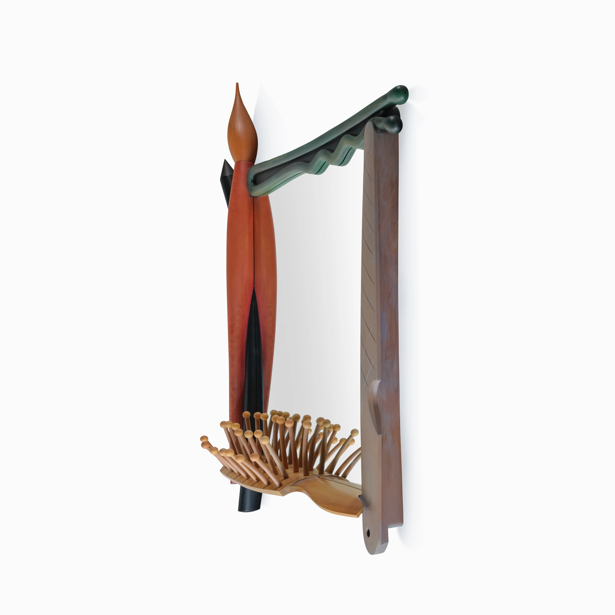A large-scale mirror, aptly titled “Big Mirror” by American studio craft master and educator Alphonse Mattia. In this postmodern form, Mattia playfully invigorates the convention of the mirror by adding sculptural, referential components along with whimsical, dynamic compositional elements.