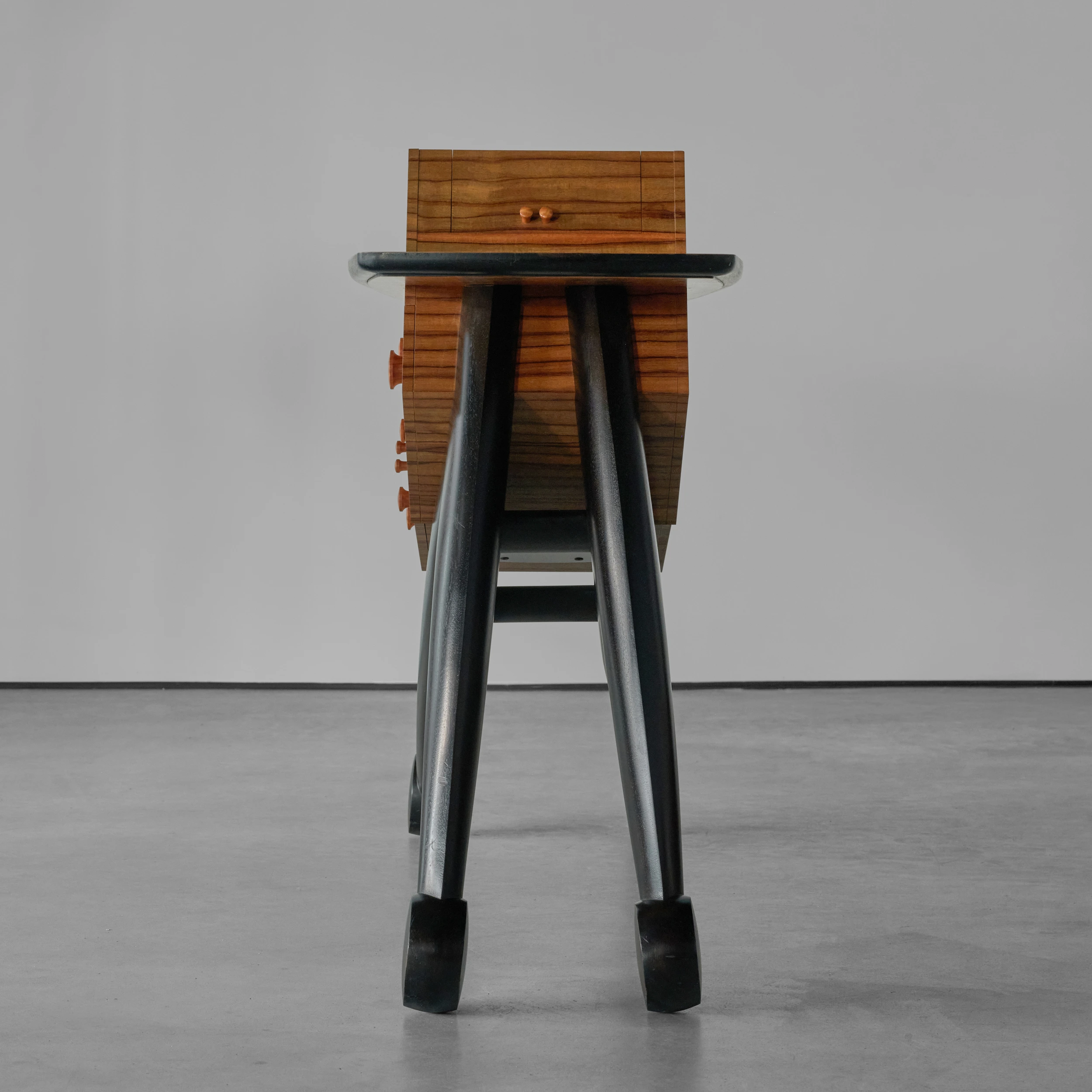 The work’s form is simultaneously zoomorphic and animatronic – perched upon striding leg forms or wheeled-shock-absorbing struts, the console’s body pieces through the tabletop surface creating a dynamic, functional top storage section.