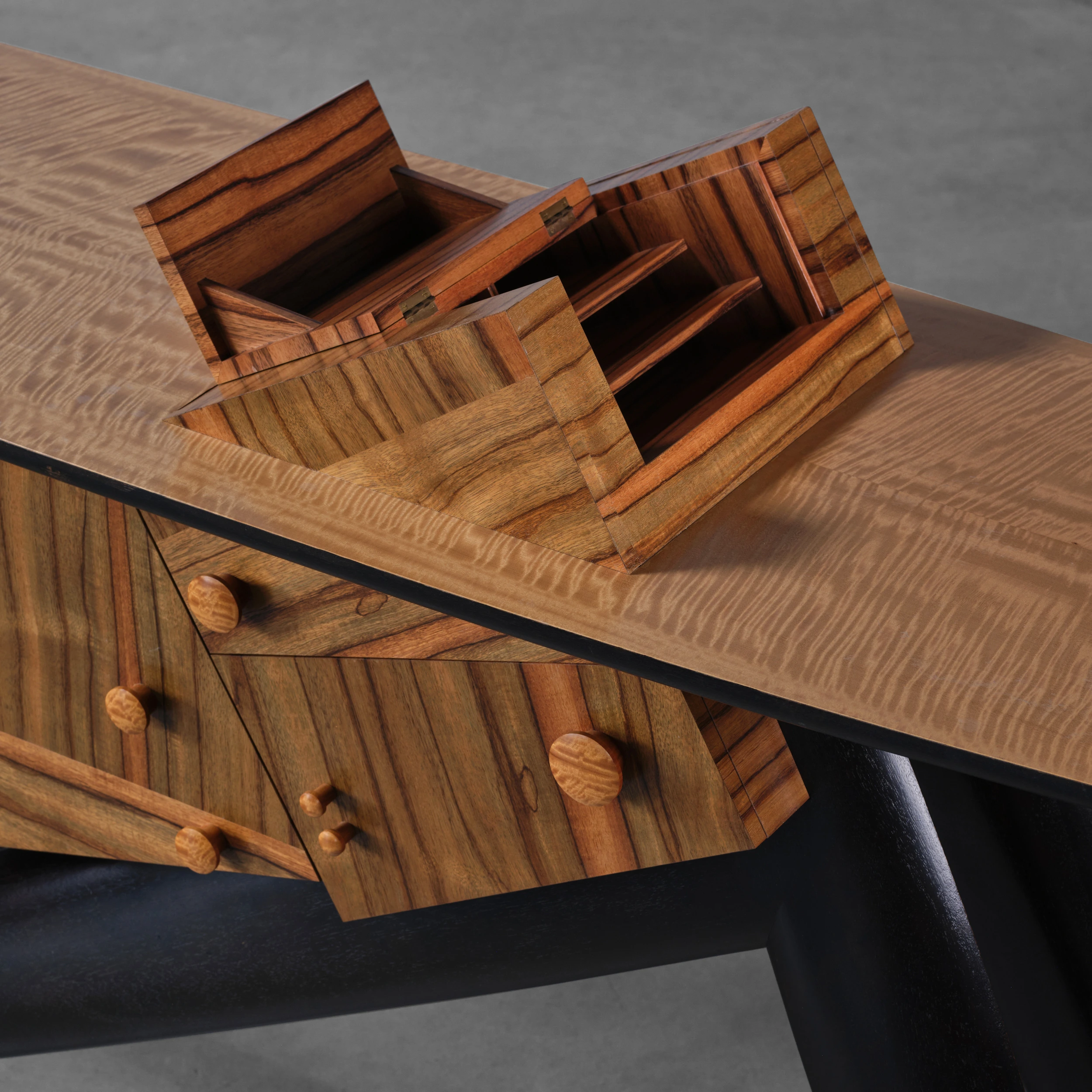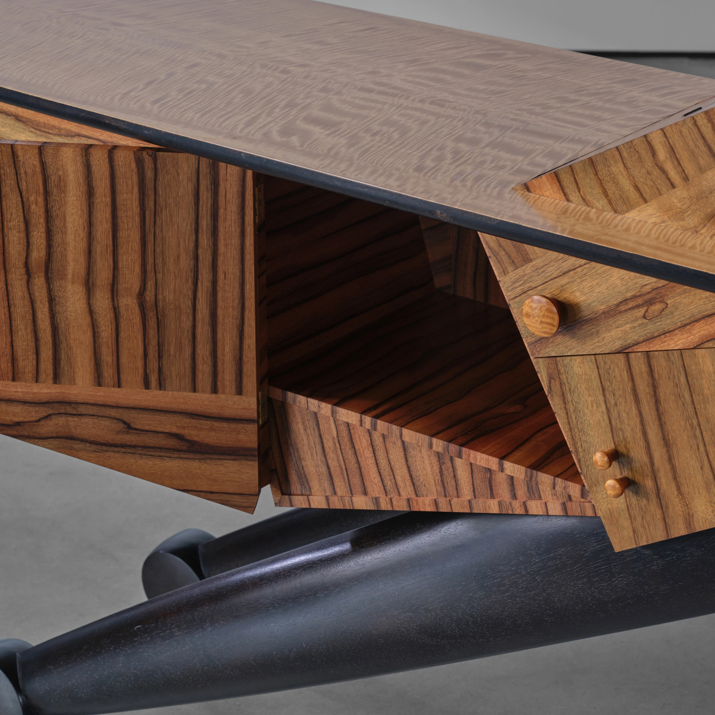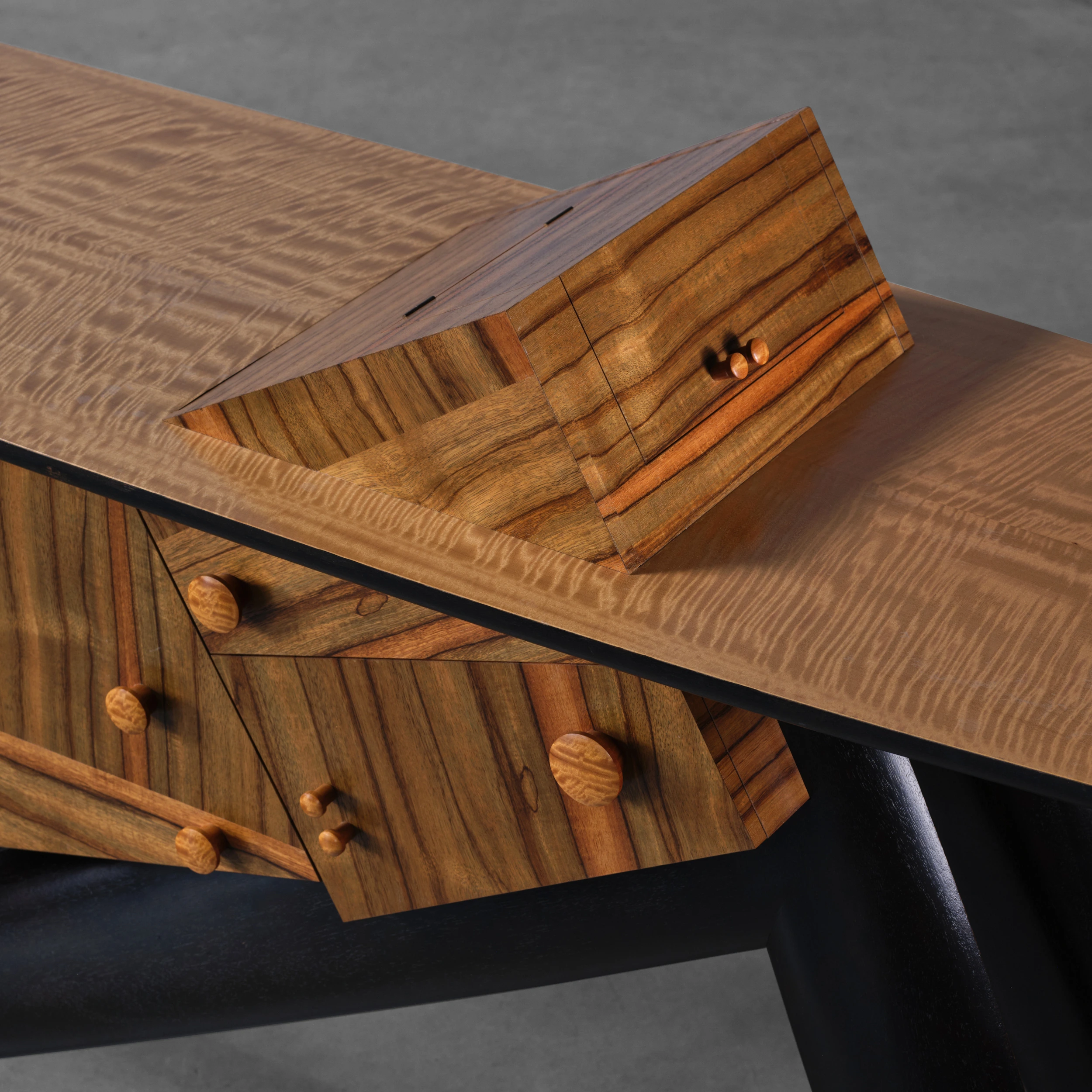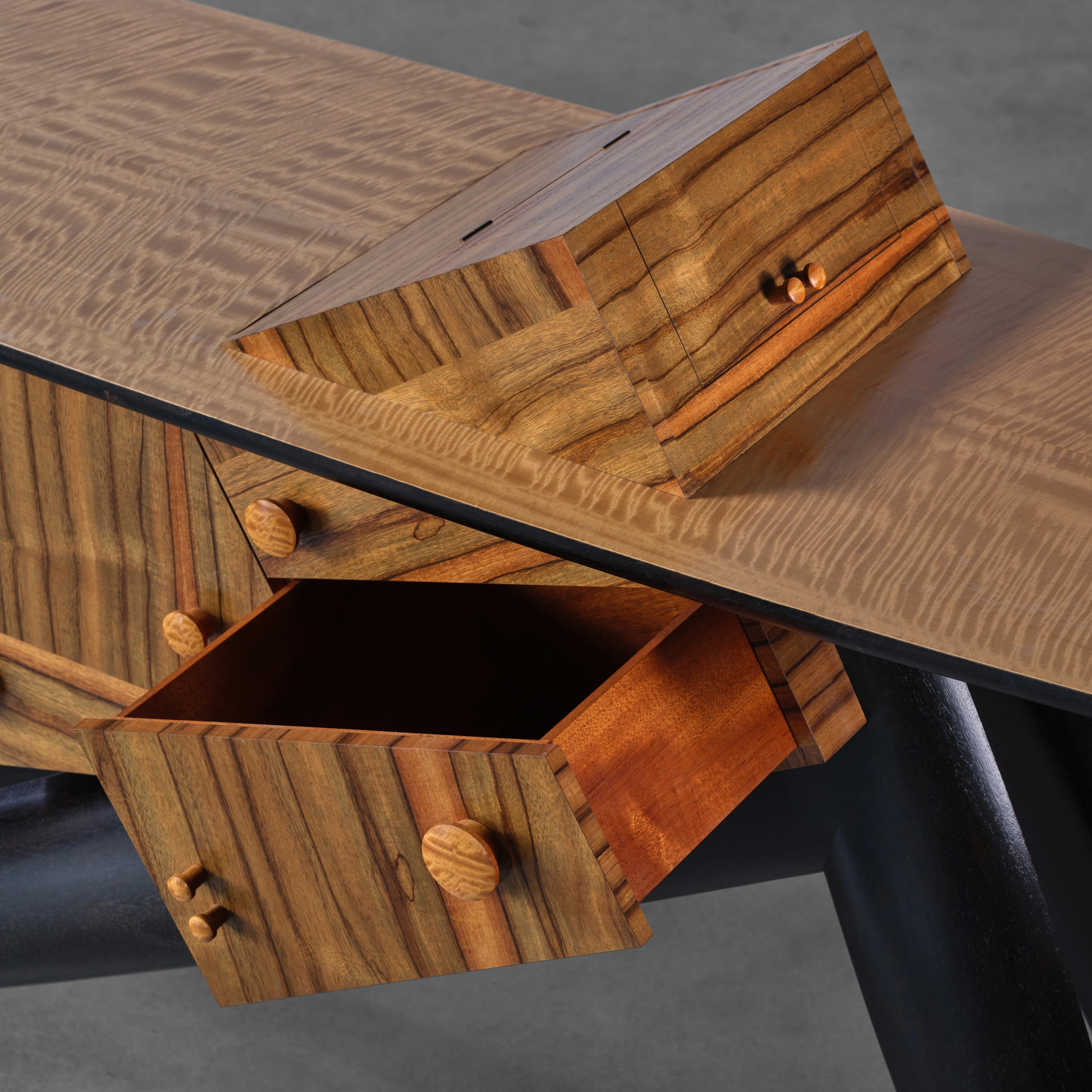 The work includes numerous drawers and cabinet features throughout – each deployed in a playful manner on curious angles and in somewhat-deceptive functionalities (drawers appear as cabinets and vice versa).