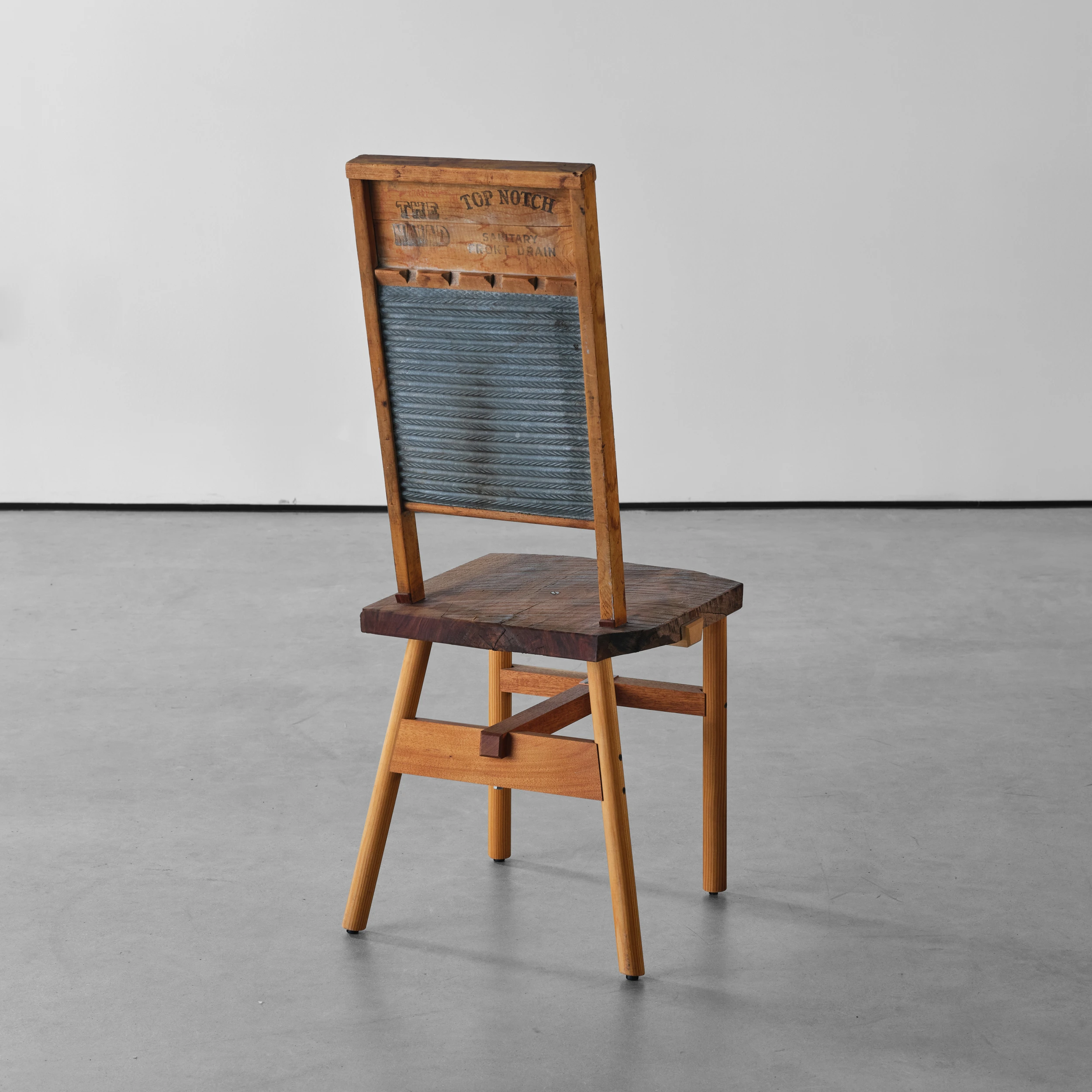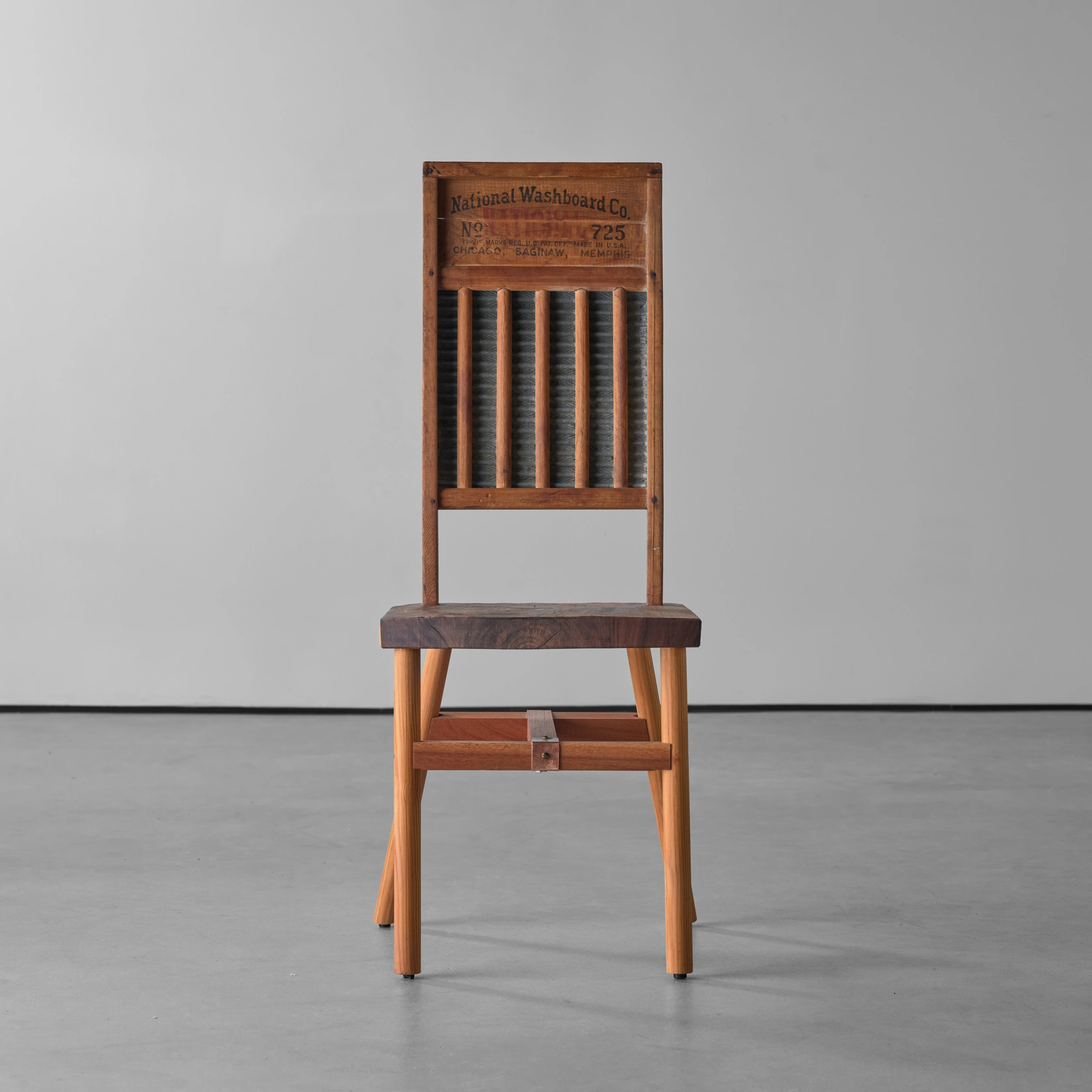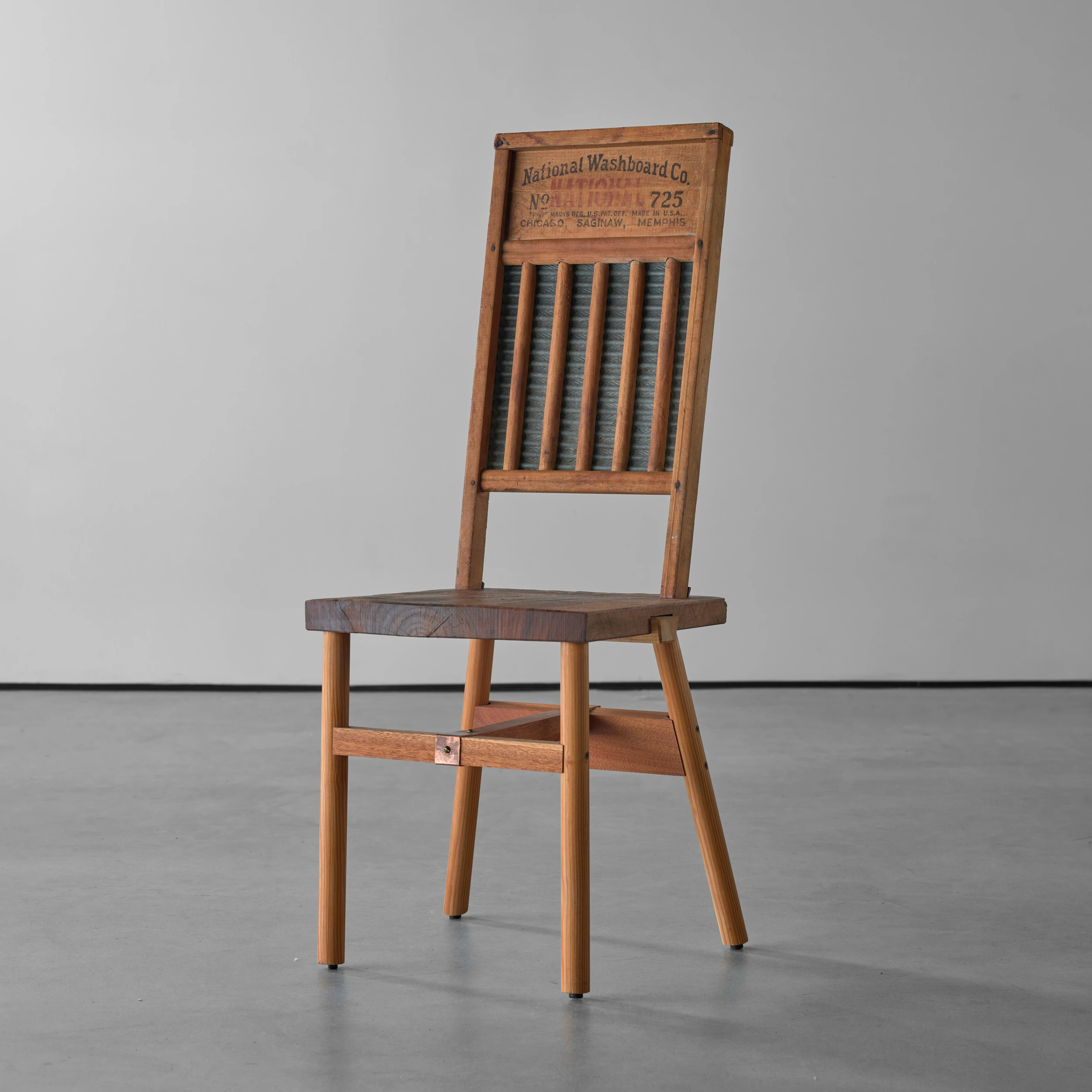 Riffing on folk traditions, “Char” includes a raw slab as the seat portion as well as a washboard as the backrest. The work’s title “Char” – a play on “Chair” also suggests a Southern drawl, further playing on the folk tradition.