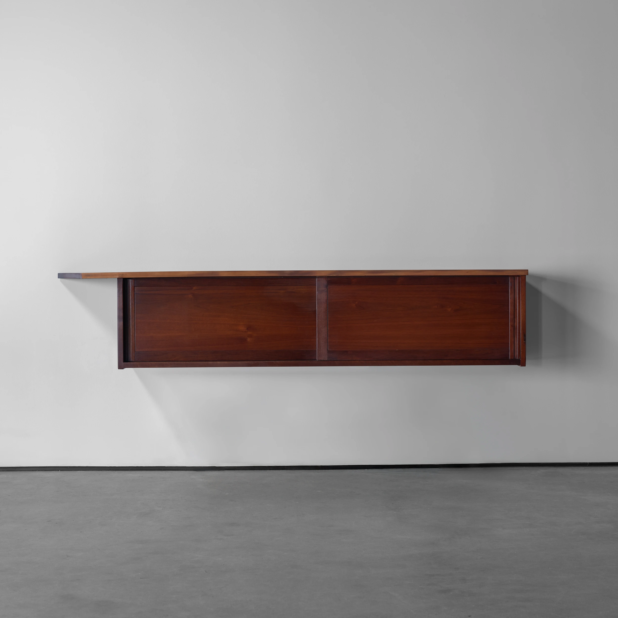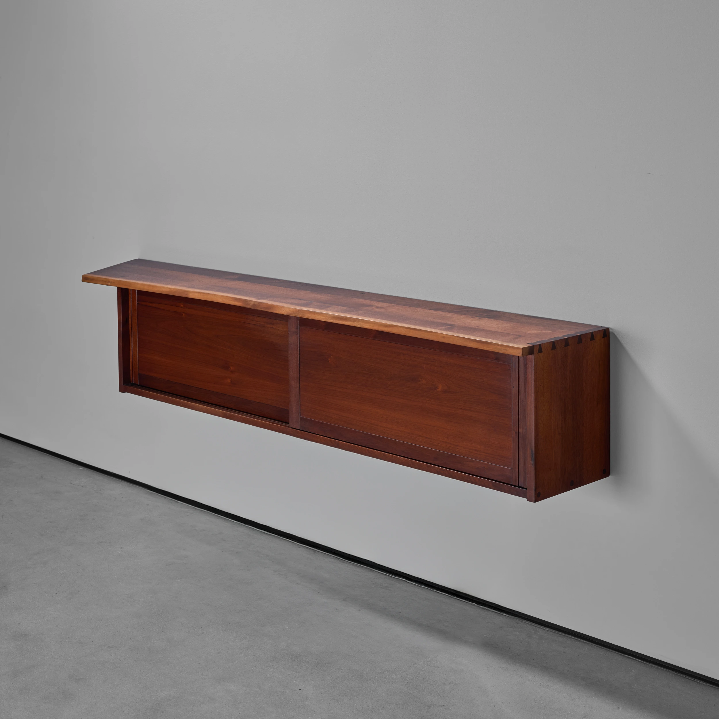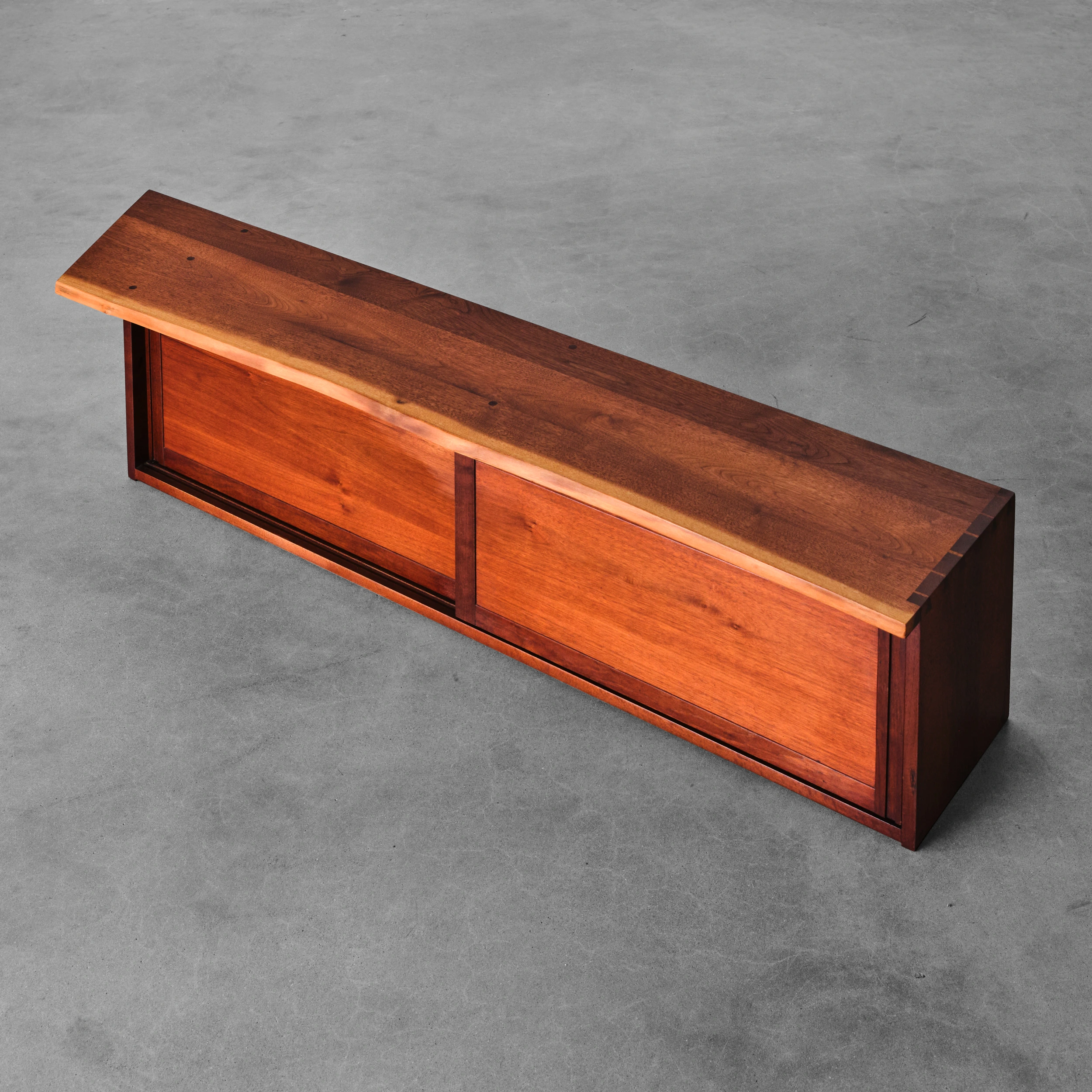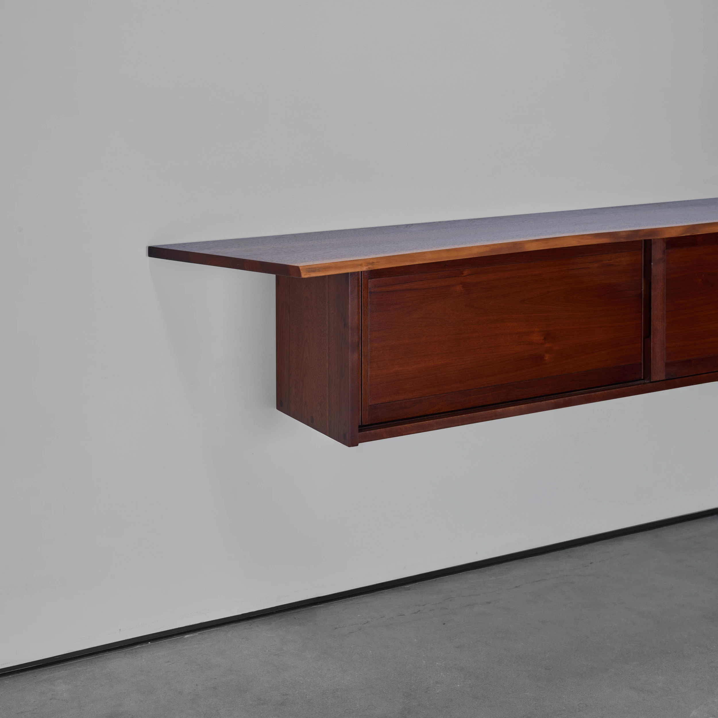 A Double Sliding Door Wall-Hung Cabinet by George Nakashima dating to 1964, featuring two solid sliding doors, a front free edge, and a left angled overhang.