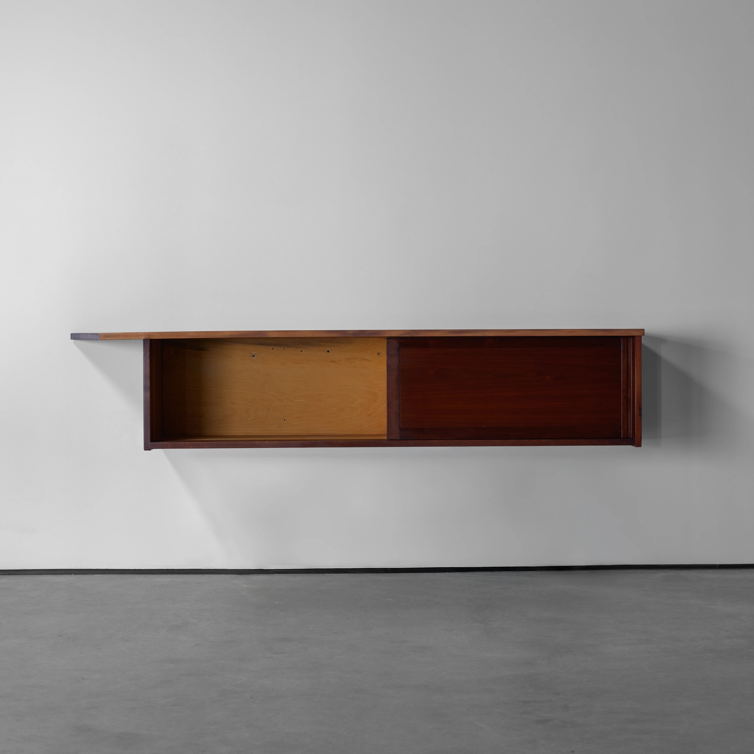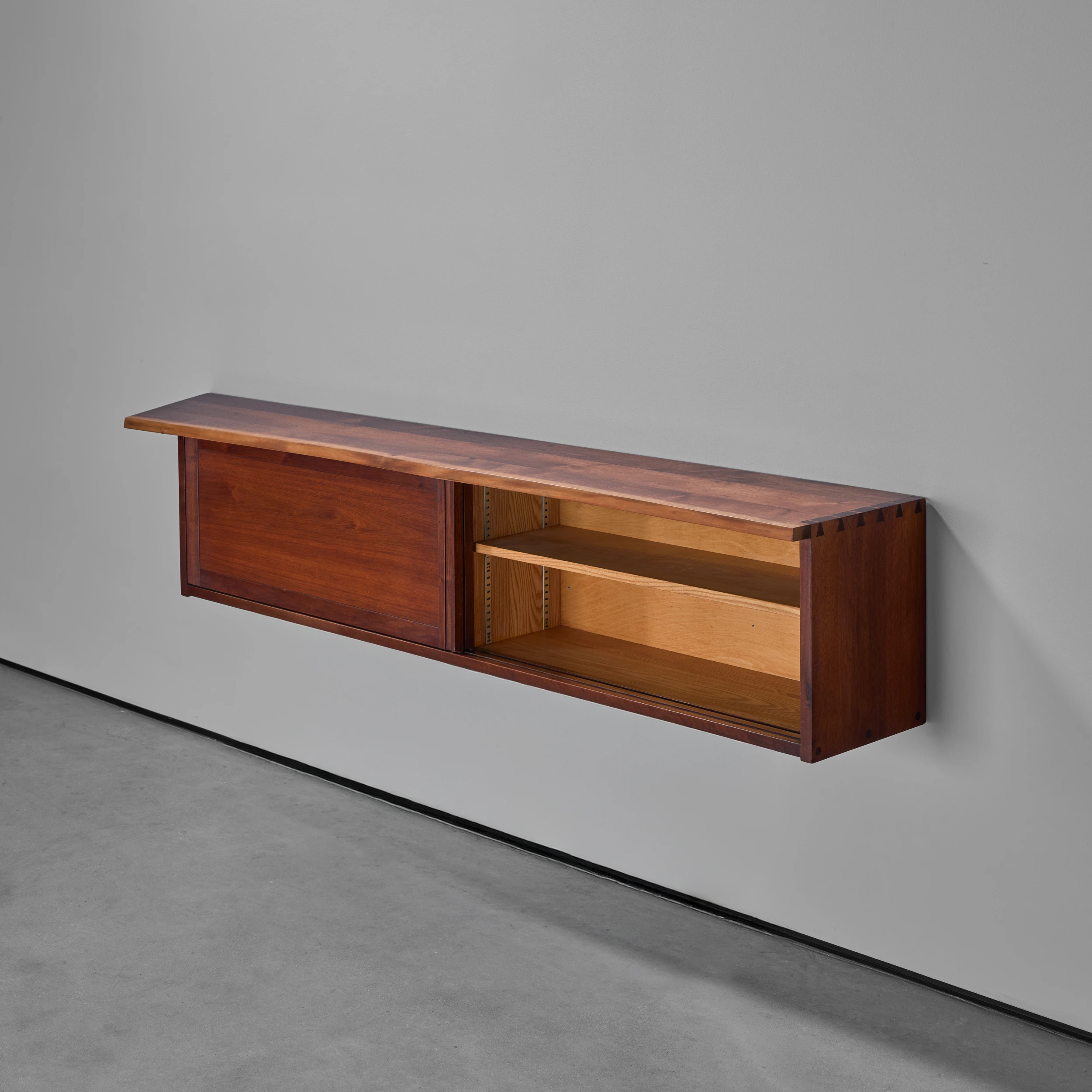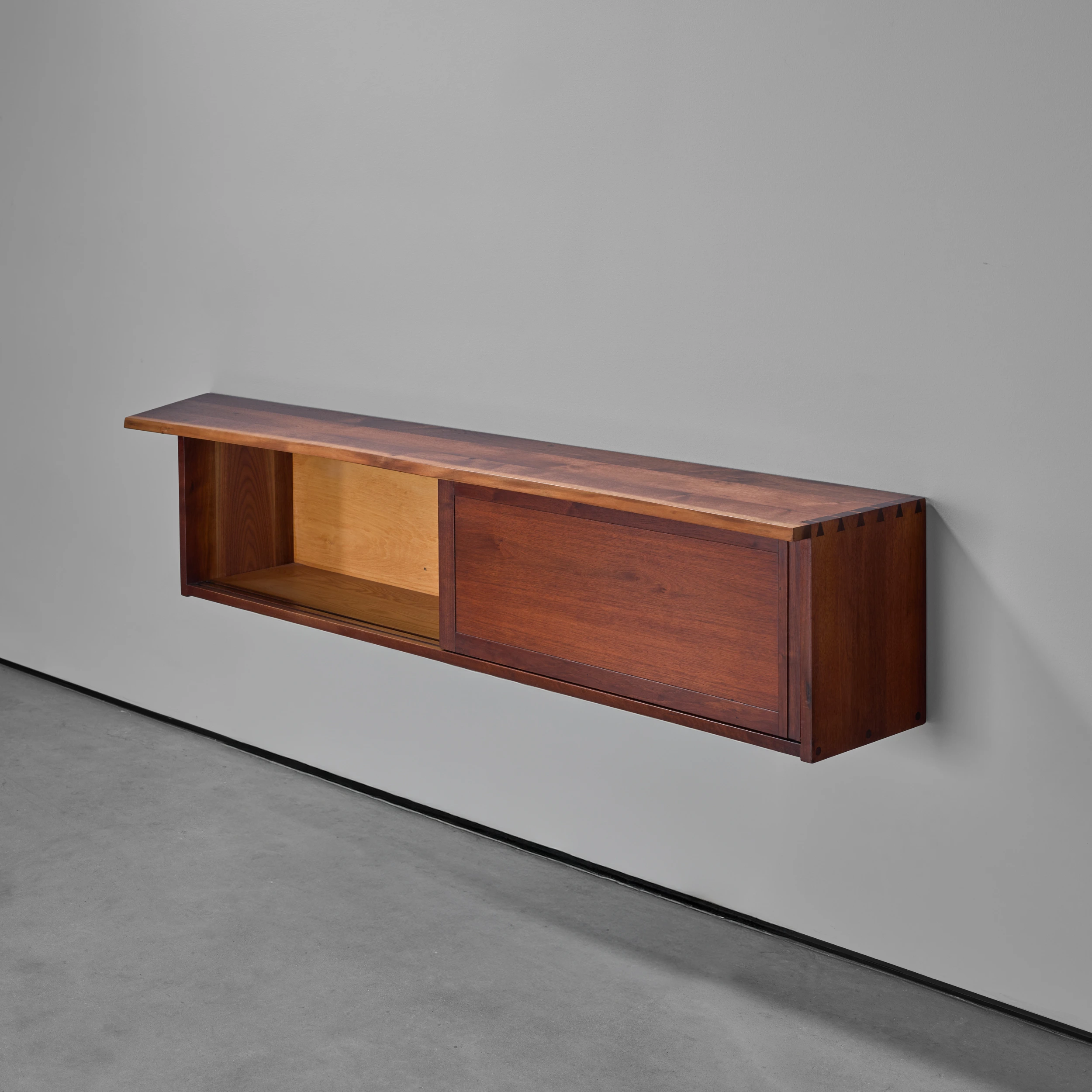 A Double Sliding Door Wall-Hung Cabinet by George Nakashima dating to 1964, featuring two solid sliding doors, a front free edge, and a left angled overhang.