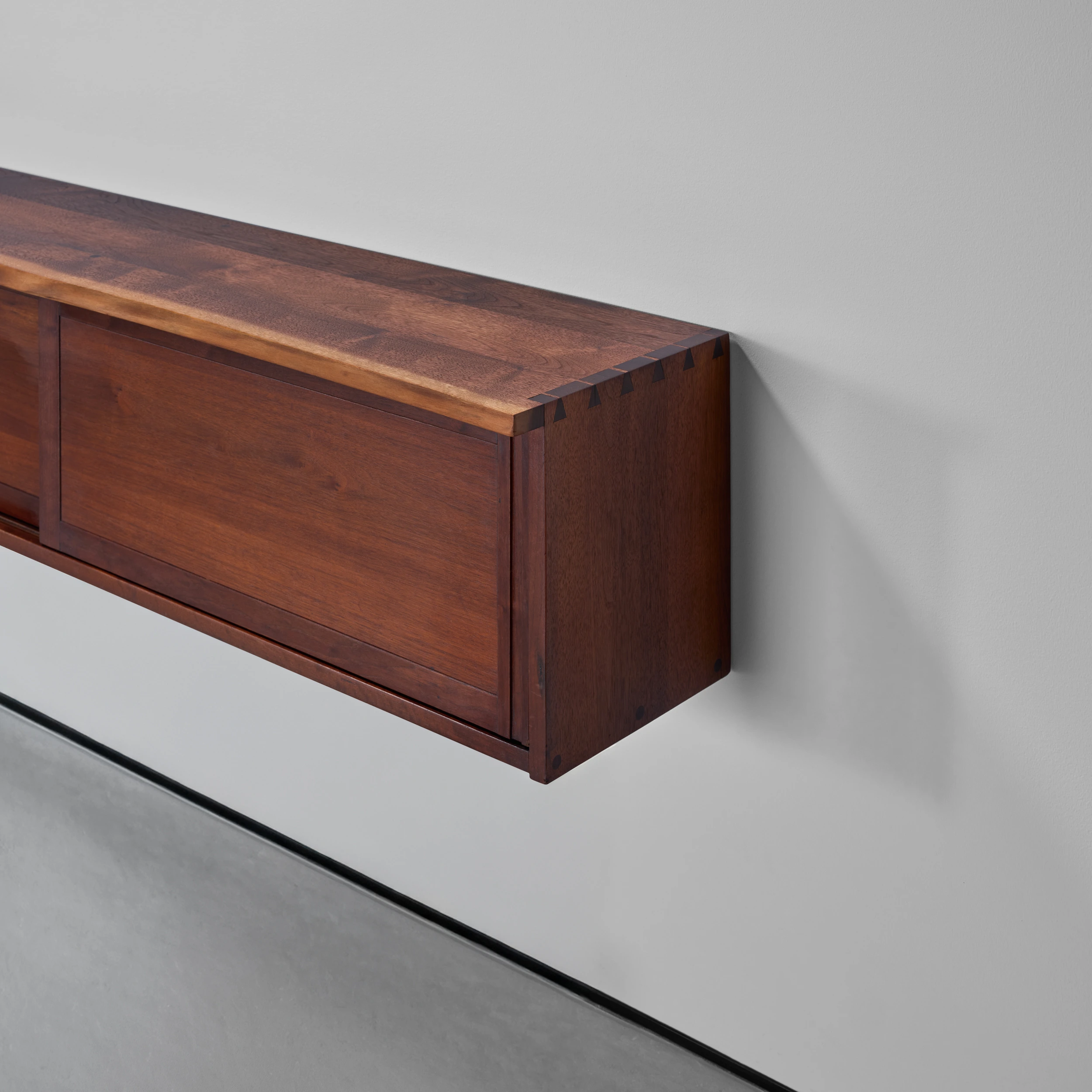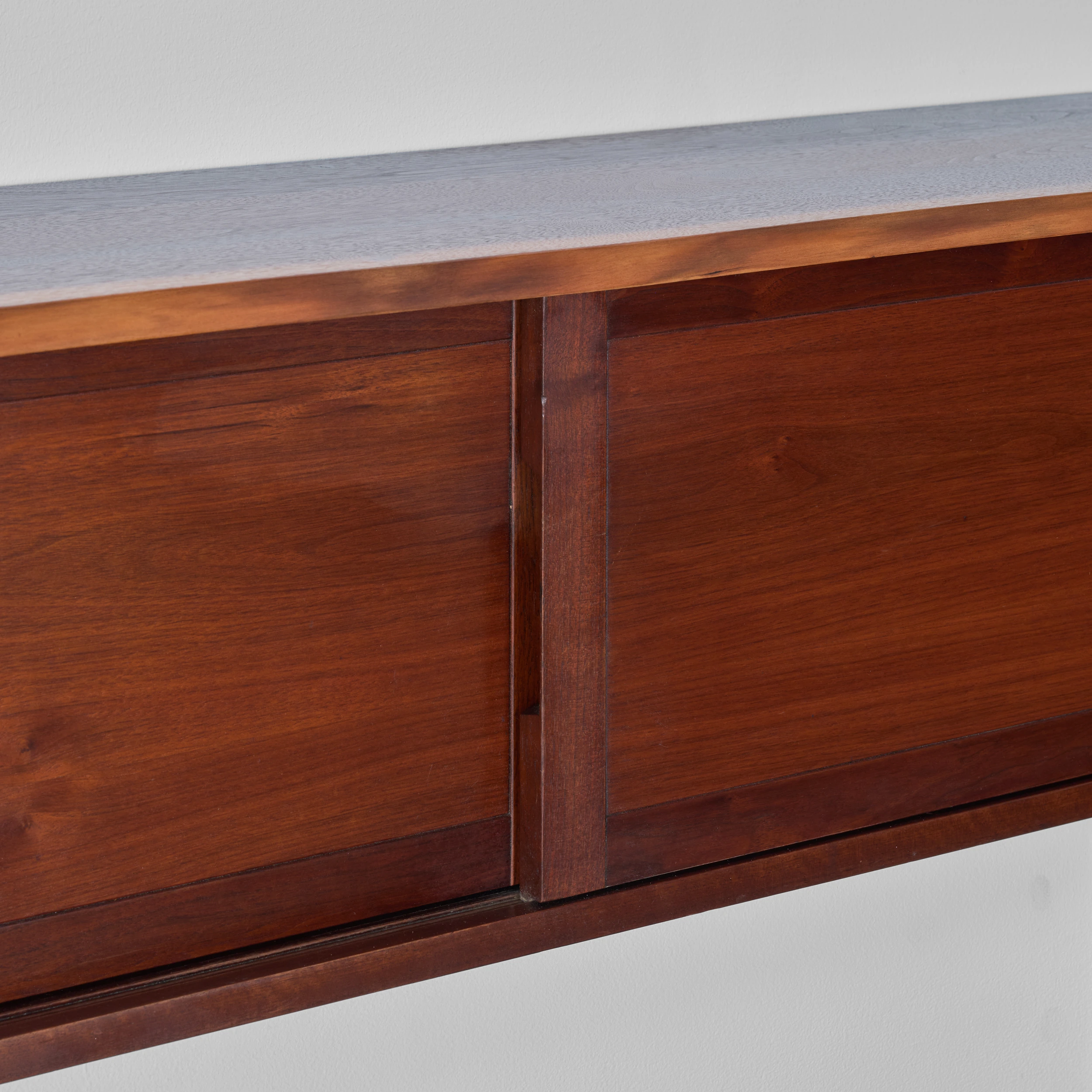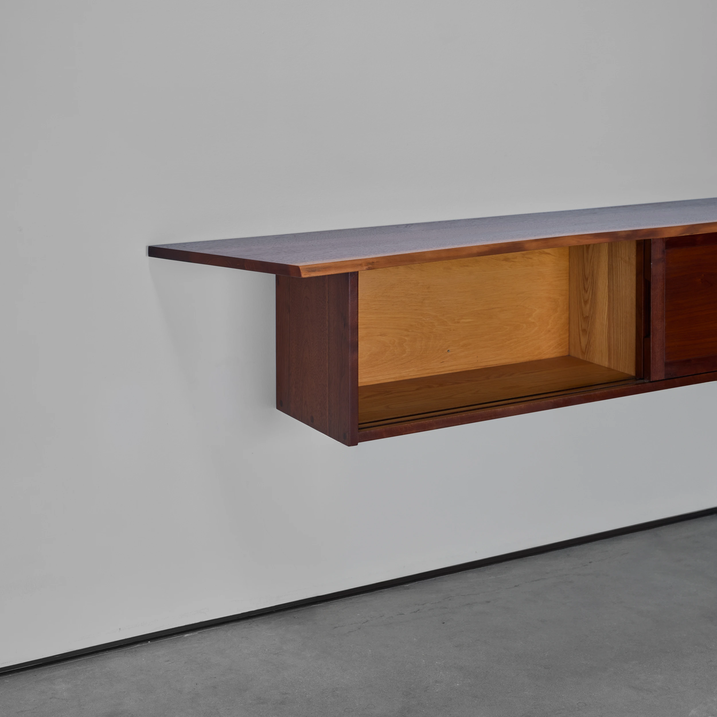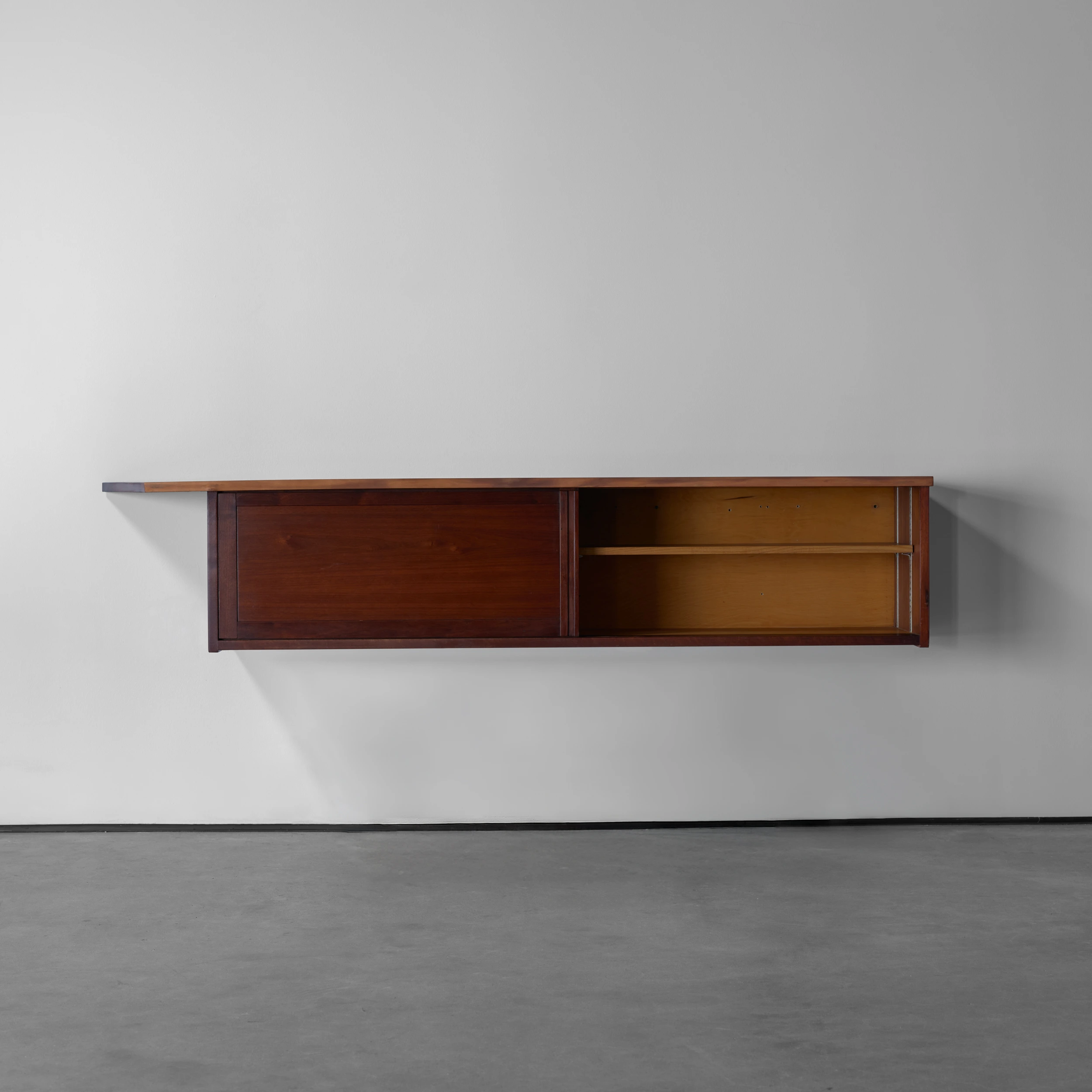 A Double Sliding Door Wall-Hung Cabinet by George Nakashima dating to 1964, featuring two solid sliding doors, a front free edge, and a left angled overhang.