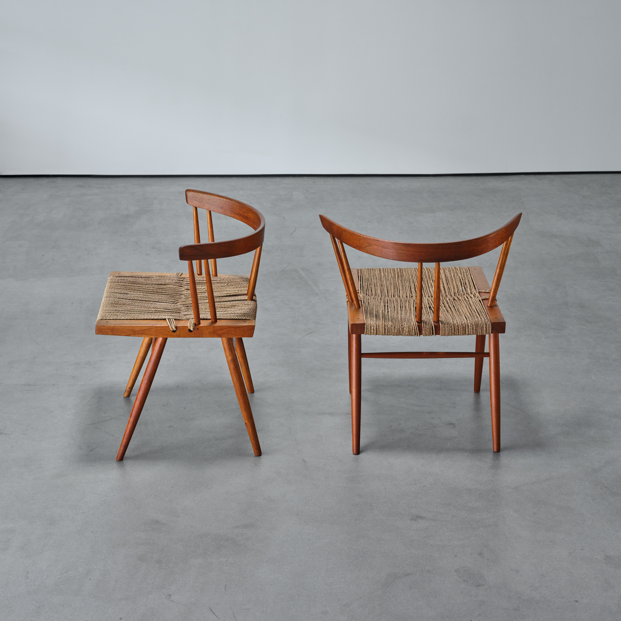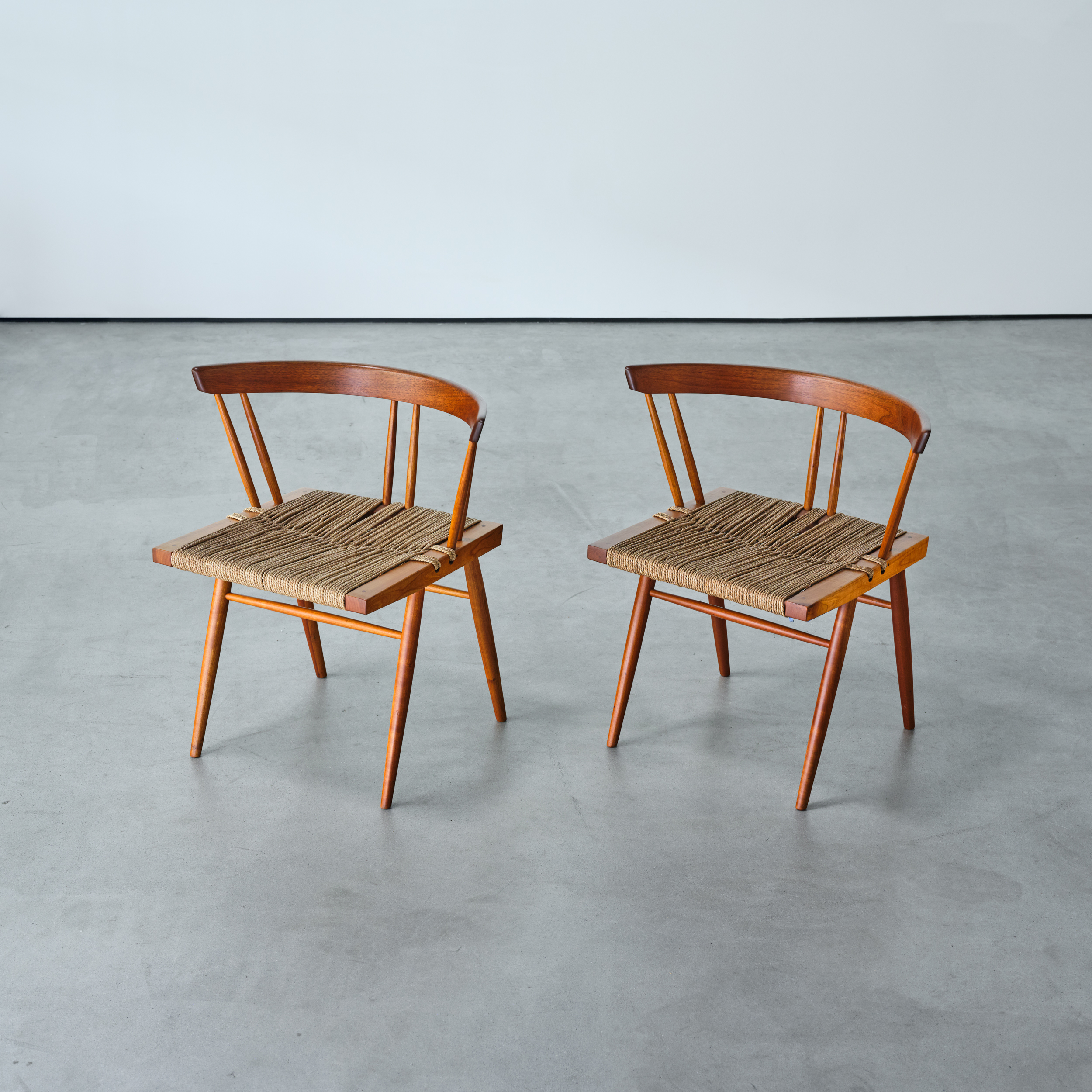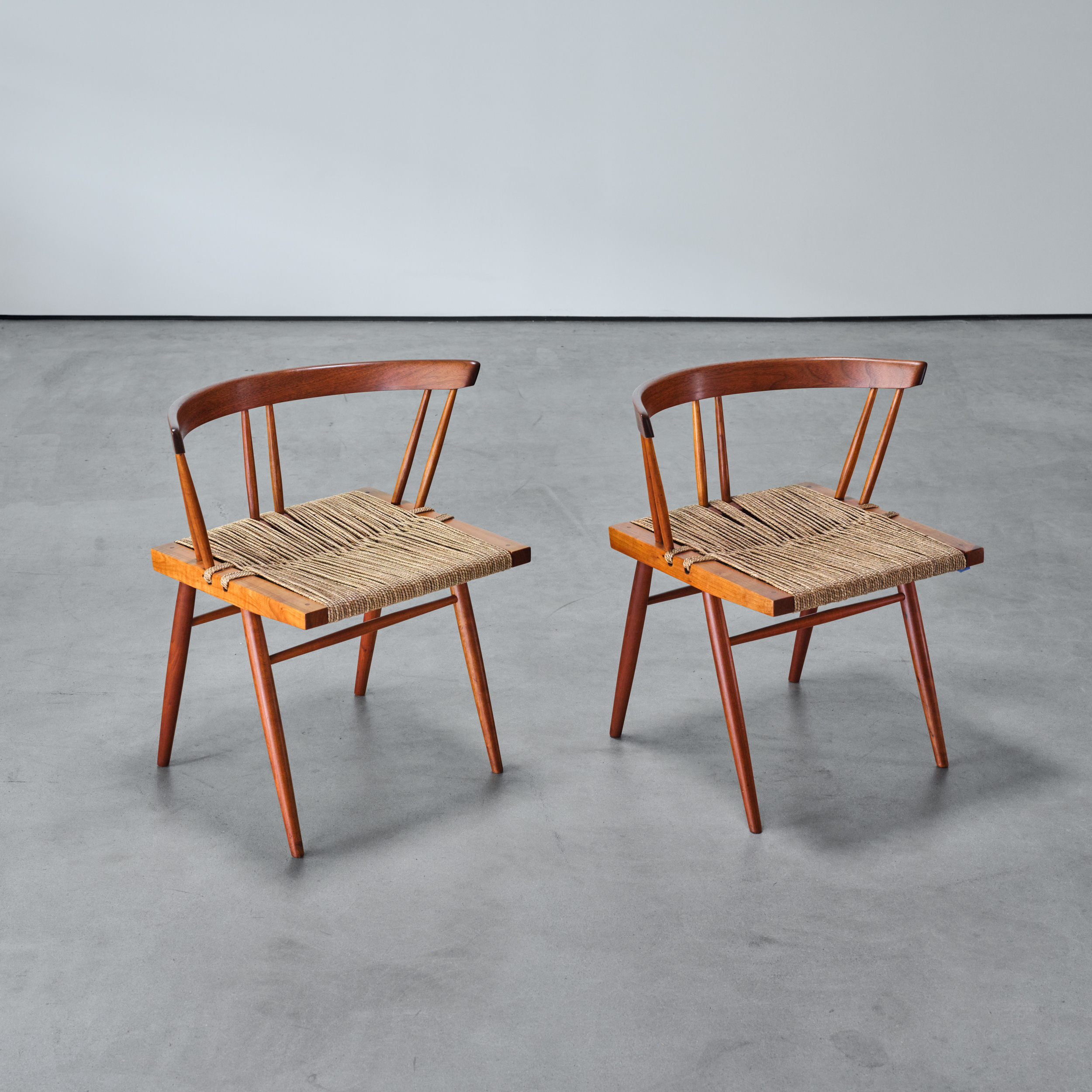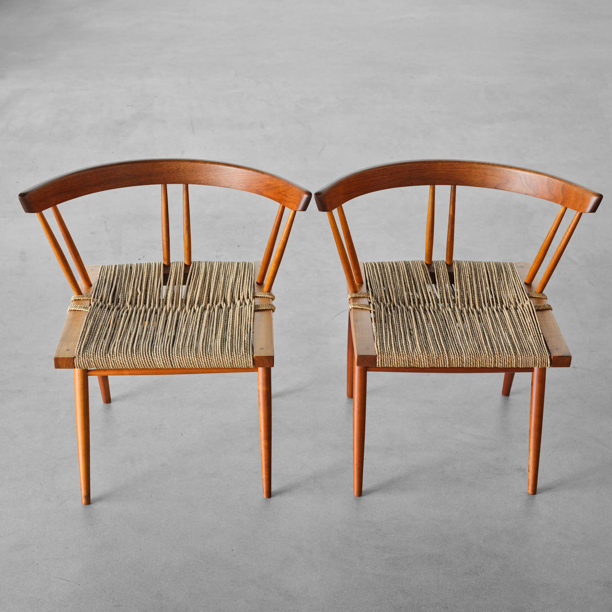 A pair of George Nakashima’s iconic Grass Seated Chairs – an early George Nakashima design which incorporates numerous Nakashima design signatures such as exposed joinery utilized simultaneously in a structural and decorative application as well as the honest use of natural materials, in this case, Cherry, American Black Walnut and twisted sea-grass.
