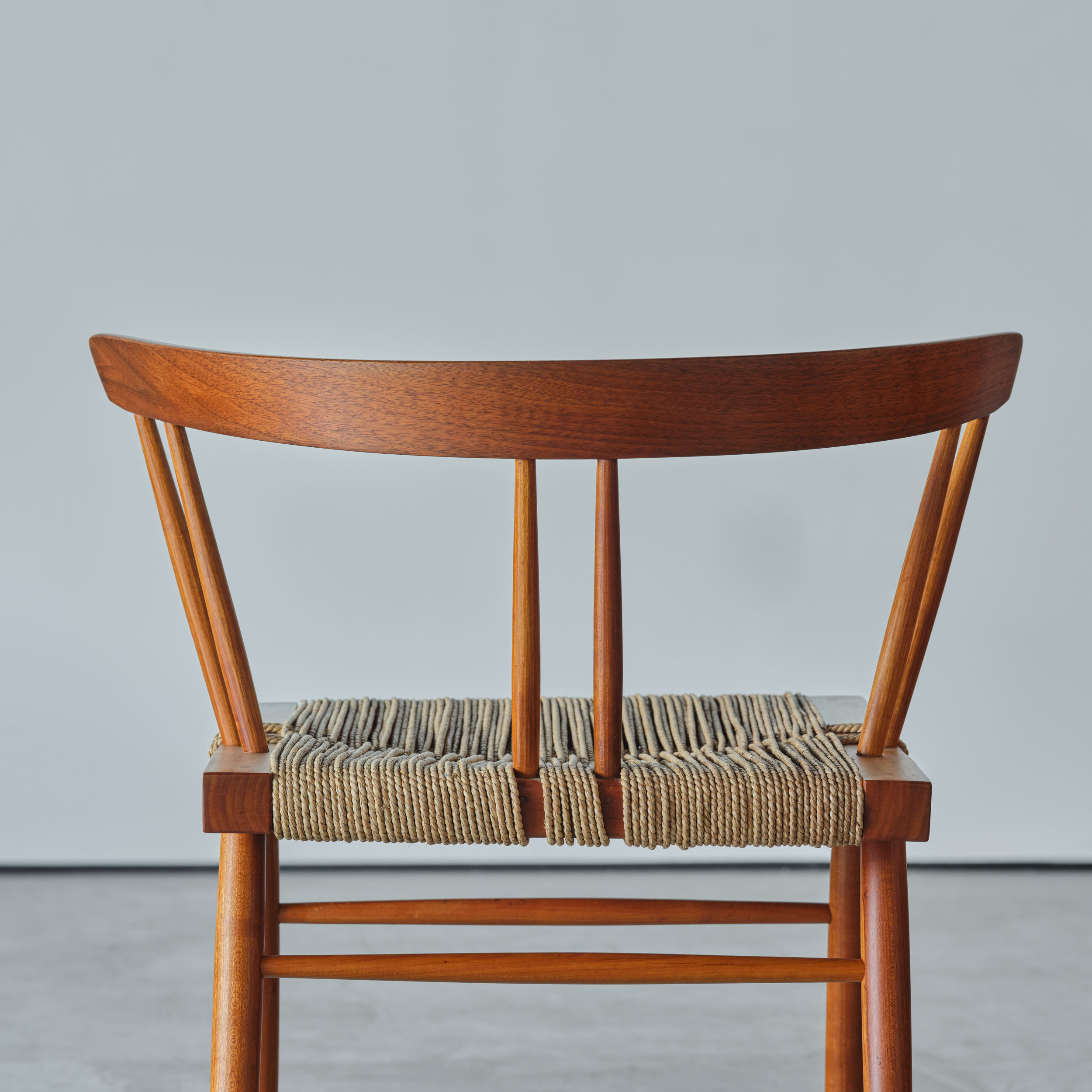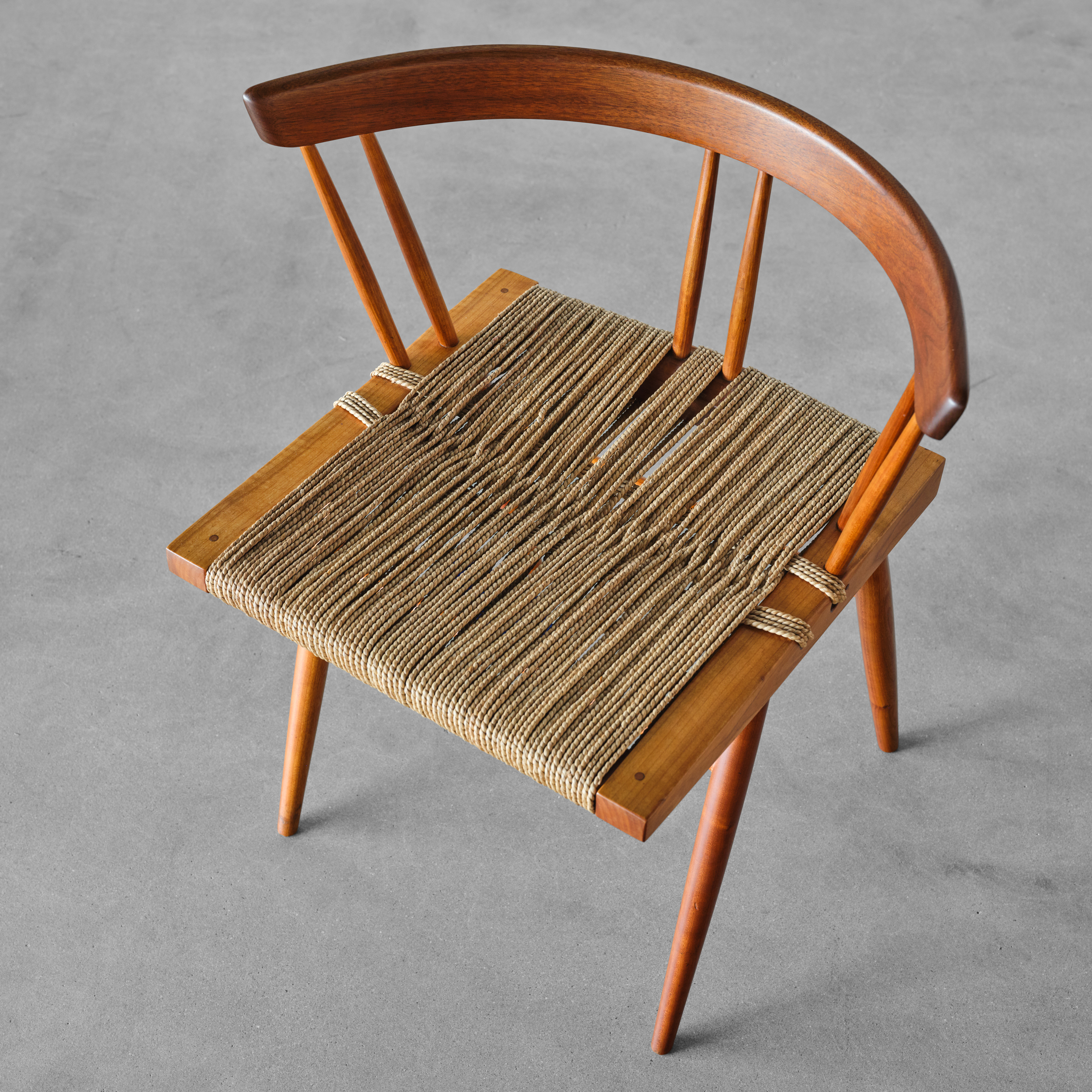 In terms of design, the Grass-Seated Chair owes considerably less to the Windsor chair that do other Nakashima designs. The Conoid chairs, the New Chair, and the Armchair all employ a solid plank seat similar to the Windsor design. The use of resilient twisted sea grass in the stool and chair contrast not only with Nakashima’s own designs but also with the molded plywood seats of the shell aesthetic that dominated mass-produced progressive design in the postwar period. The curved crest rail of the Grass-Seated Chair, still steamed and bent, is another vestige of Nakashima’s persistent hand-craftsmanship” (‘George Nakashima Full Circle’, Derek E. Ostergard, 1989, p.138).