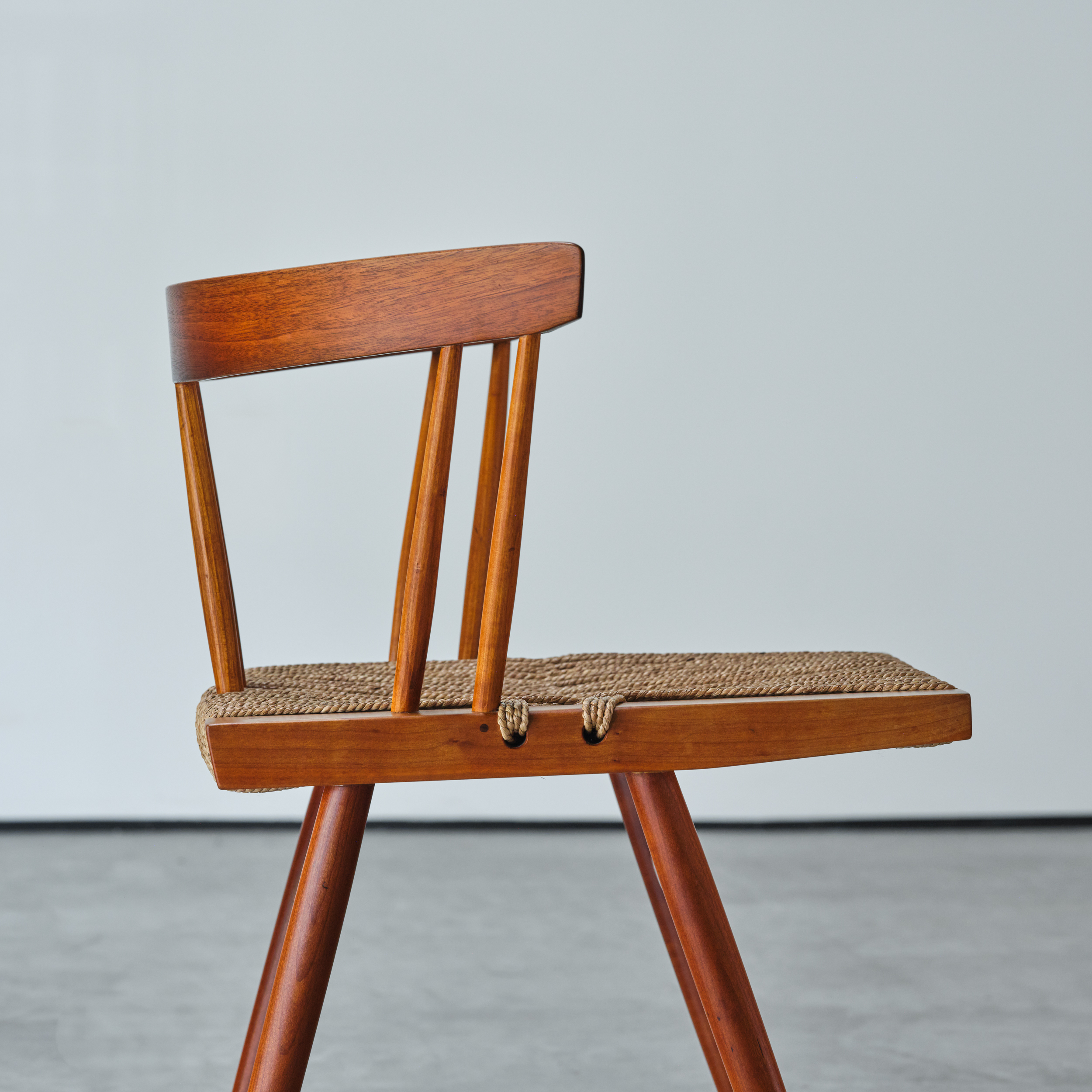 Nakashima’s use of revealed joinery was prompted in part by a strong philosophical need to reiterate structure. Like earlier Arts and Crafts designers, he was expressing displeasure with the sate of the design and manufacture of contemporary furniture. Nakashima’s pride in painstaking, but often technically unnecessary, joinery constitutes a strong element of his aesthetic. The use of dowels on the Grass-Seated Chair and Grass-Seated Stool is considerably more extravagant than on Nakashima’s other seating pieces. Dowels are used to secure the mortise-and-tenon joints at the junction of the rails and to reinforce the intersection of spindles and rails. They were not used in later seating designs.