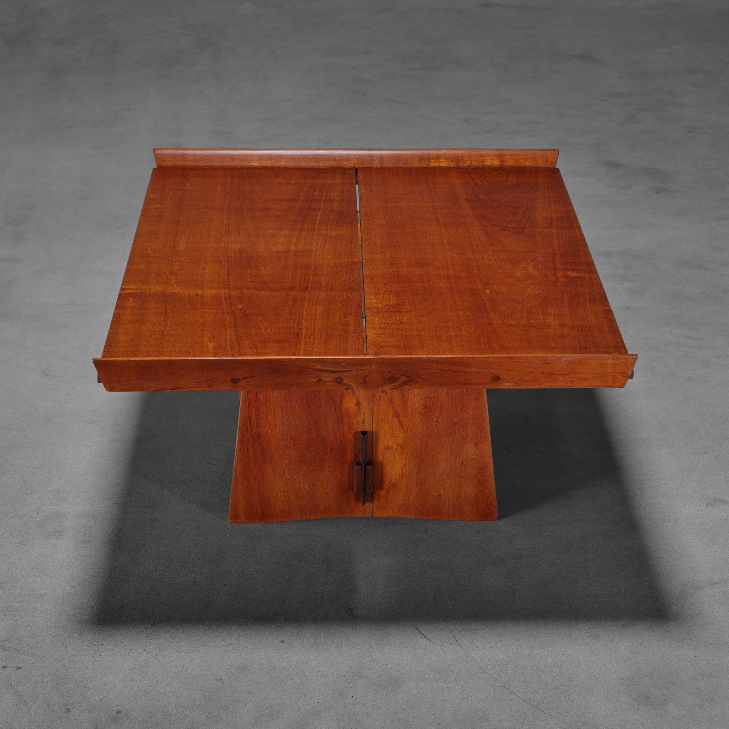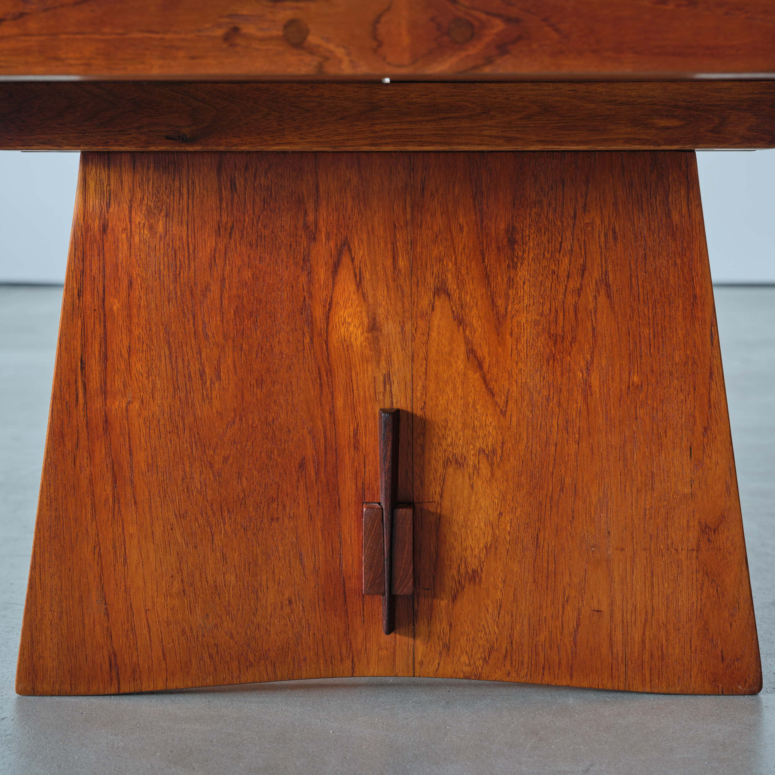 For the top of this table, Nakashima used wood that he had left in Seattle for safekeeping with the painter Morris Graves. Graves shipped the precious teak to the Nakashimas once they had resettled in New Hope. The southern cypress used for the base was a rather common wood in the furniture-making trade, fairly easy to obtain even during the war years.