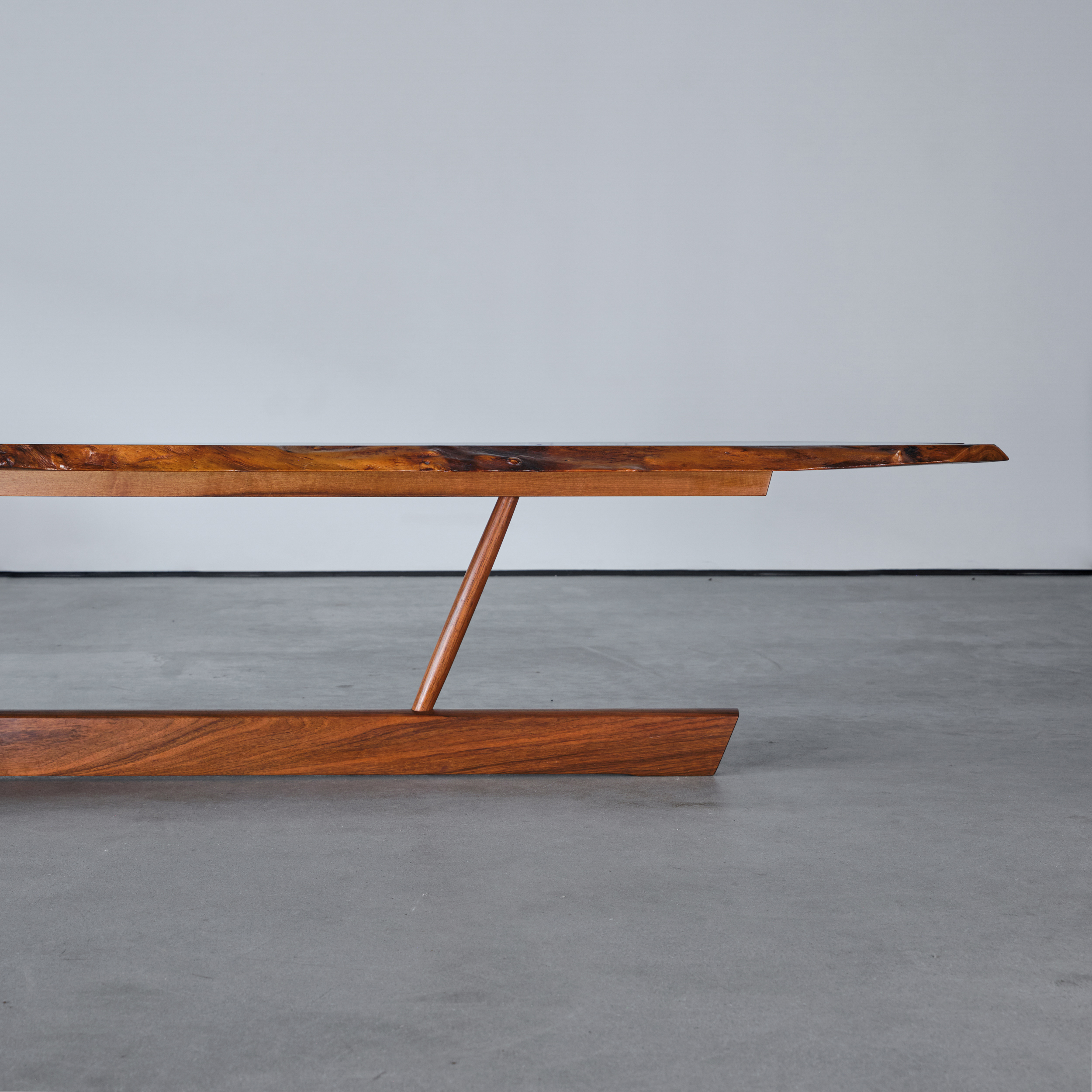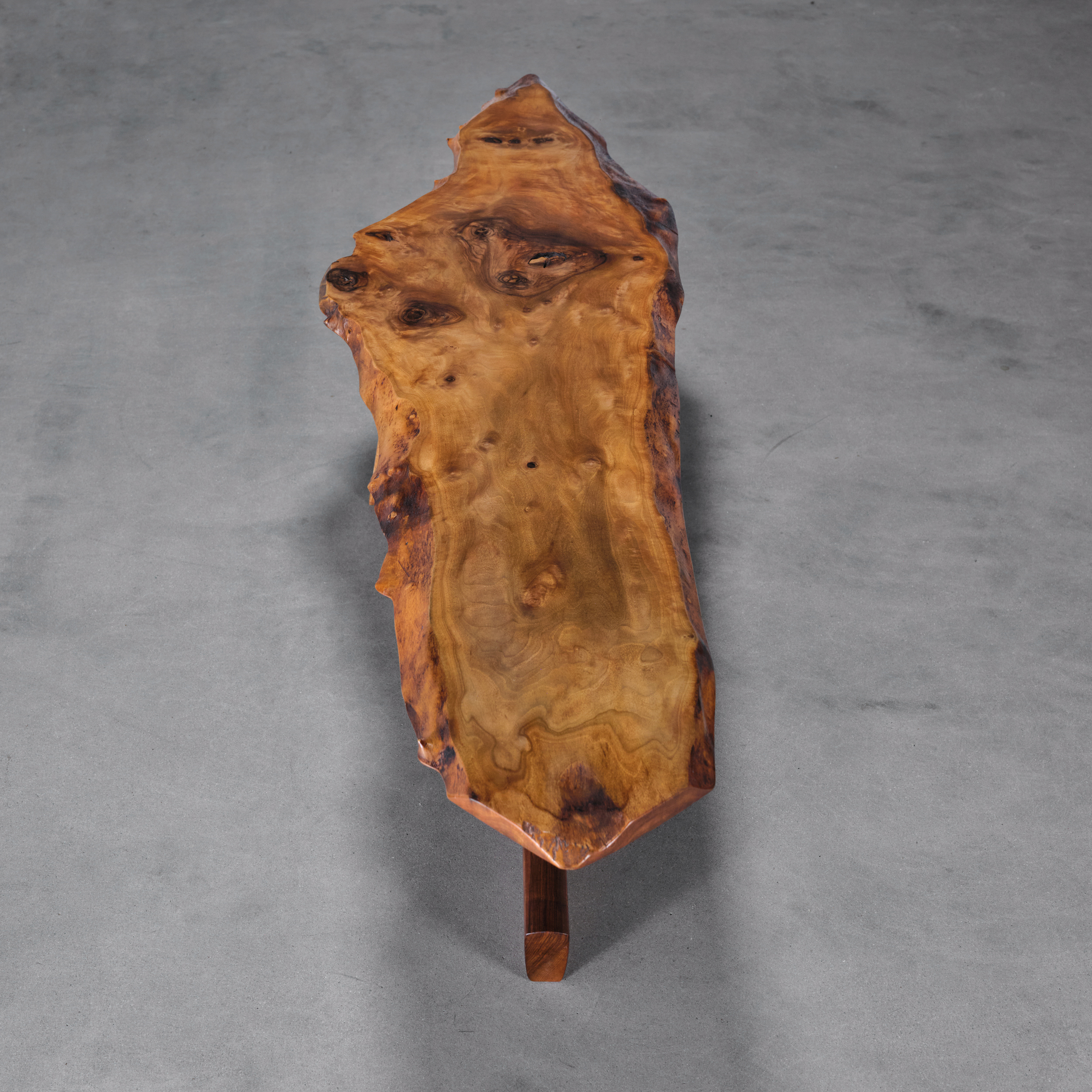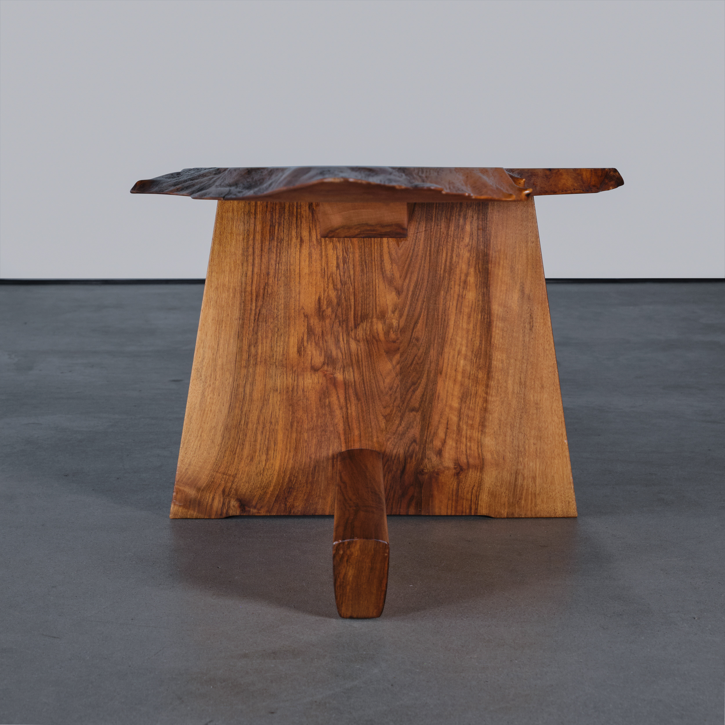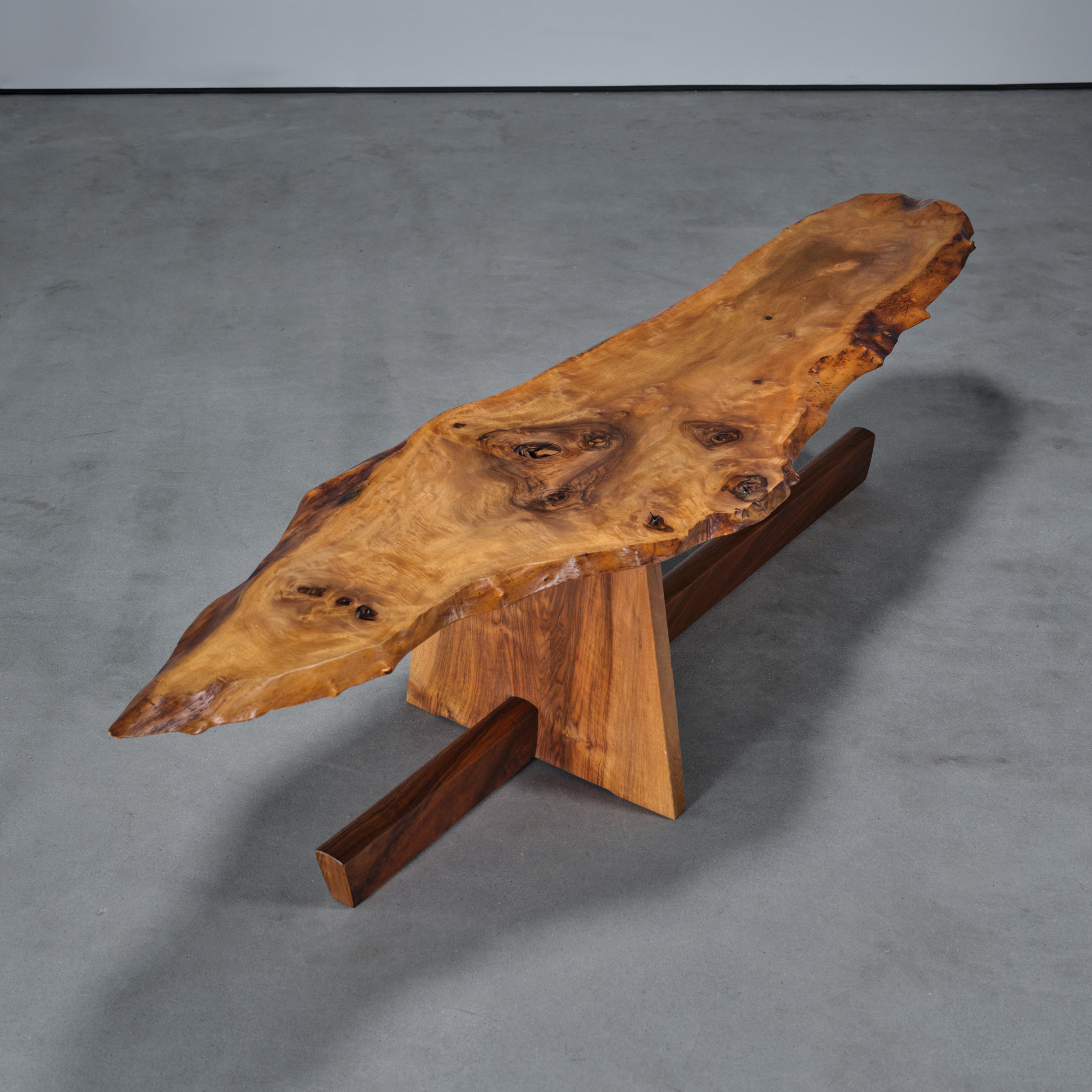 An exceptional example of a Minguren II Coffee Table by George Nakashima featuring a highly unique, single English Walnut slab atop the dynamic, architectural Minguren II base.