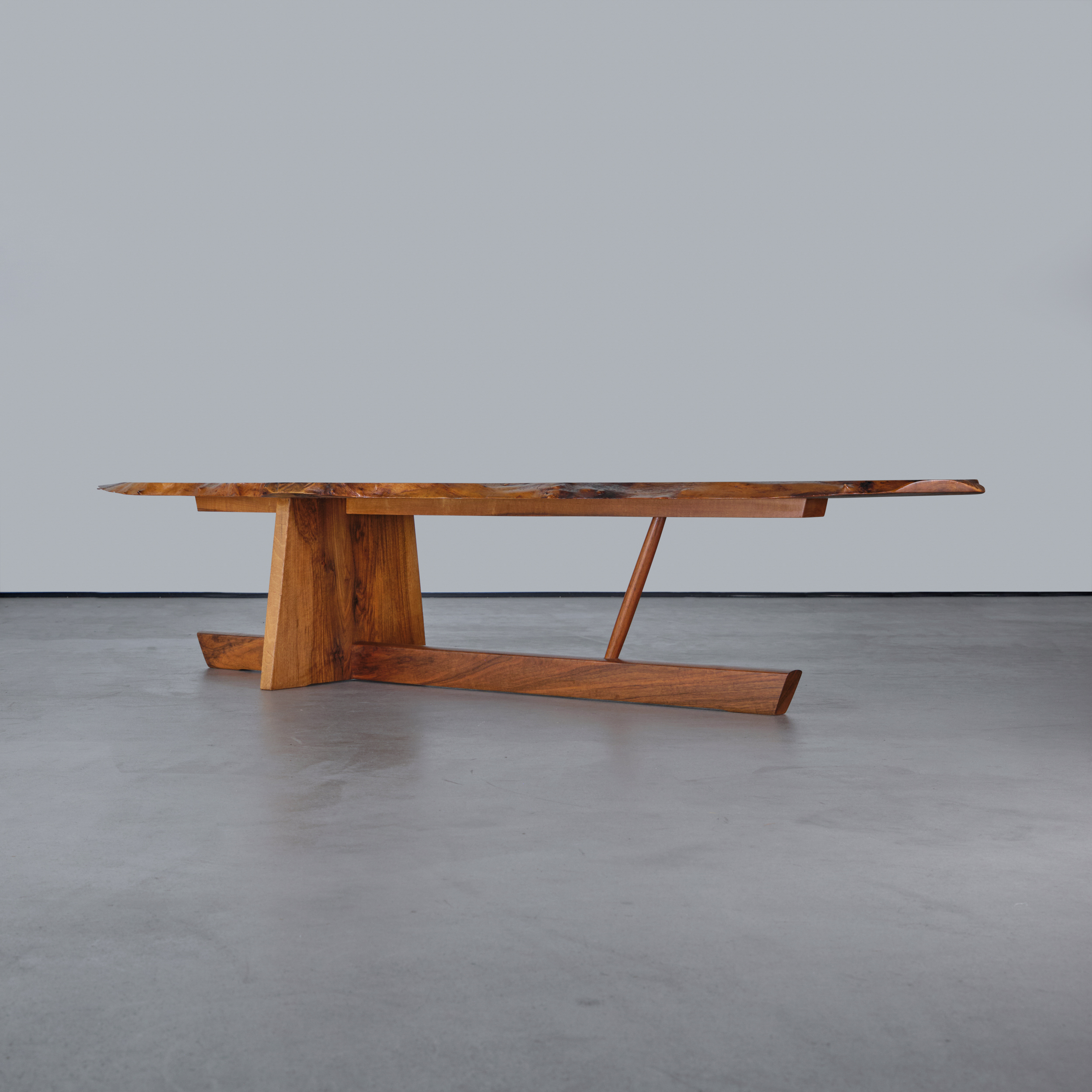 “By the 1960s Nakashima was becoming increasingly interested in the play between vertical and horizontal planes, as seen in the intersection of the Minguren II End Table’s top and the back element. Cantilevering, which had been part of his chair design since the 1961 catalogue, was added to table designs several years later. Nakashima emphasized the cantilevered element in the Minguren II table by executing it in a richly organic free edge.