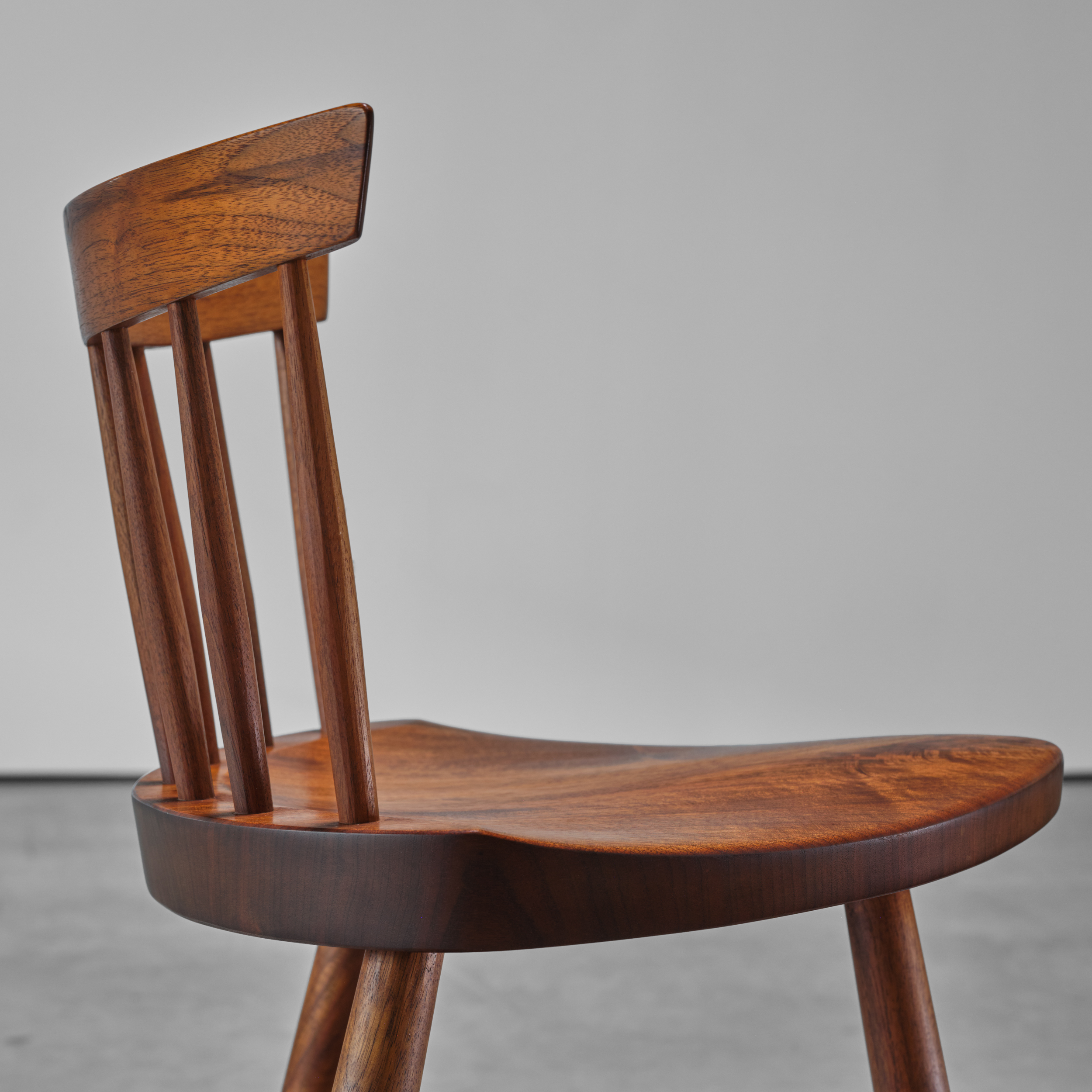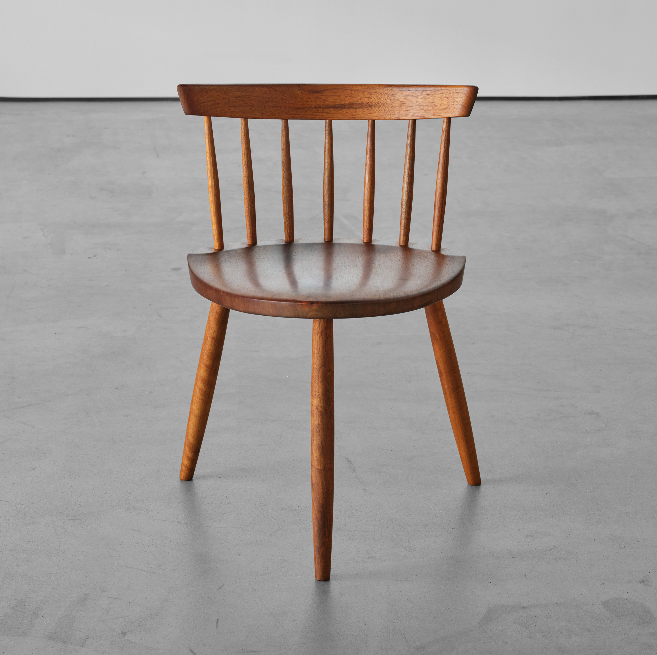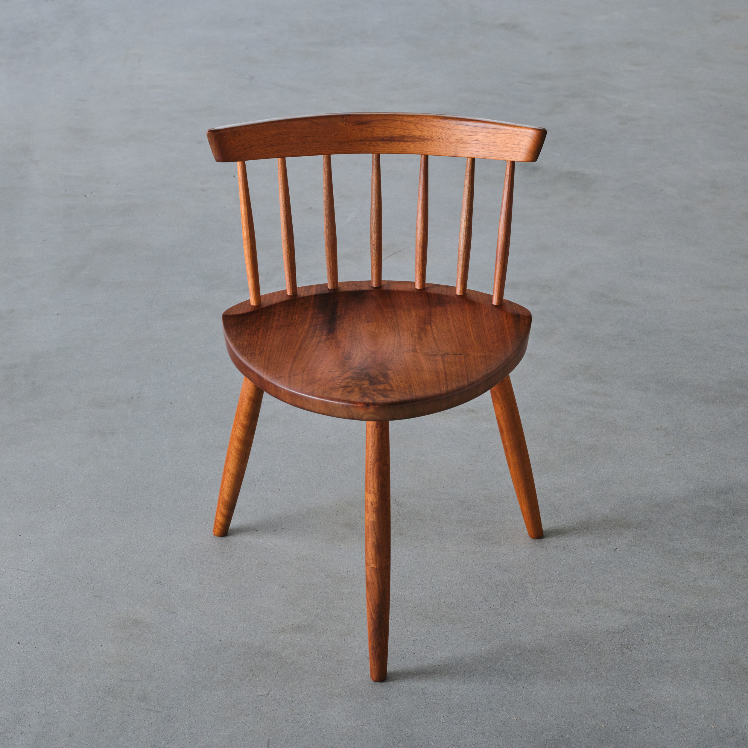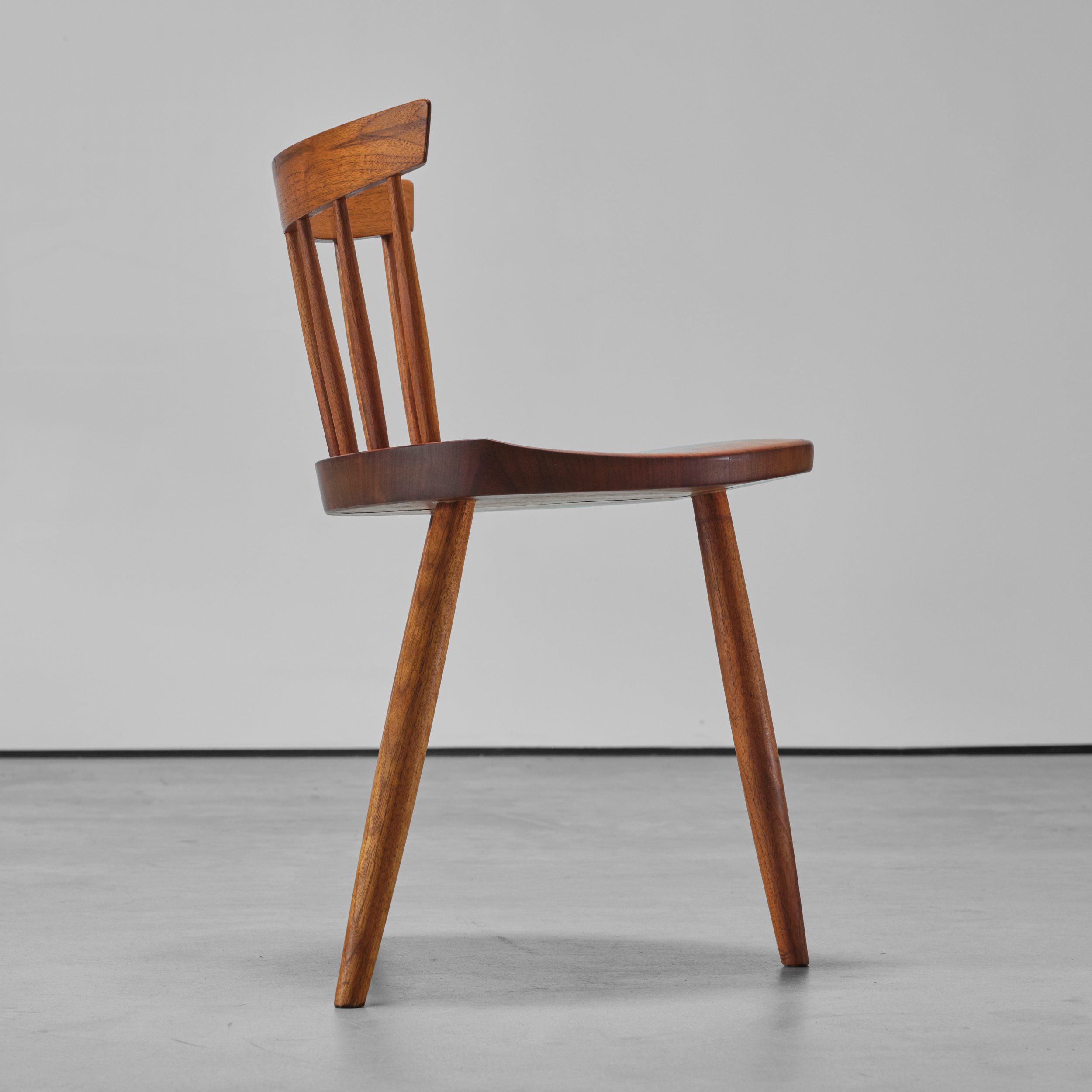 As do other early Nakashima designs, the Mira chairs reflect the profound influence that the vernacular form of the Windsor chair had upon his work. He revered that type of generic seating in which the maker used time and materials most efficiently. In addition, the Windsor chair did not depend upon sophisticated woodworking skills, and even today their makers are often anonymous. In Nakashima’s own seating pieces, such as the Straight-Backed Chair, Armchair, and New Chair, he recognized and drew from these qualities. The Mira Chair is a direct descendant of this interest and is the most original of such Nakashima designs. The amoebalike shape of its seat and its three-legged stance are not found in his other chairs. Both elements were part of the progressive form language of design from the 1930s until the 1950s. Hans Wegner, who produced a similar model in Denmark, may have known of Nakashima’s design, which was illustrated in a number of journals of the period” (‘George Nakashima Full Circle’, Derek E. Ostergard, 1989, p.148).