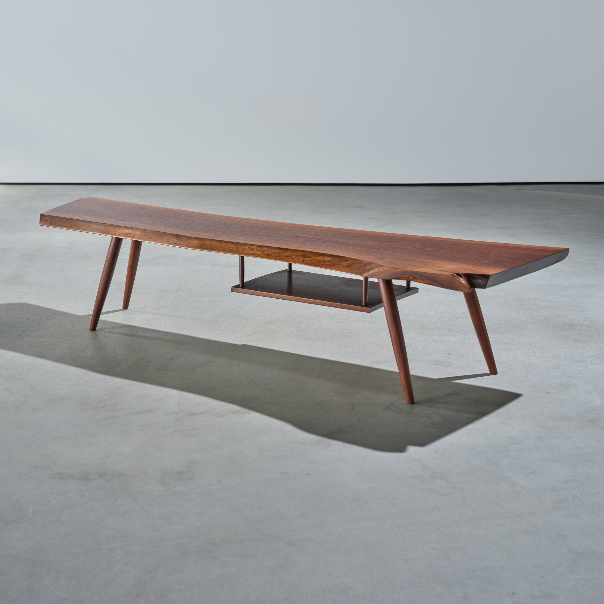 Originally designed c. 1950 to serve as a bench or coffee table the “P” bench/coffee table first appeared in Nakashima’s 1955 catalogue. It was titled as such when Nakashima simply used letters to refer to his designs. During a period when space saving designs were popular, It incorporates a book/magazine shelf under the top board.