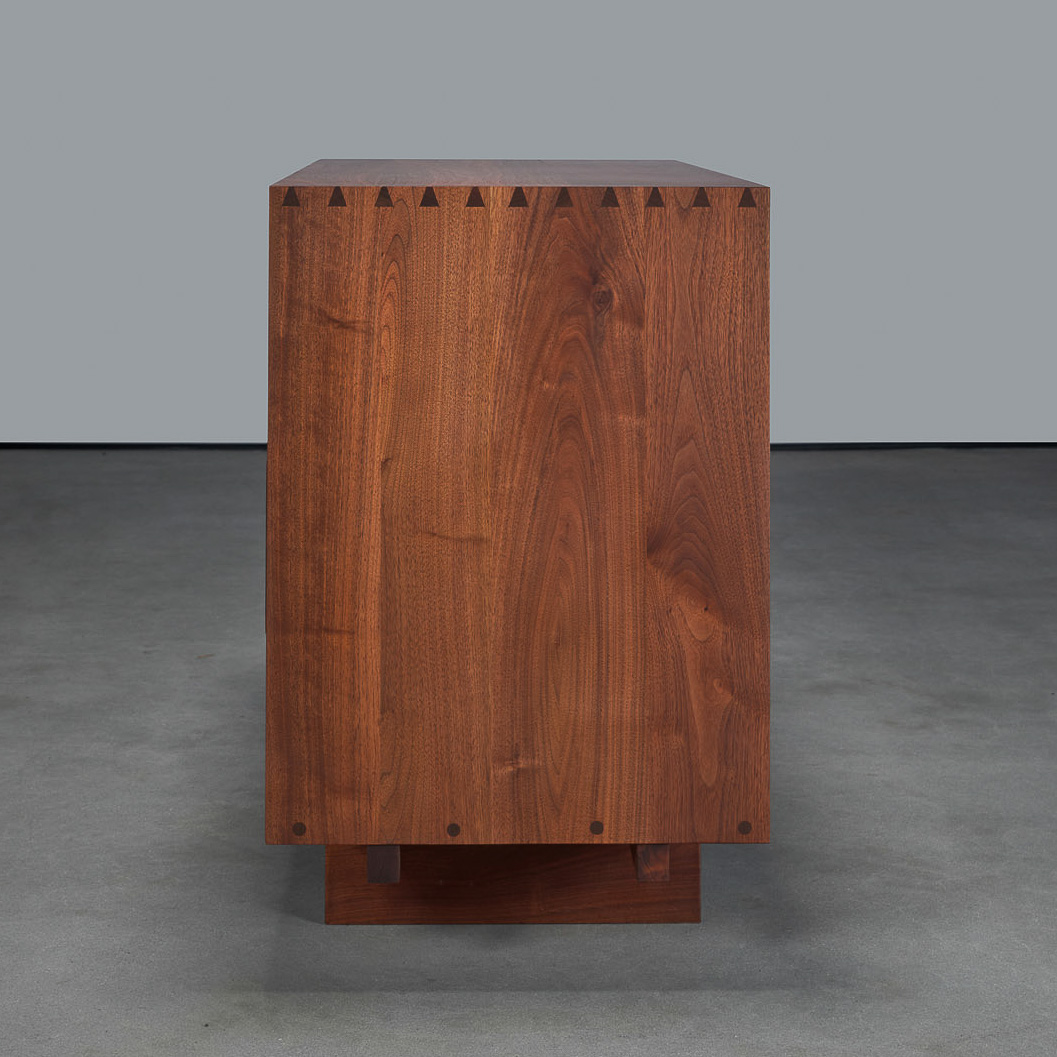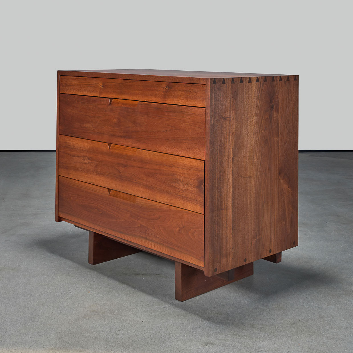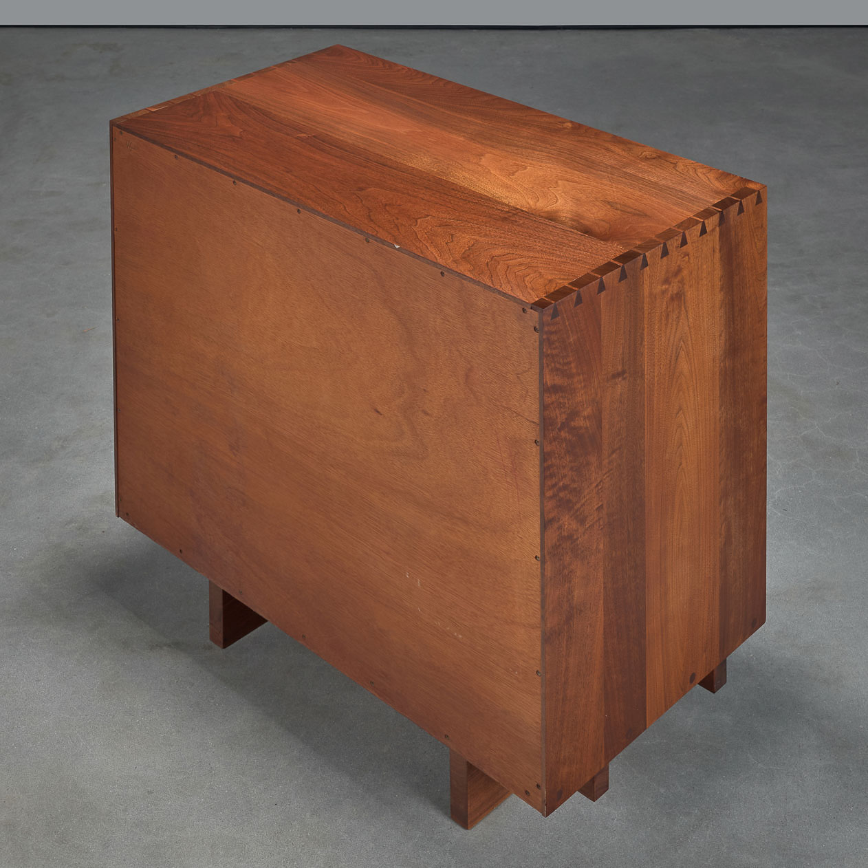 A pair of Single Chests of Drawers by George Nakashima crafted from American Black Walnut. The works feature Nakashima’s signature exposed, handworked dovetail joinery along the juncture of the top and sides of each chest.
