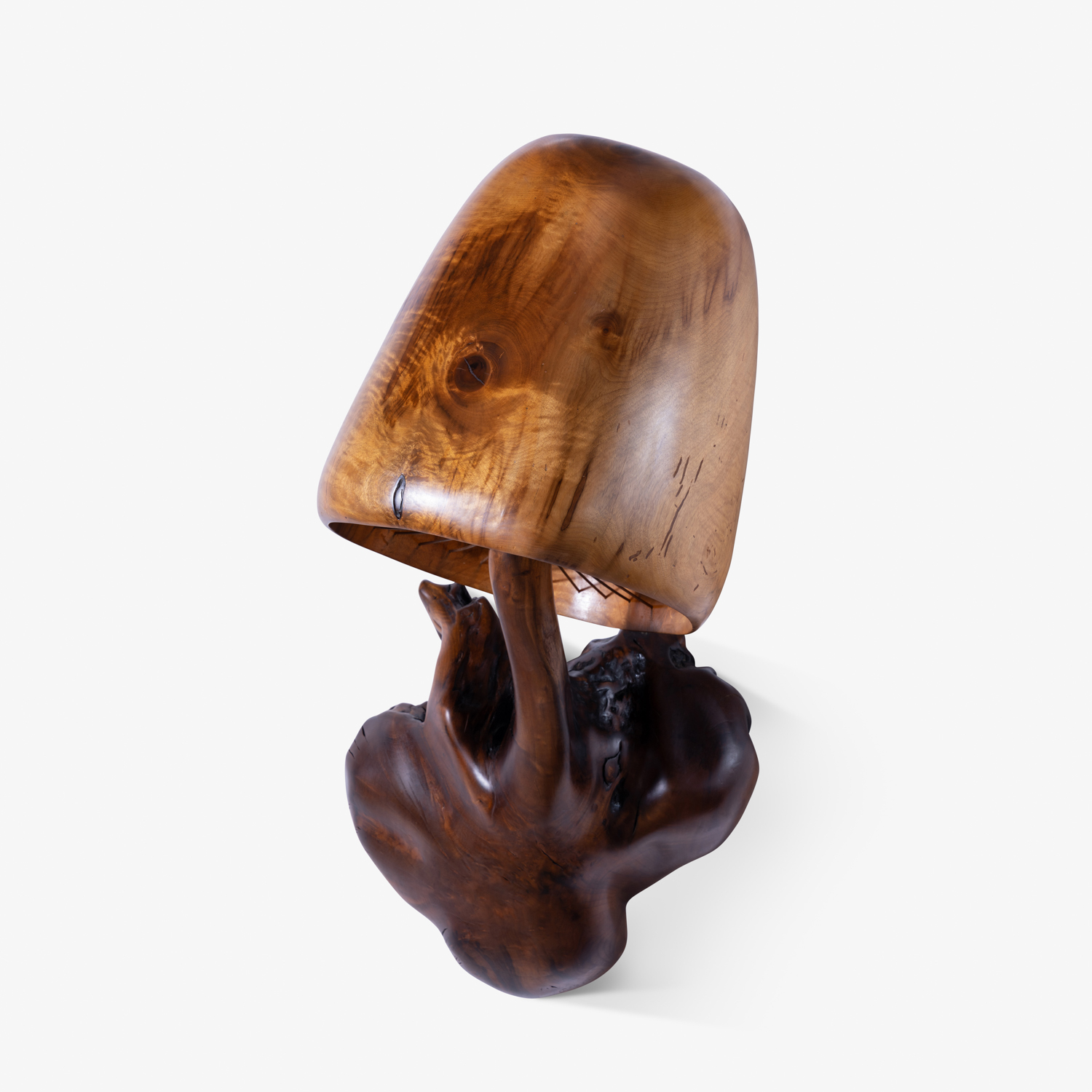With his expertly crafted works, Clausen creates an atmosphere of fantasy. Clausen’s mushroom lamps are among his signature pieces. Making use of a variety of regional woods, such as the Myrtlewood, for which the Bandon area is well known. His quest to find and salvage old tree trunks along Oregon’s coastline includes exploring forests, beaches, and rivers. Often submerged or buried, Clausen’s findings require the use of heavy machinery to move the massive lumber, which is then transports back to Clausen’s Riverton woodshop