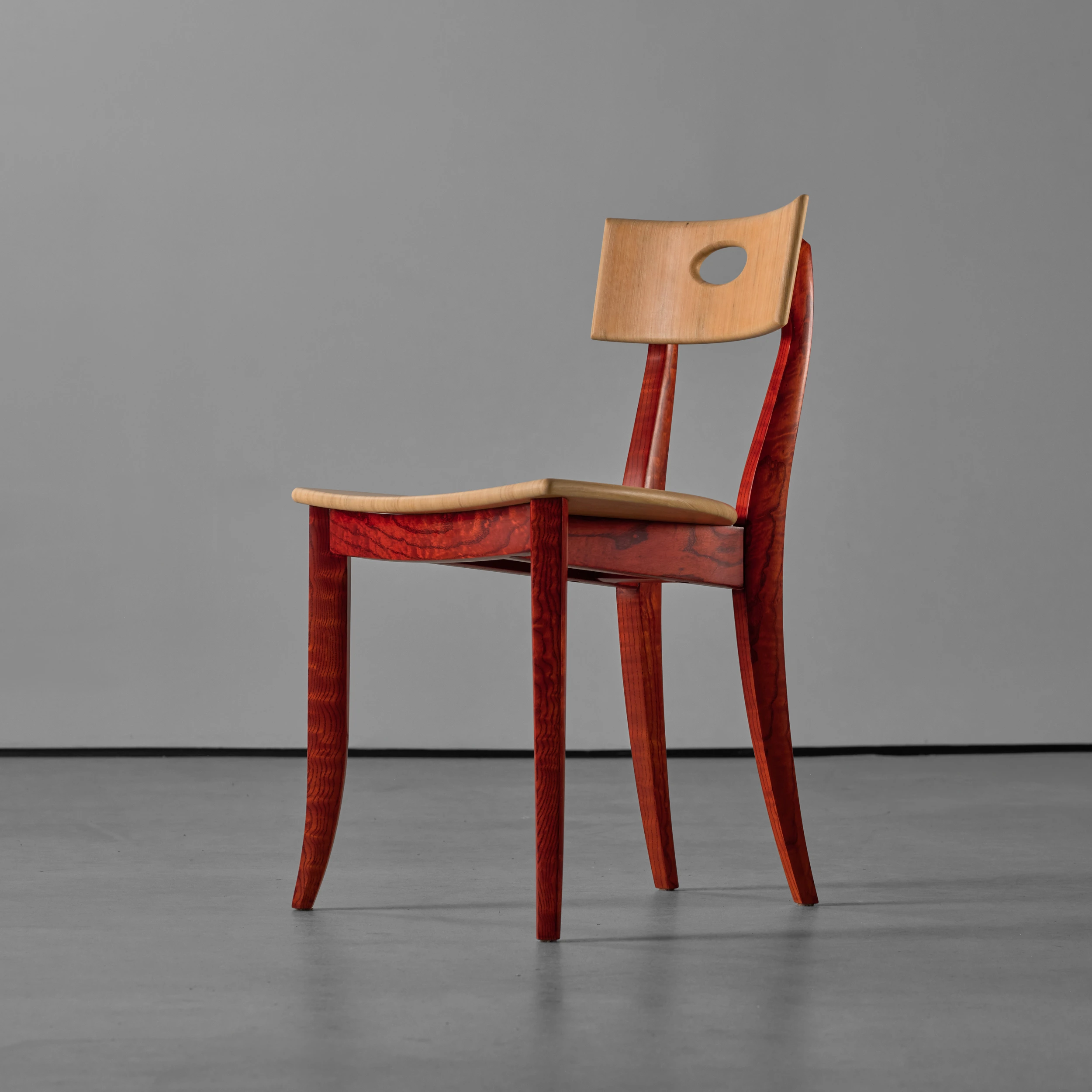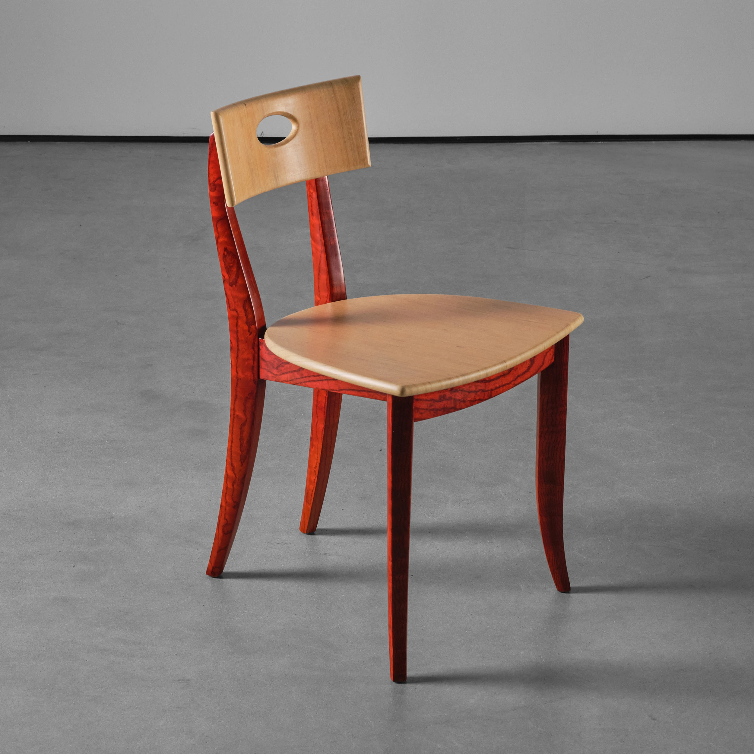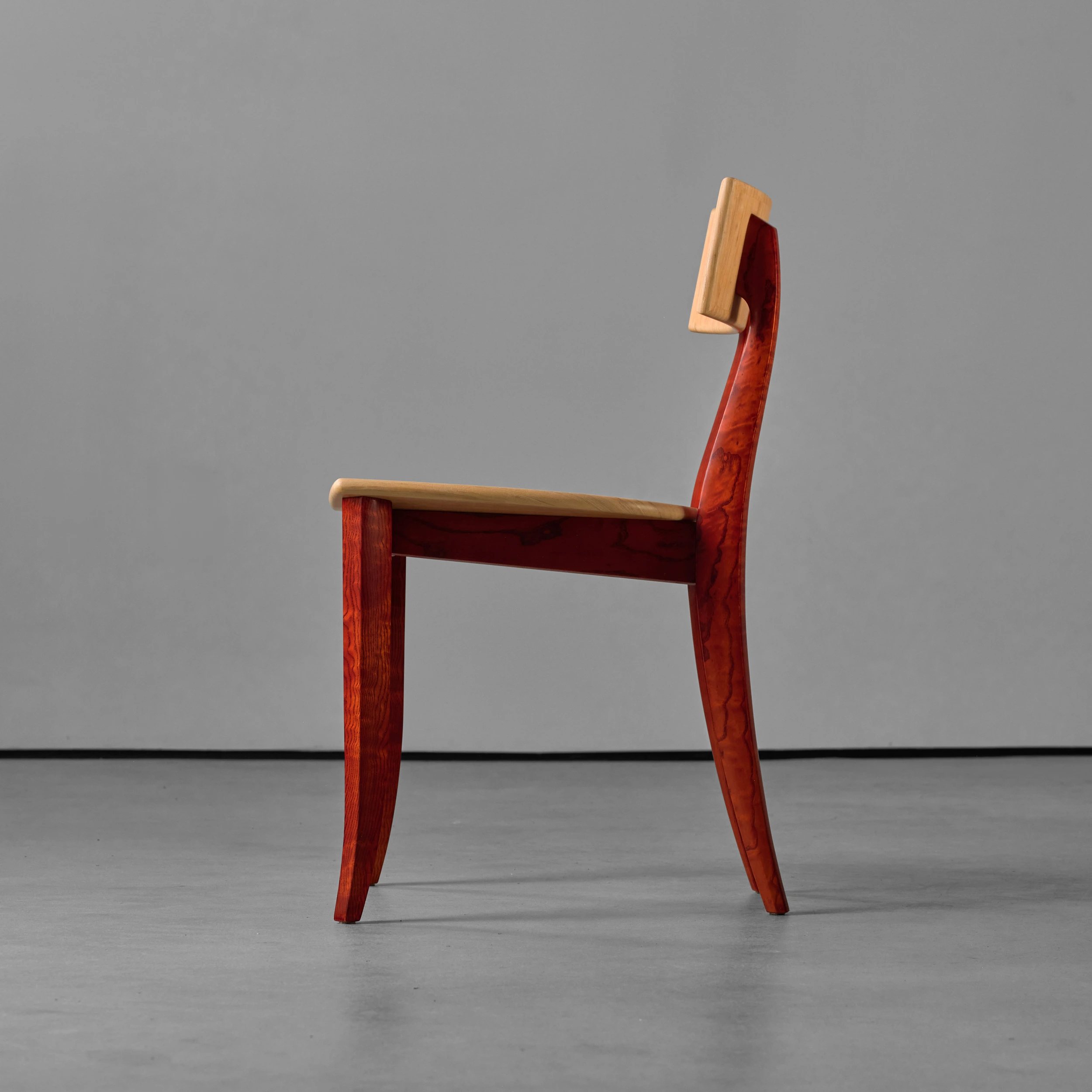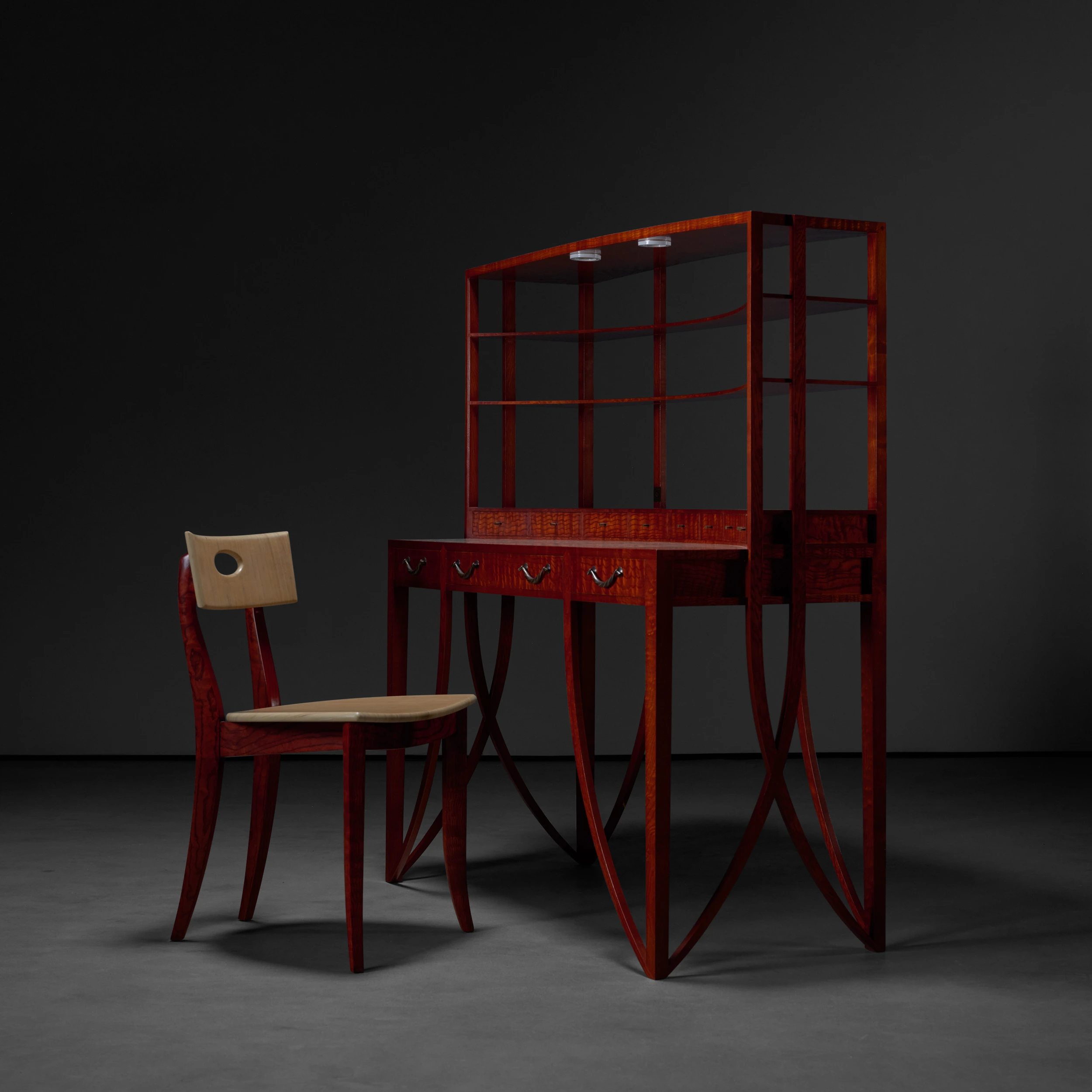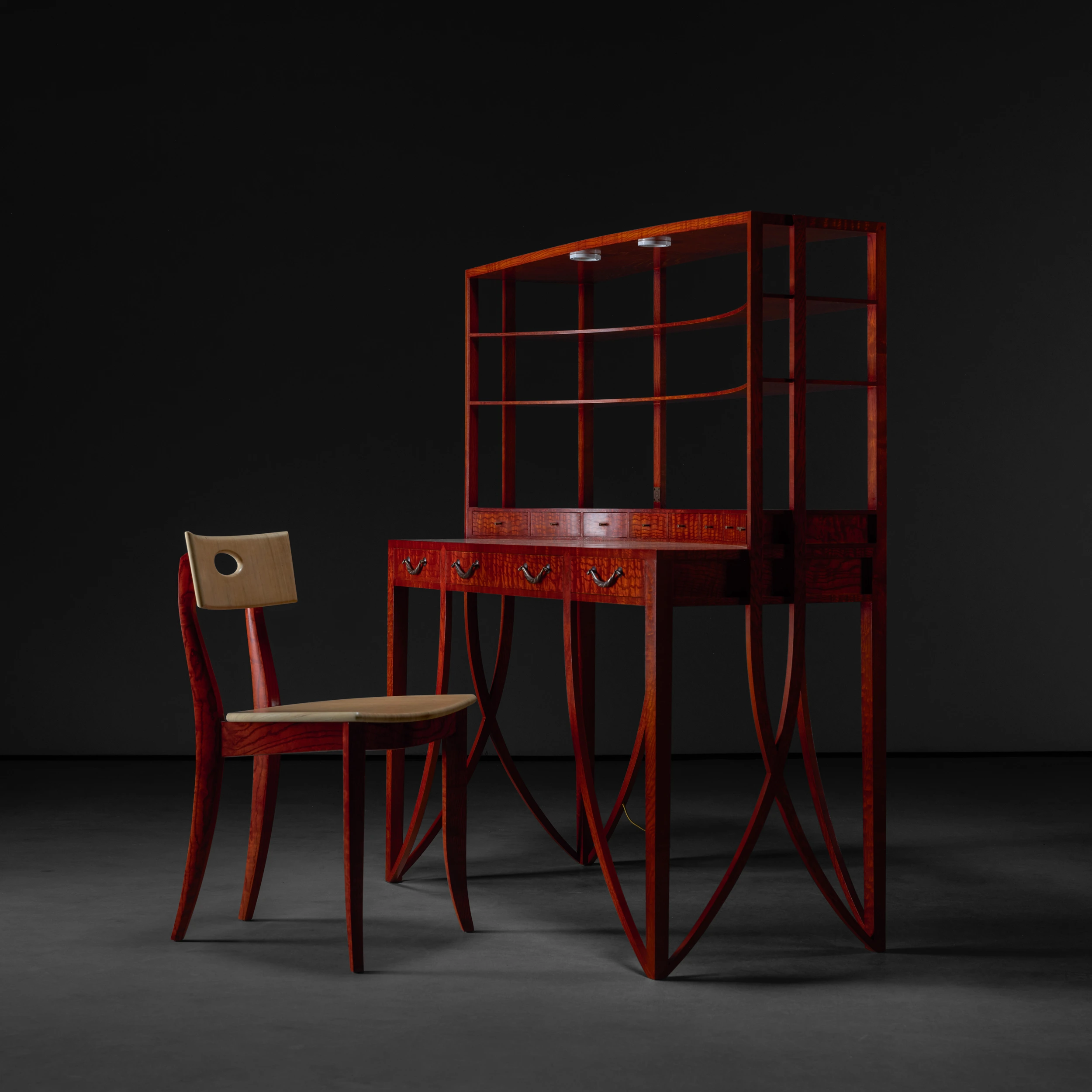 Paired with the desk is a matching chair made from highly figured curly ash with a seat and backrest made from formed raw Indian silk saturated with epoxy resin.