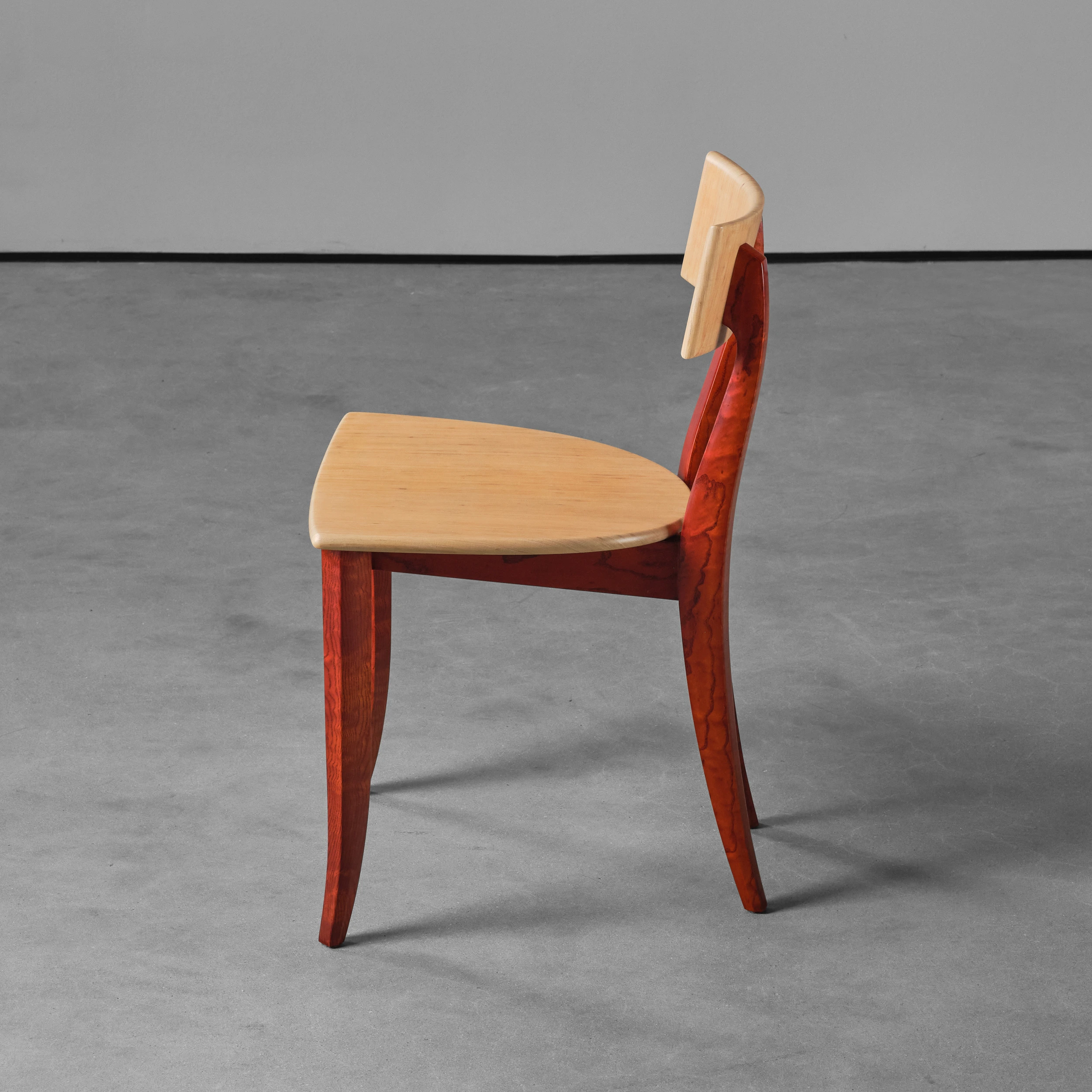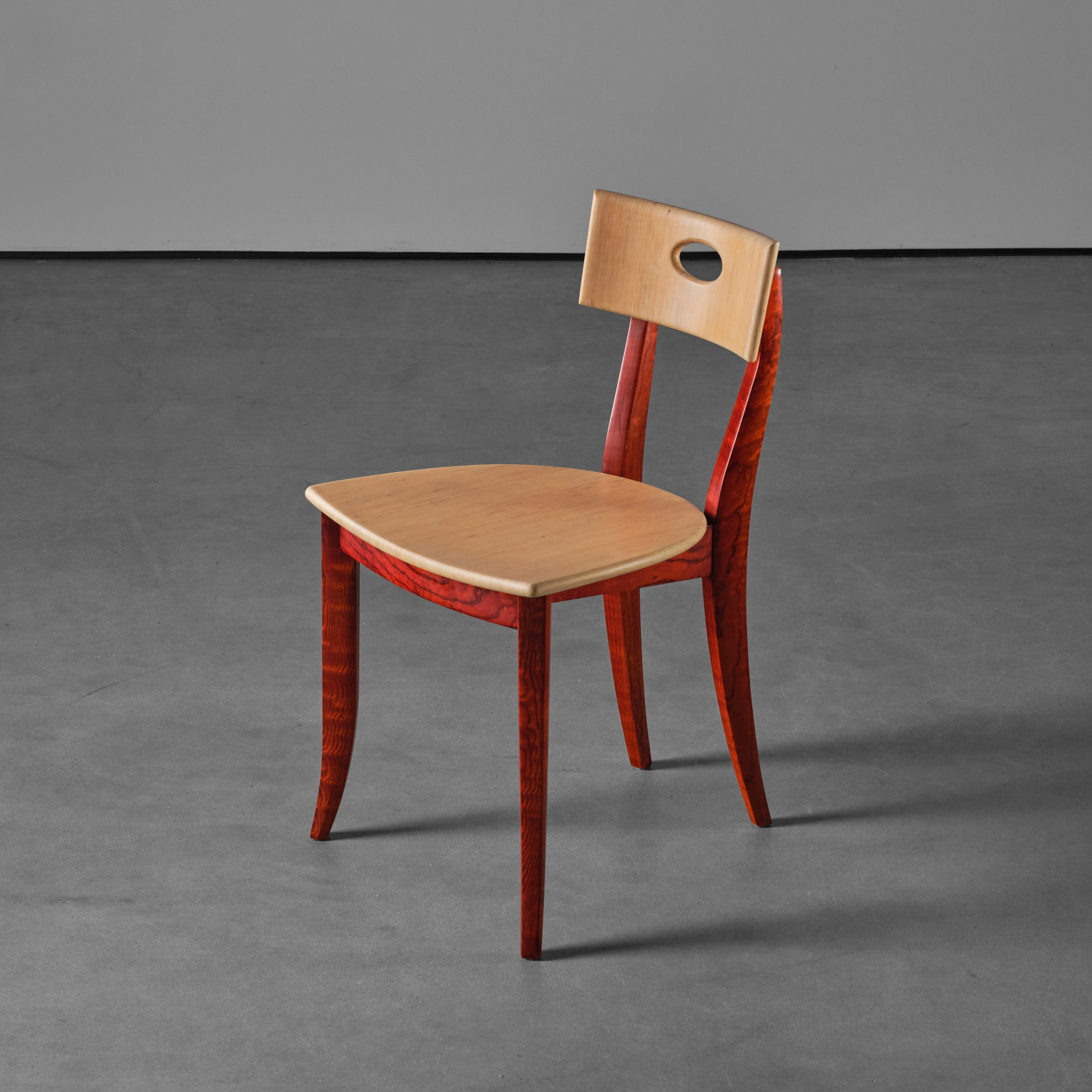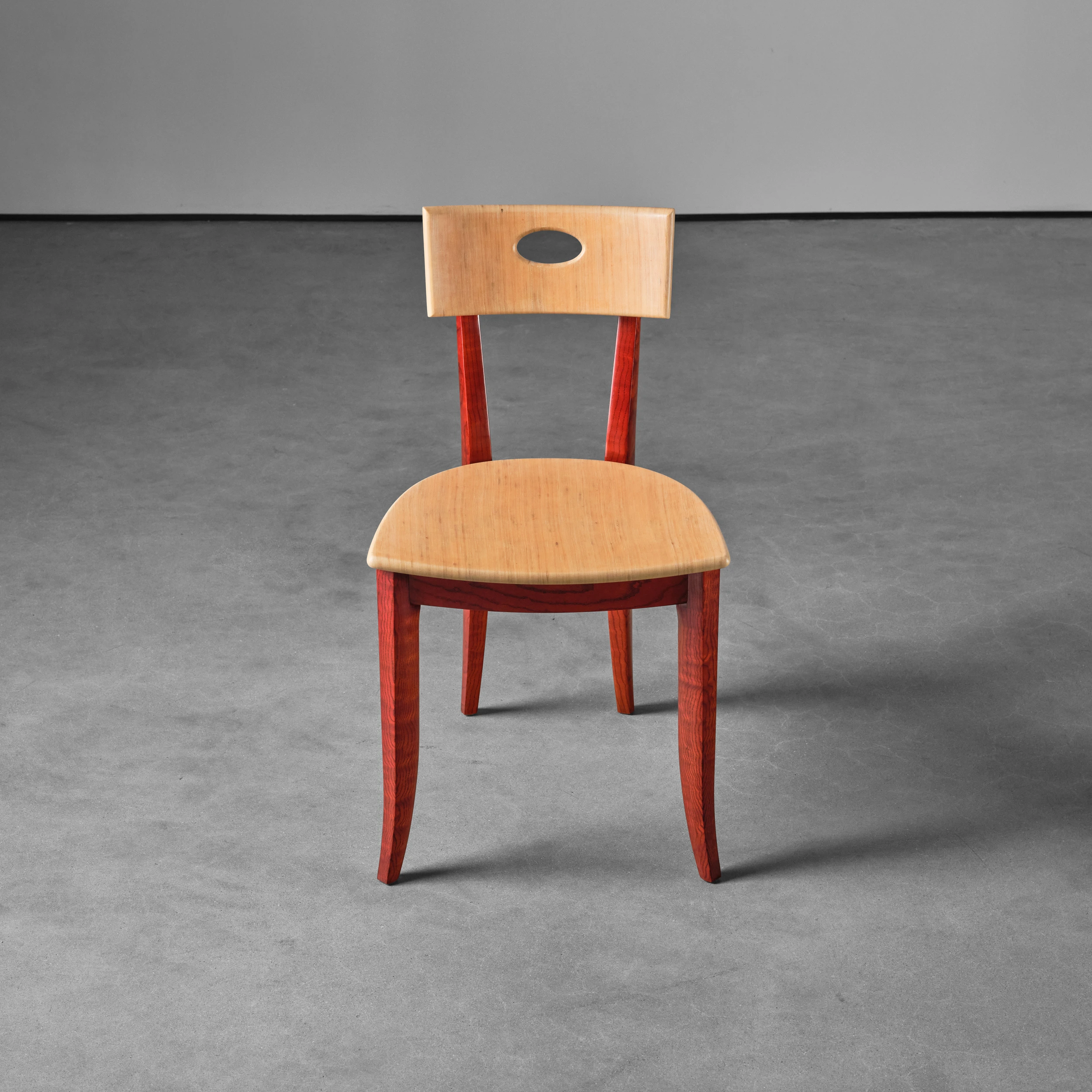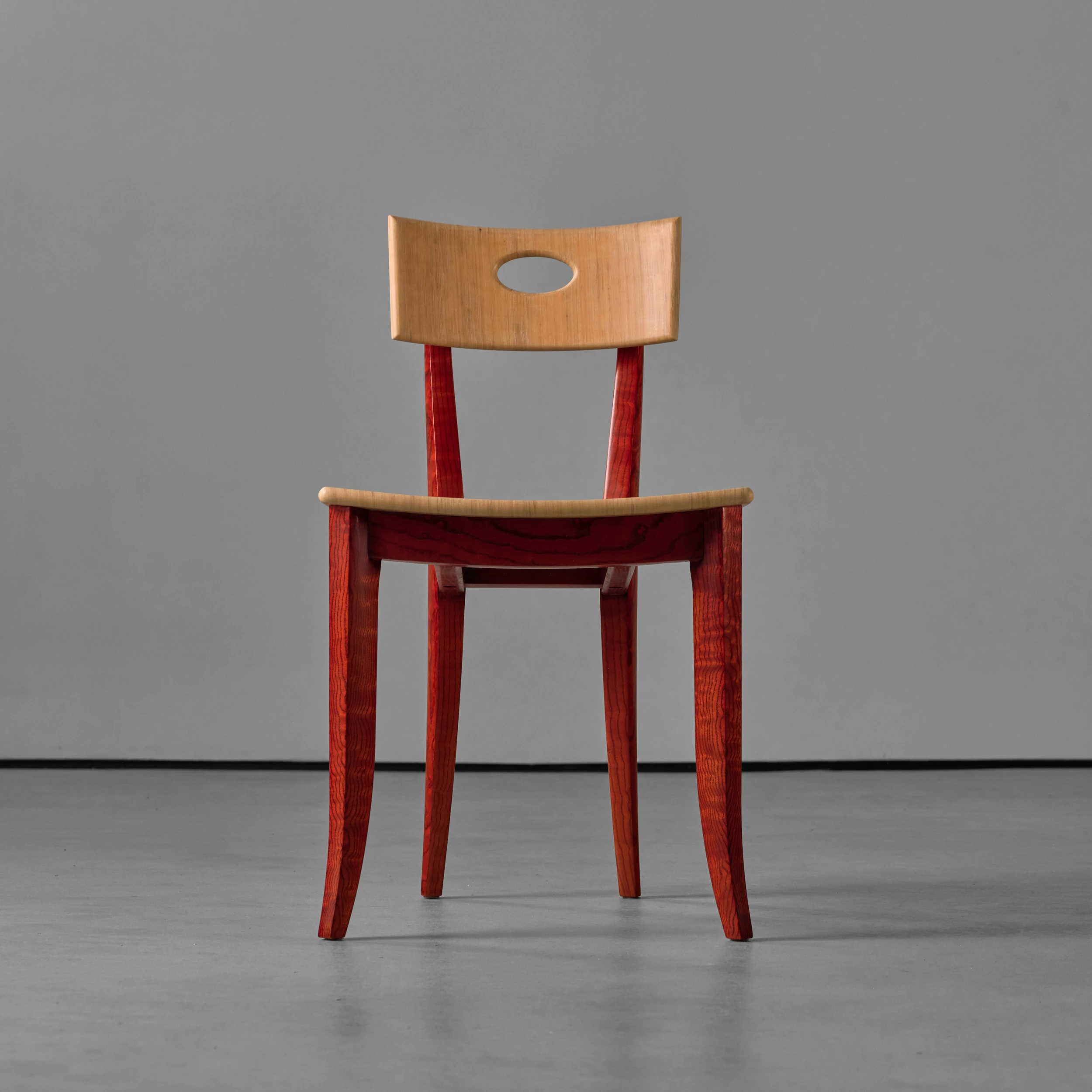 Paired with the desk is a matching chair made from highly figured curly ash with a seat and backrest made from formed raw Indian silk saturated with epoxy resin.