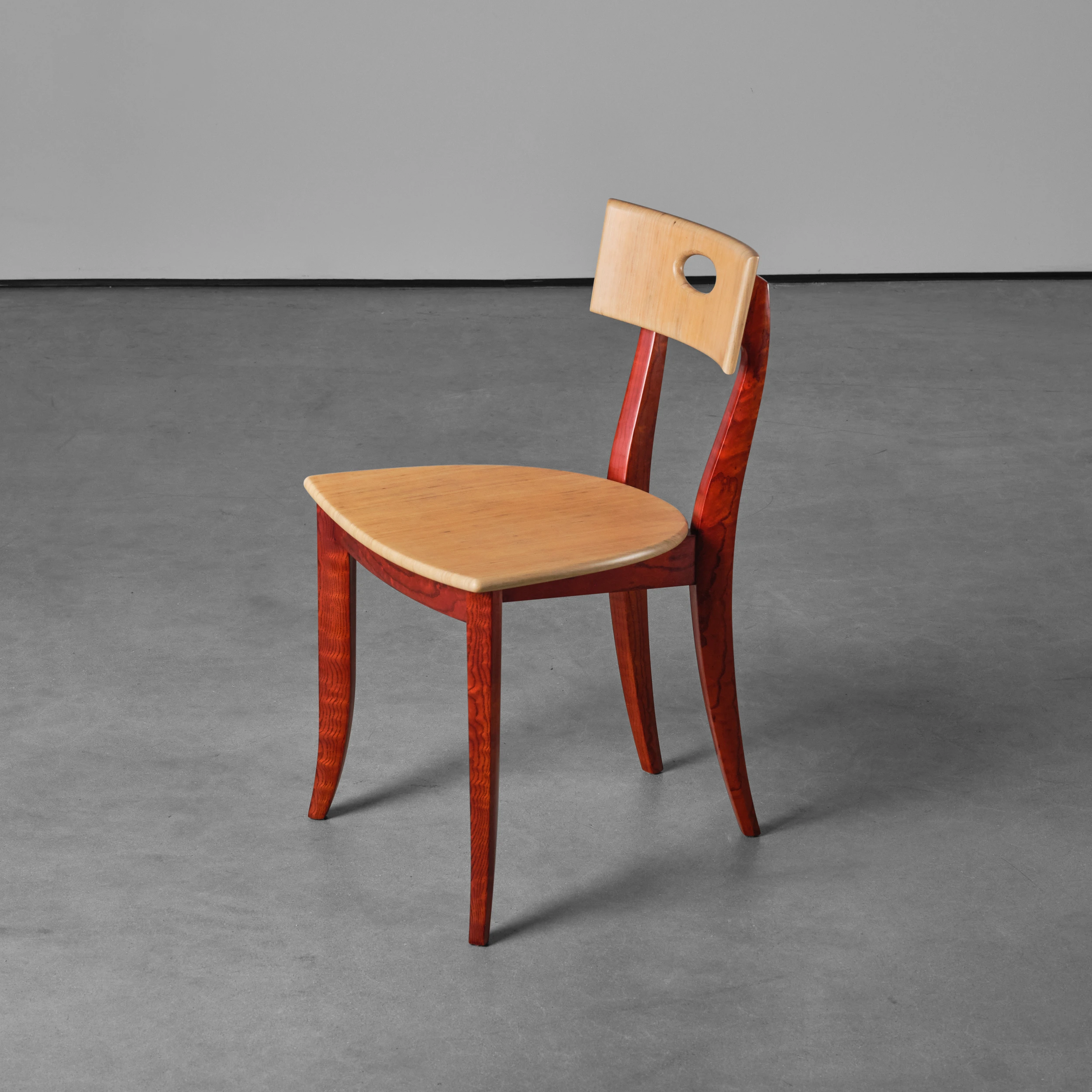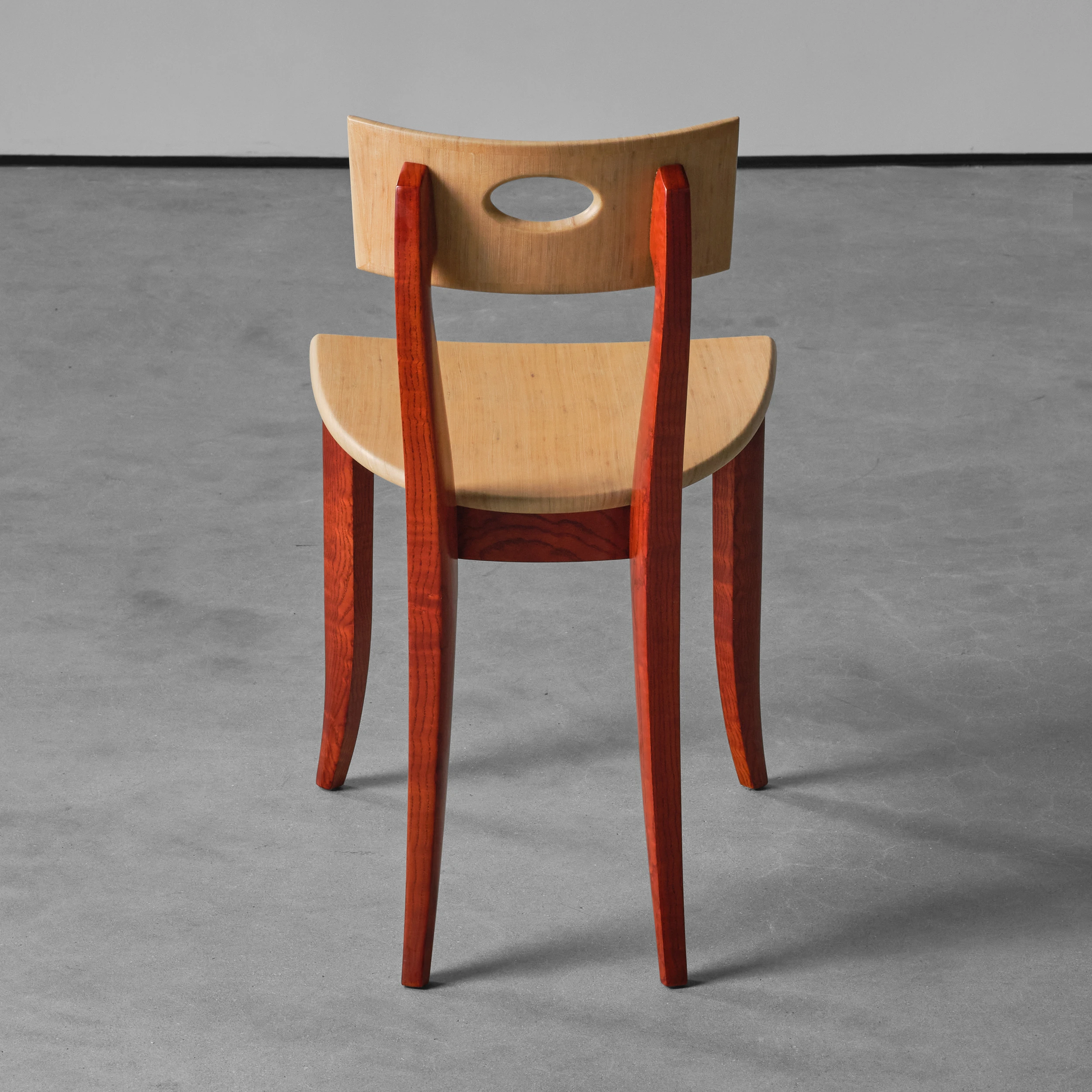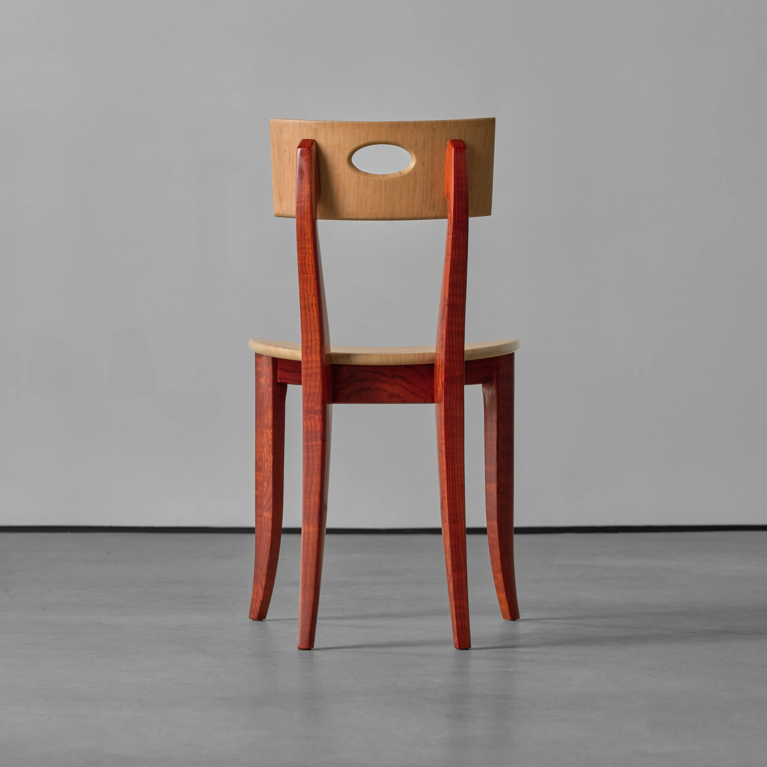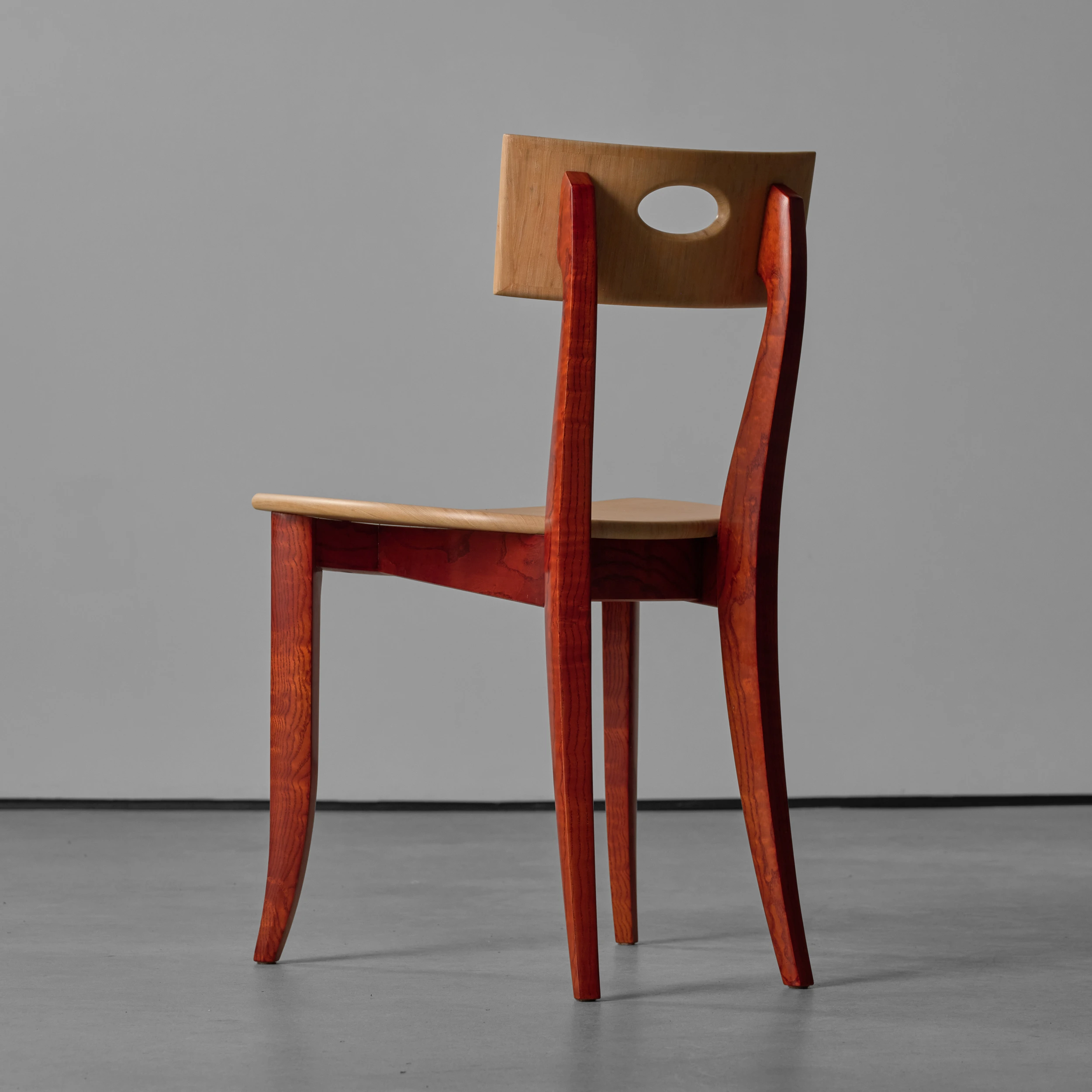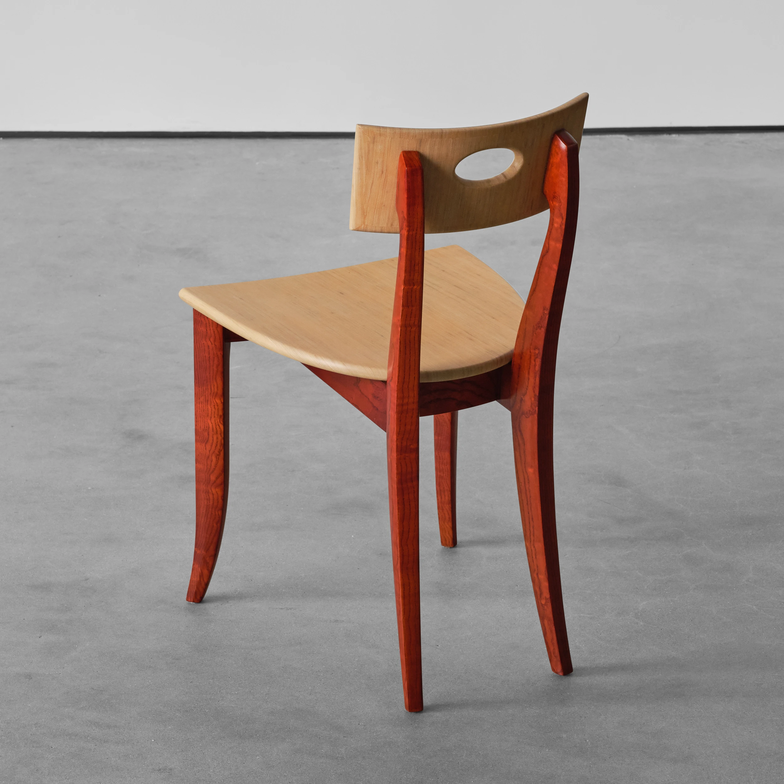 Paired with the desk is a matching chair made from highly figured curly ash with a seat and backrest made from formed raw Indian silk saturated with epoxy resin.