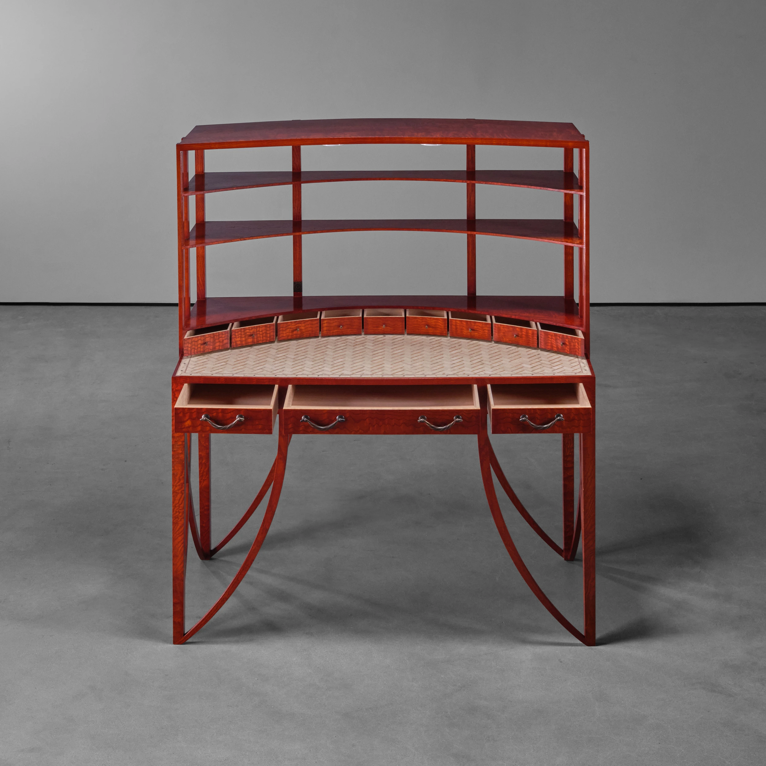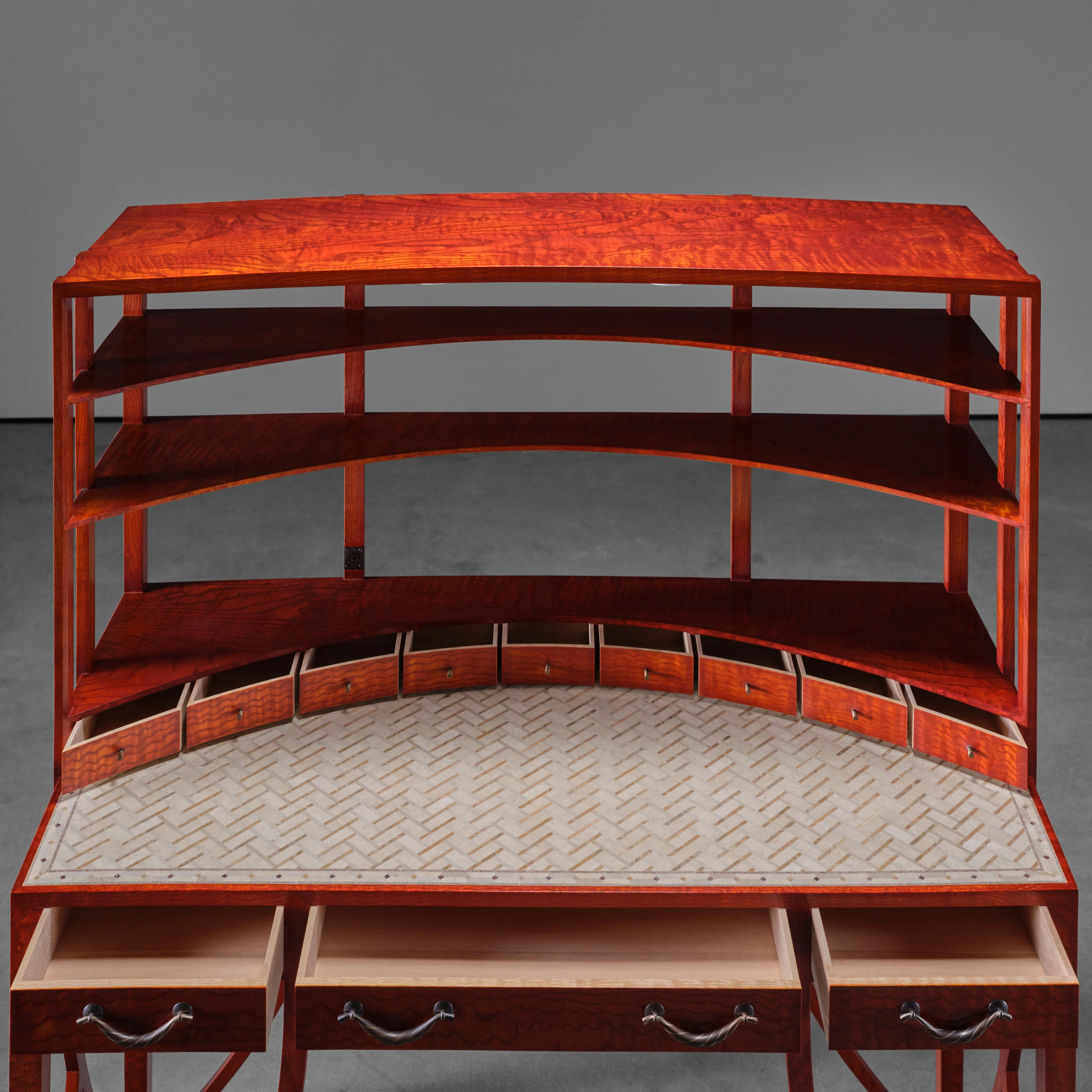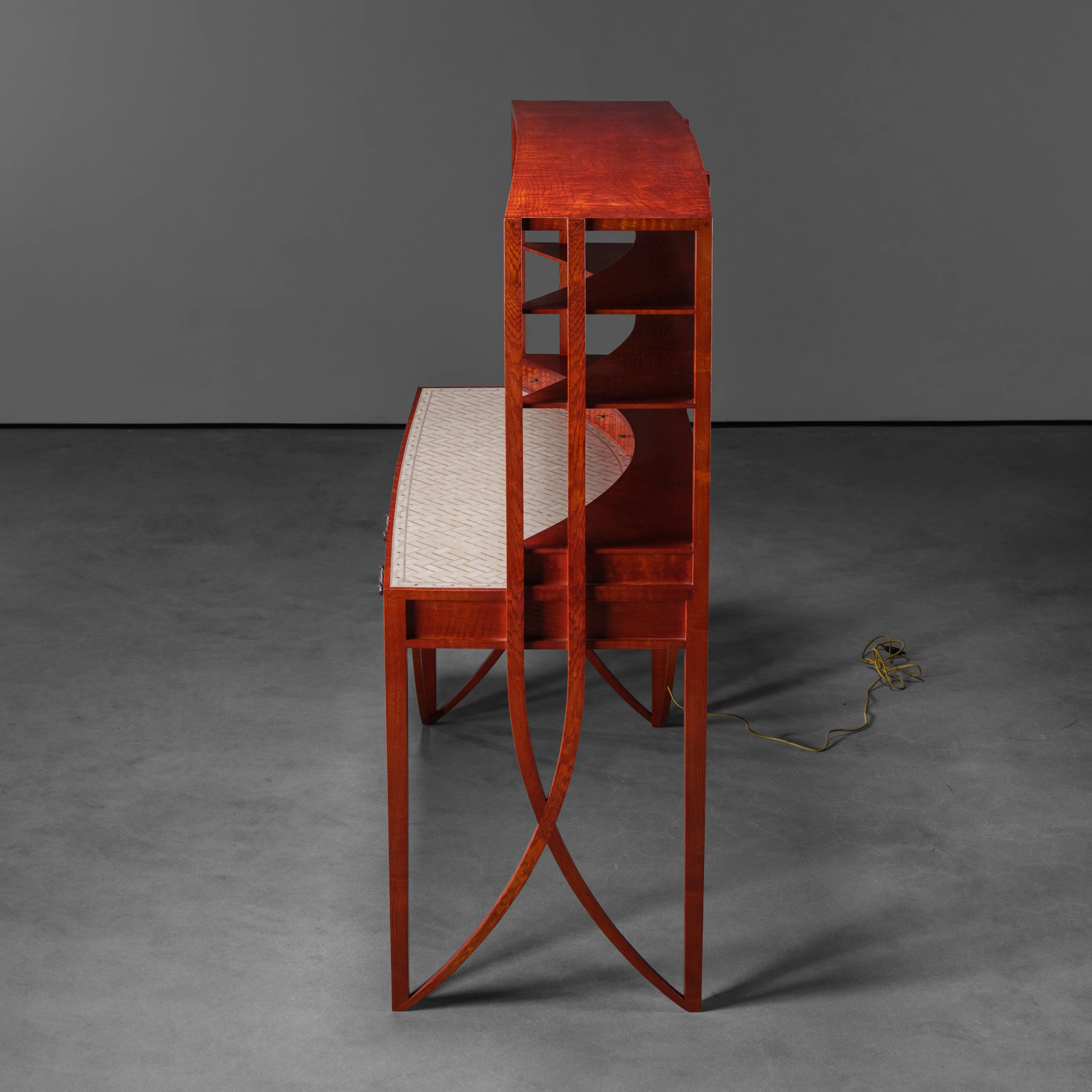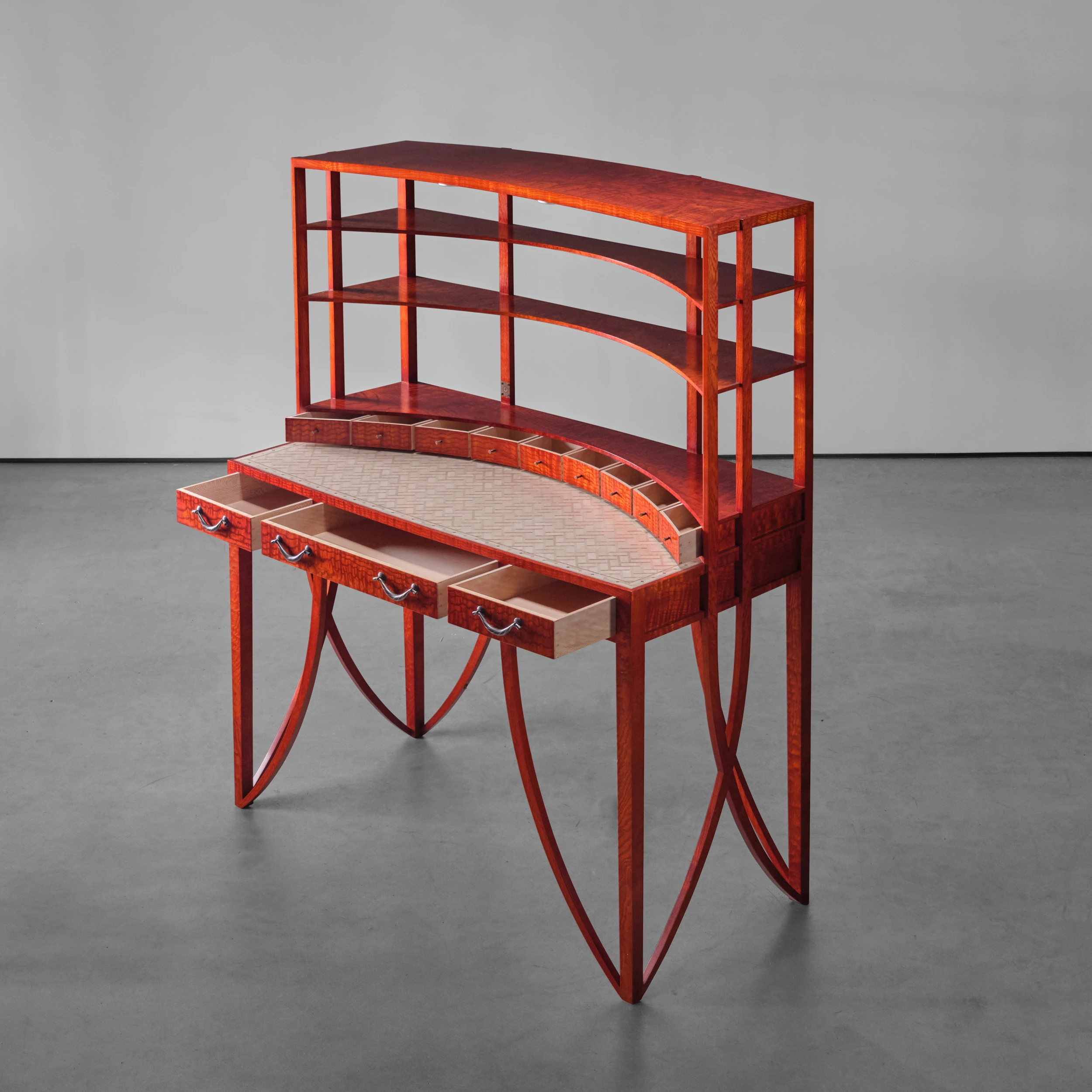 A highly intricate desk by studio craft master Michael Hurwitz. The work in comprised of linear and sweeping, curved lines and crafted utilizing tapered lamination construction techniques. The Curly Ash surfaces of the desk are finished in a rich, warm red-orange Japanese cashew varnish.