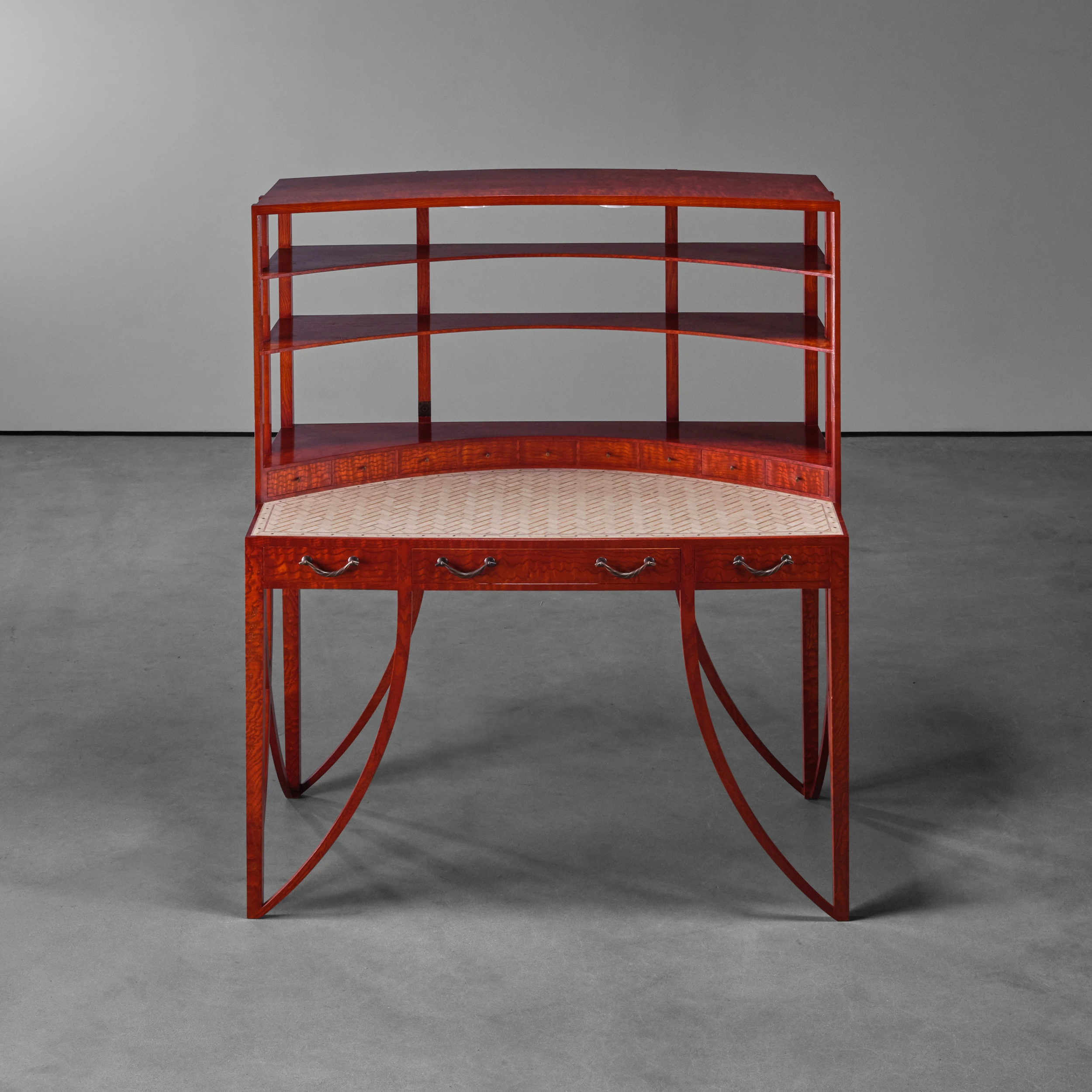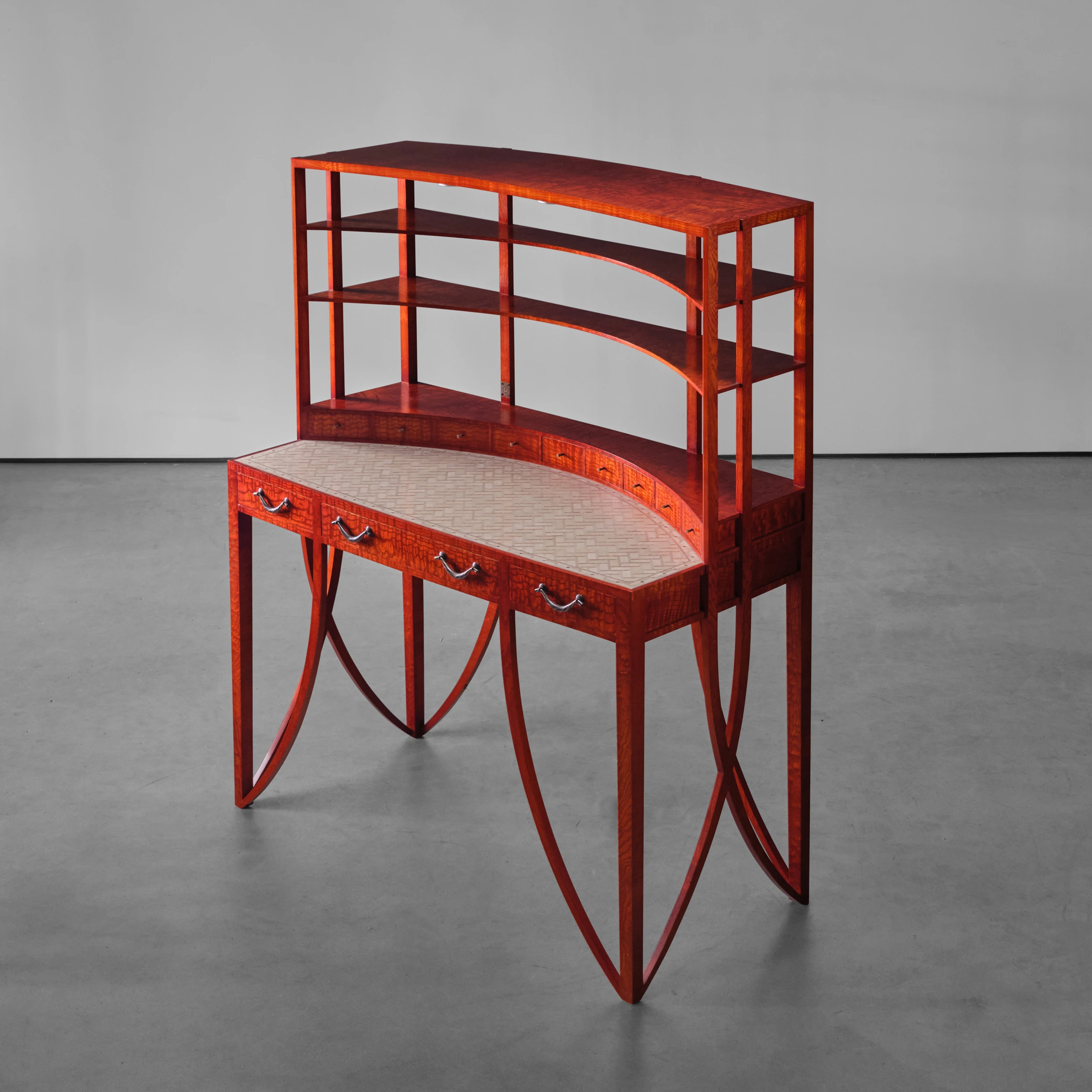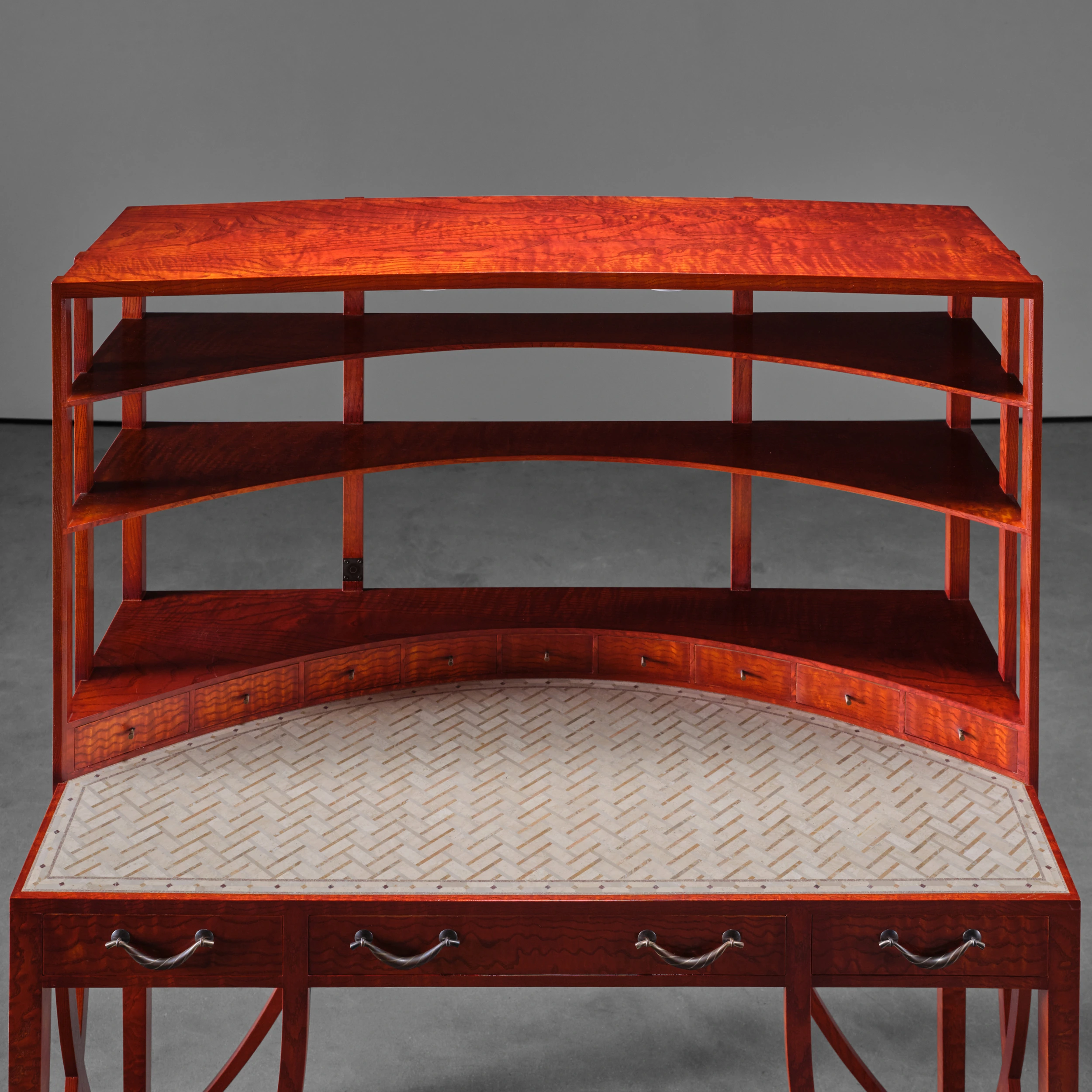 A highly intricate desk by studio craft master Michael Hurwitz. The work in comprised of linear and sweeping, curved lines and crafted utilizing tapered lamination construction techniques. The Curly Ash surfaces of the desk are finished in a rich, warm red-orange Japanese cashew varnish.