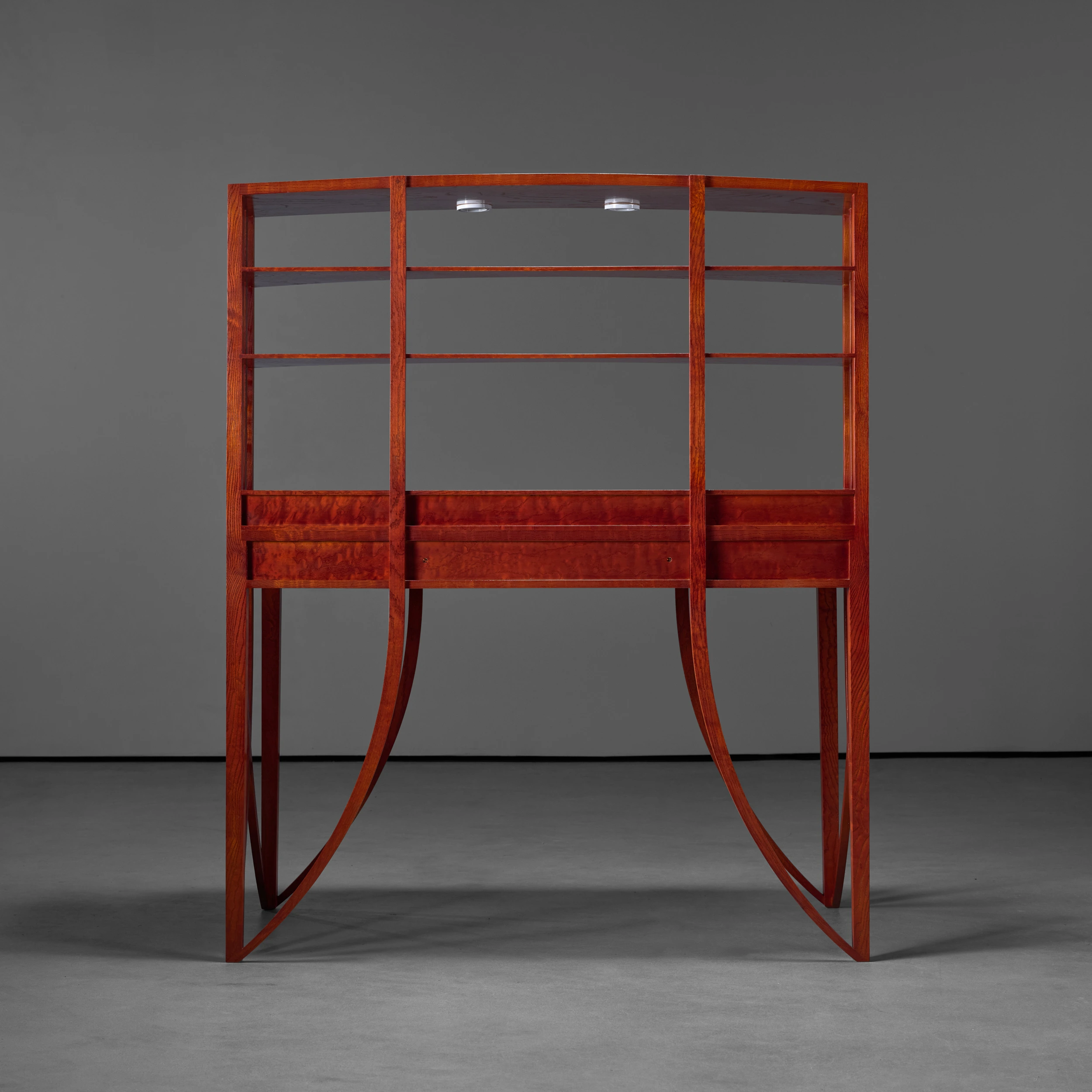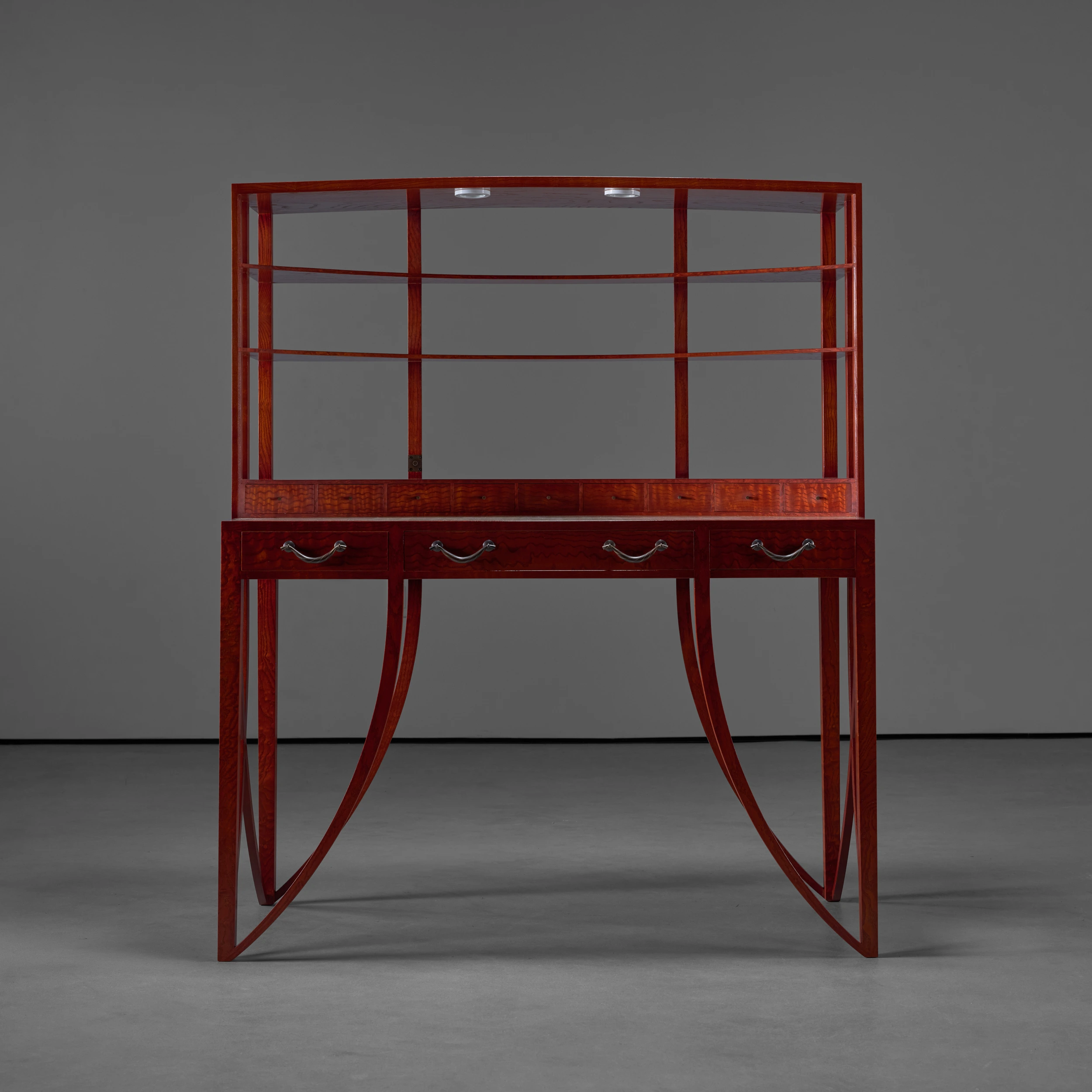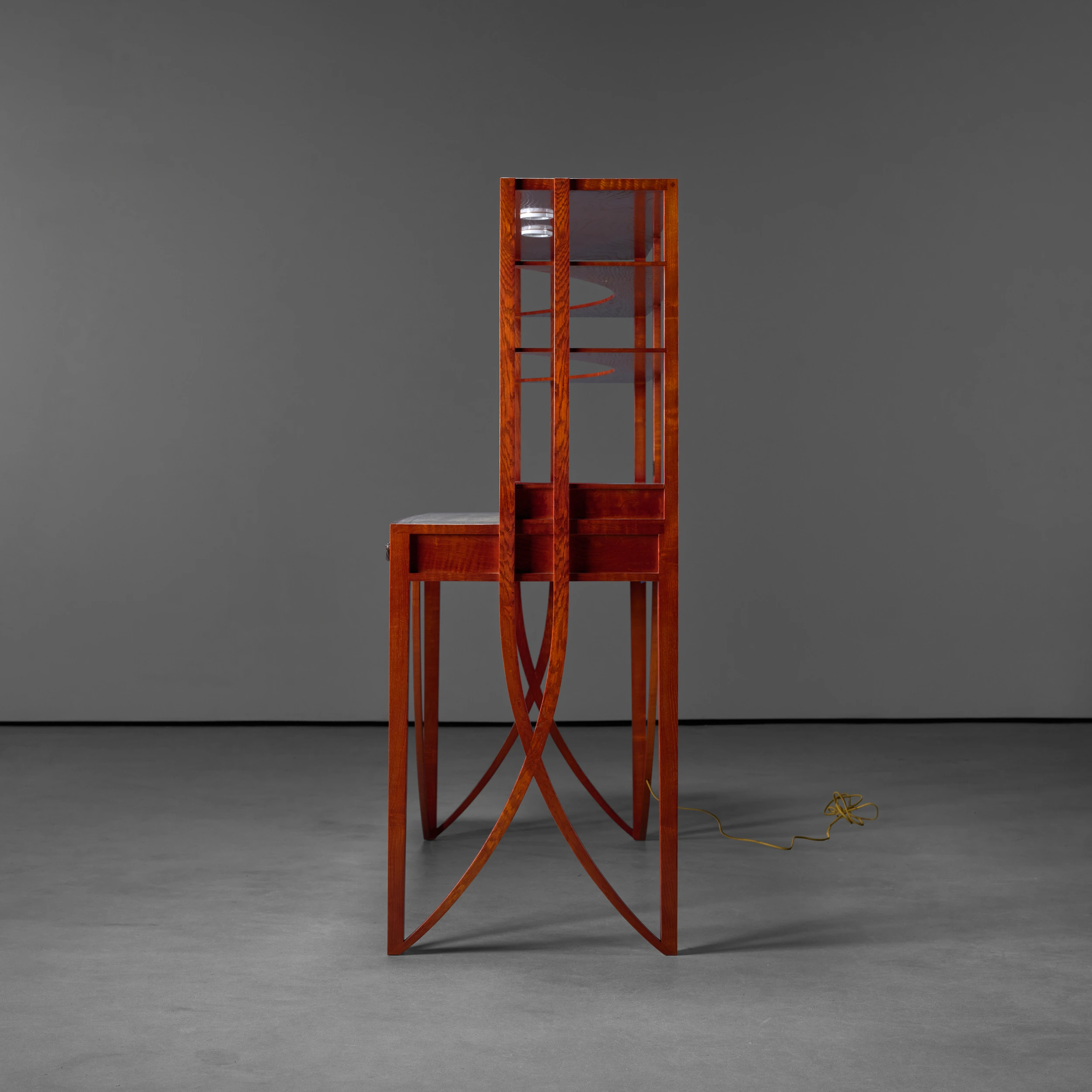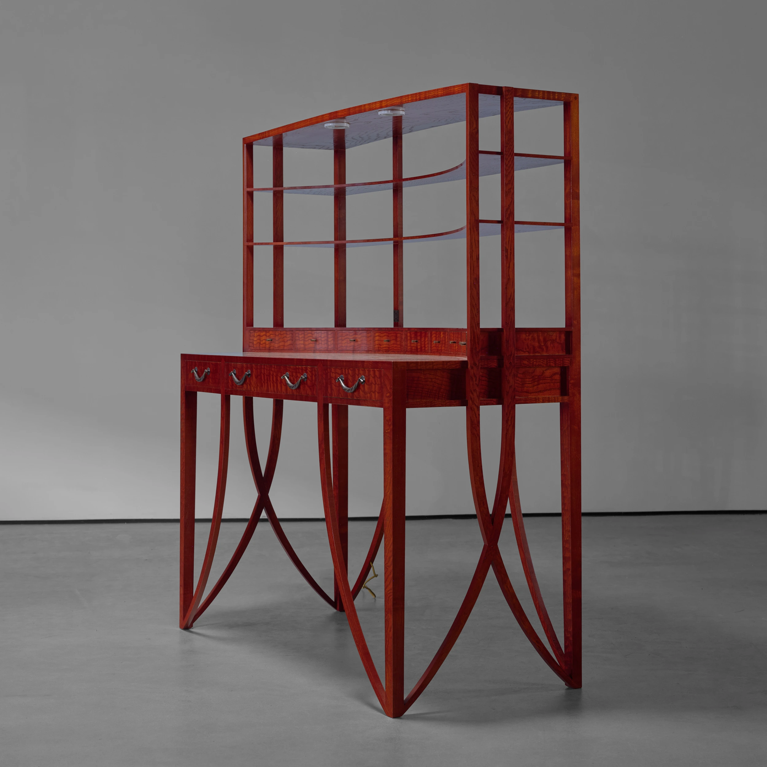 A highly intricate desk by studio craft master Michael Hurwitz. The work in comprised of linear and sweeping, curved lines and crafted utilizing tapered lamination construction techniques. The Curly Ash surfaces of the desk are finished in a rich, warm red-orange Japanese cashew varnish.