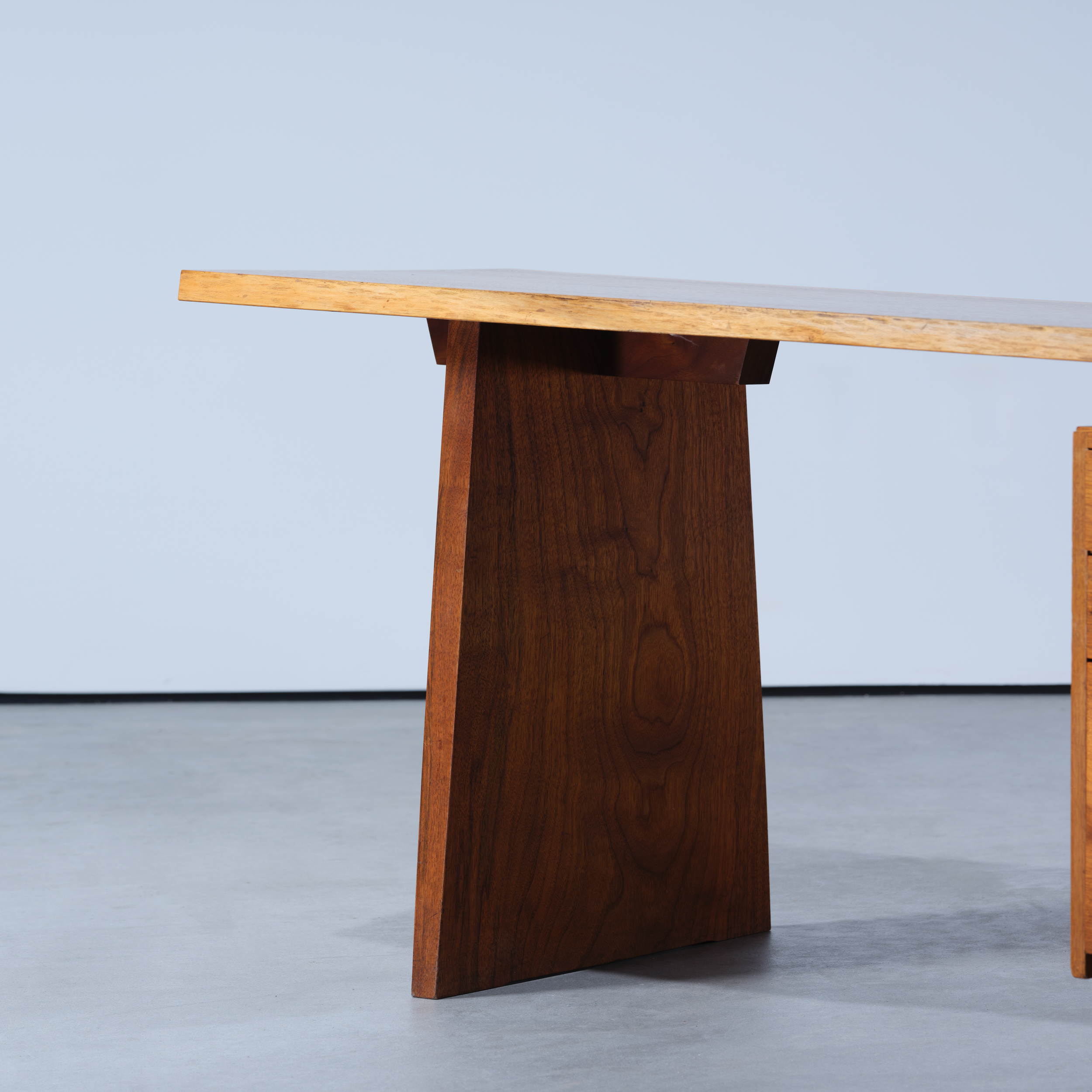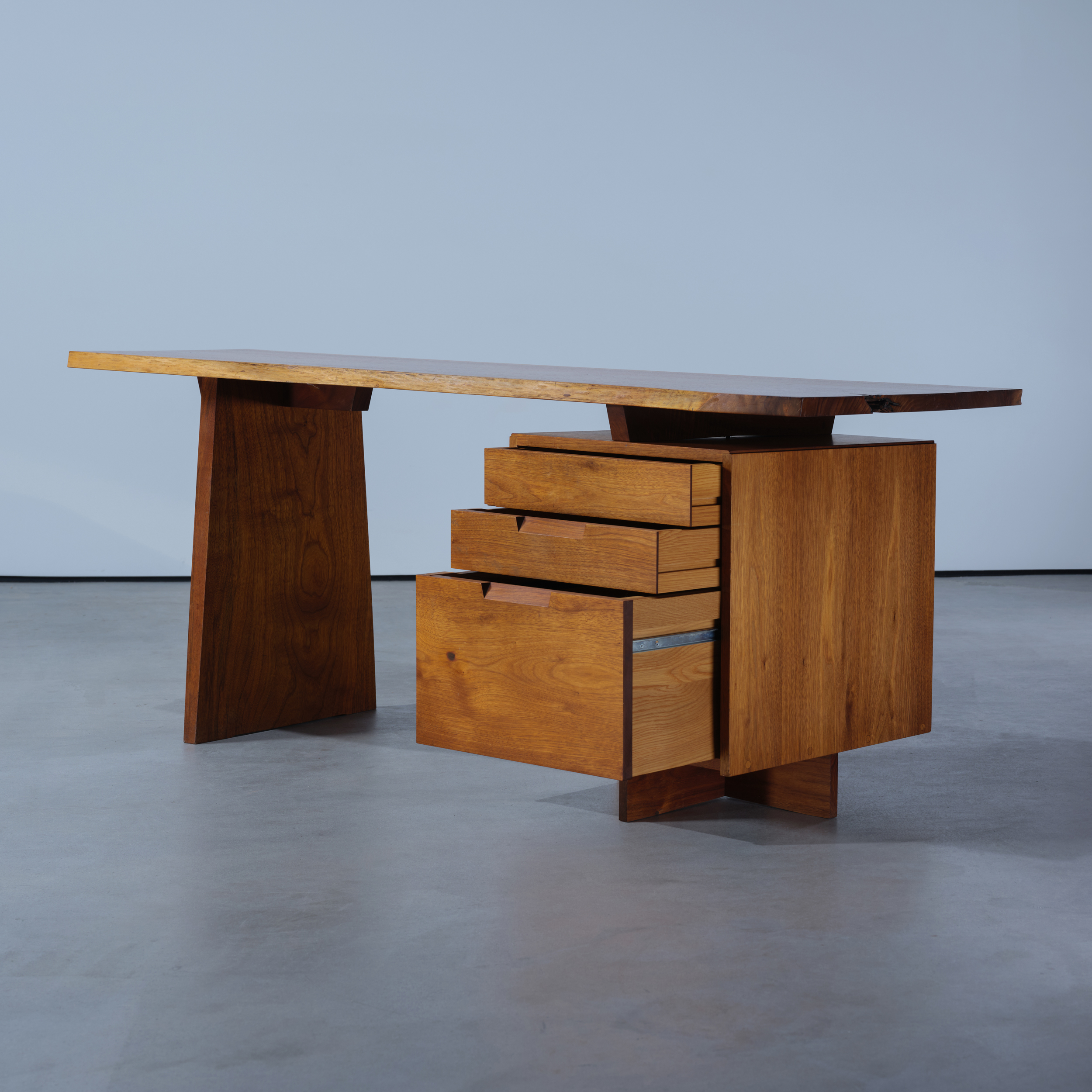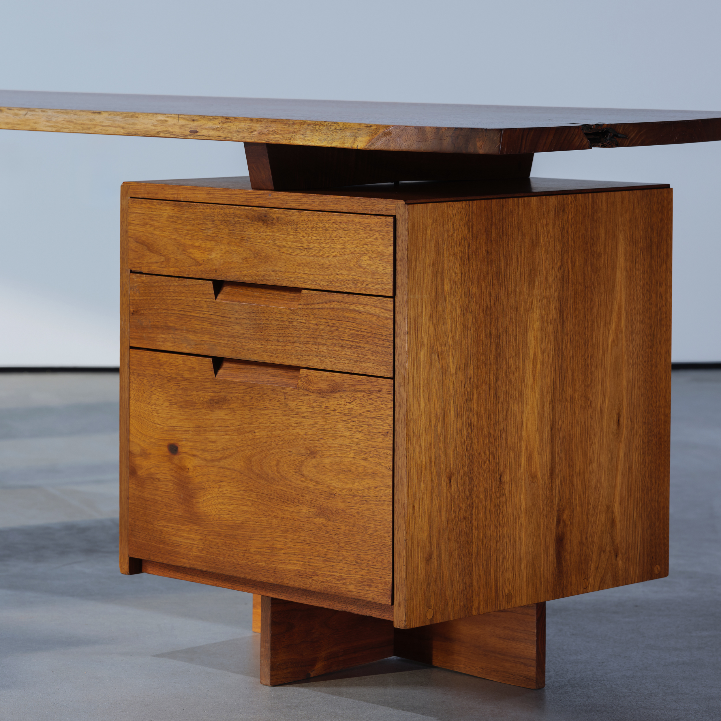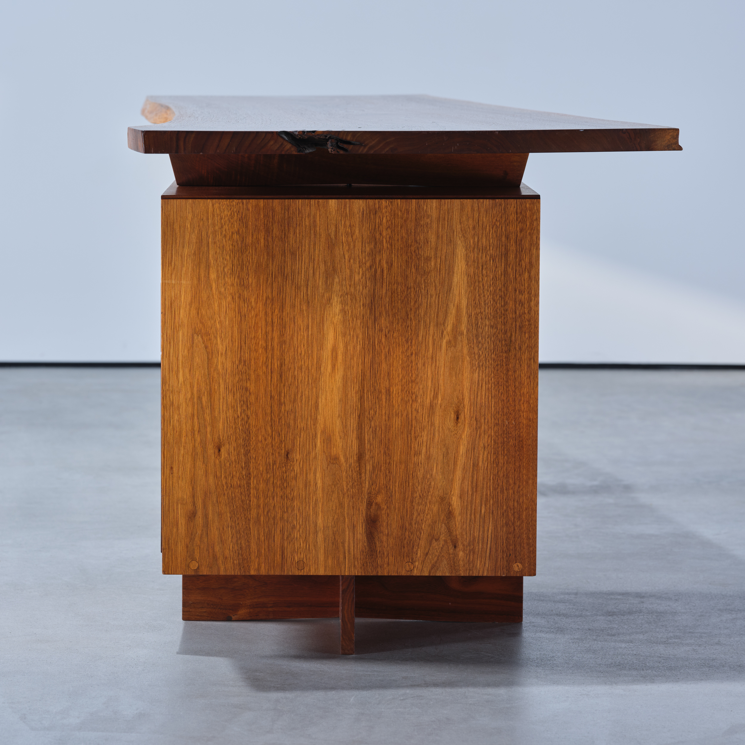 This Custom Single Pedestal Desk is a unique example which features a well-figured, elongated top of American black walnut, a free edge on both the front and back lengths, a cantilevered overhang, a single rosewood butterfly, and a vertical slab support. The vertical slab support is a highly unique desk base permutation and an atypical feature of a Nakashima Single Pedestal Desk.