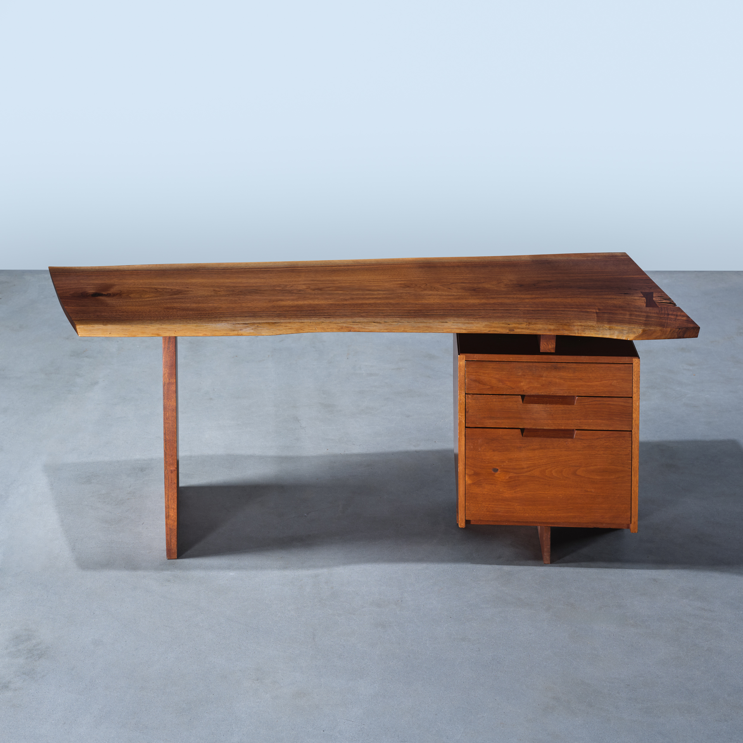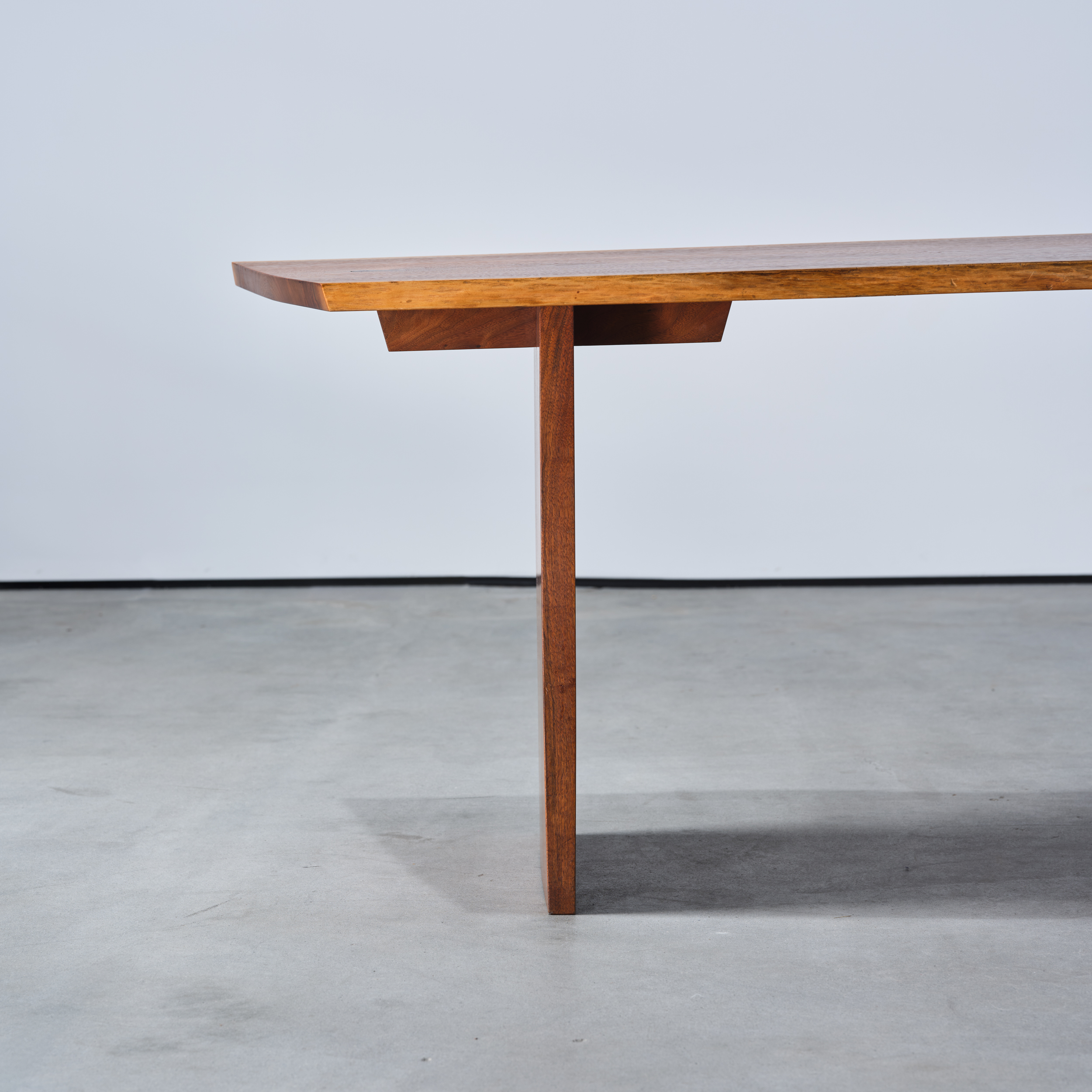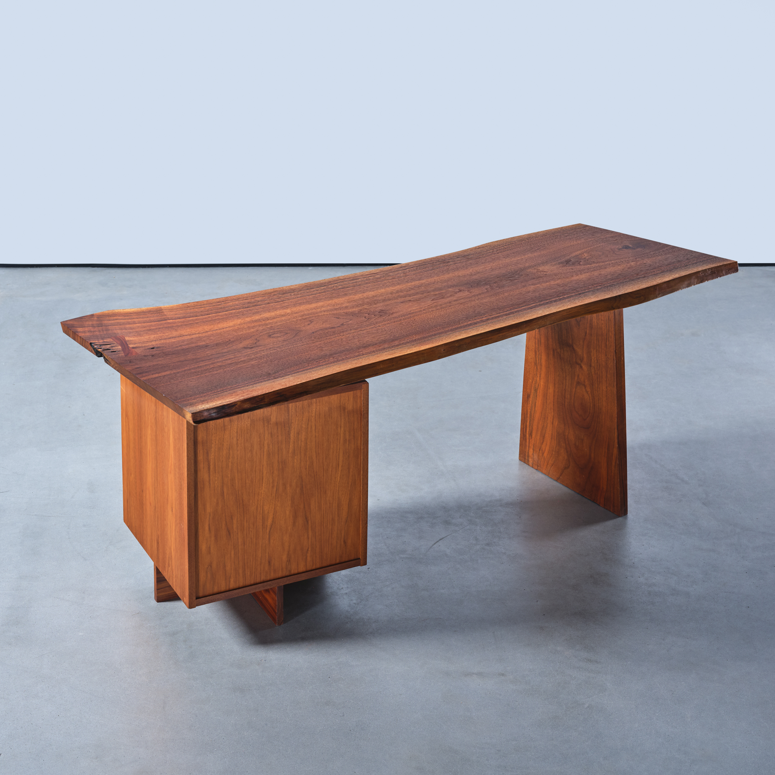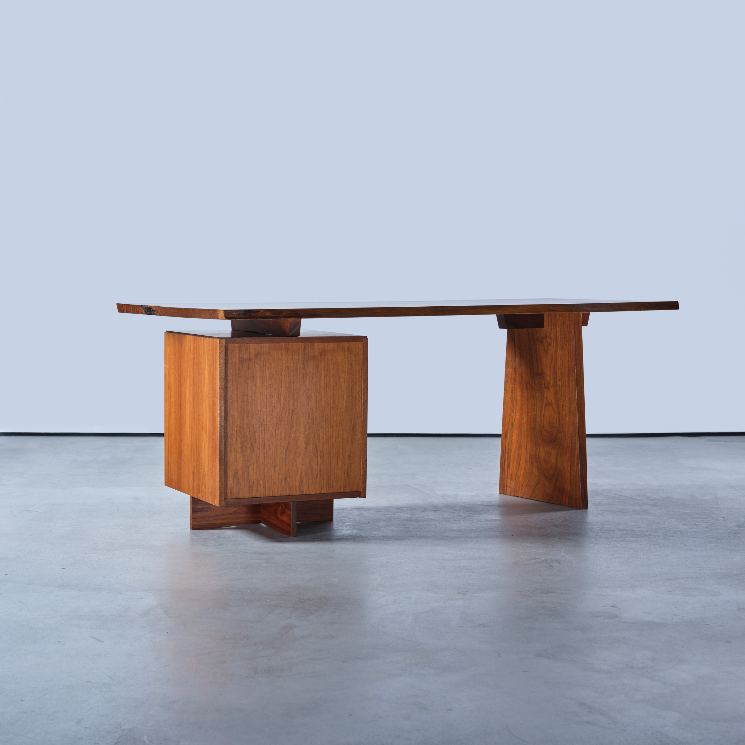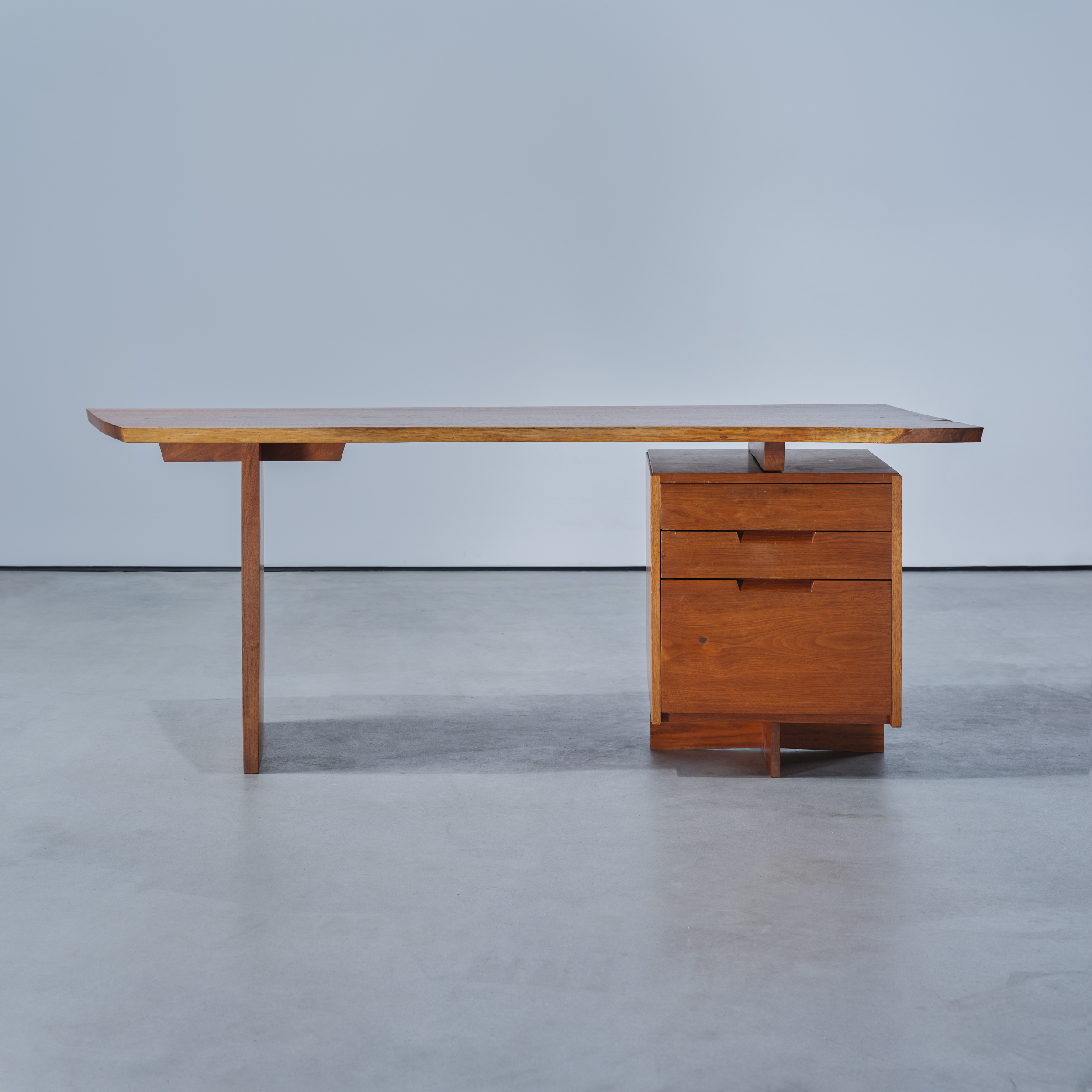 This Custom Single Pedestal Desk is a unique example which features a well-figured, elongated top of American black walnut, a free edge on both the front and back lengths, a cantilevered overhang, a single rosewood butterfly, and a vertical slab support. The vertical slab support is a highly unique desk base permutation and an atypical feature of a Nakashima Single Pedestal Desk.