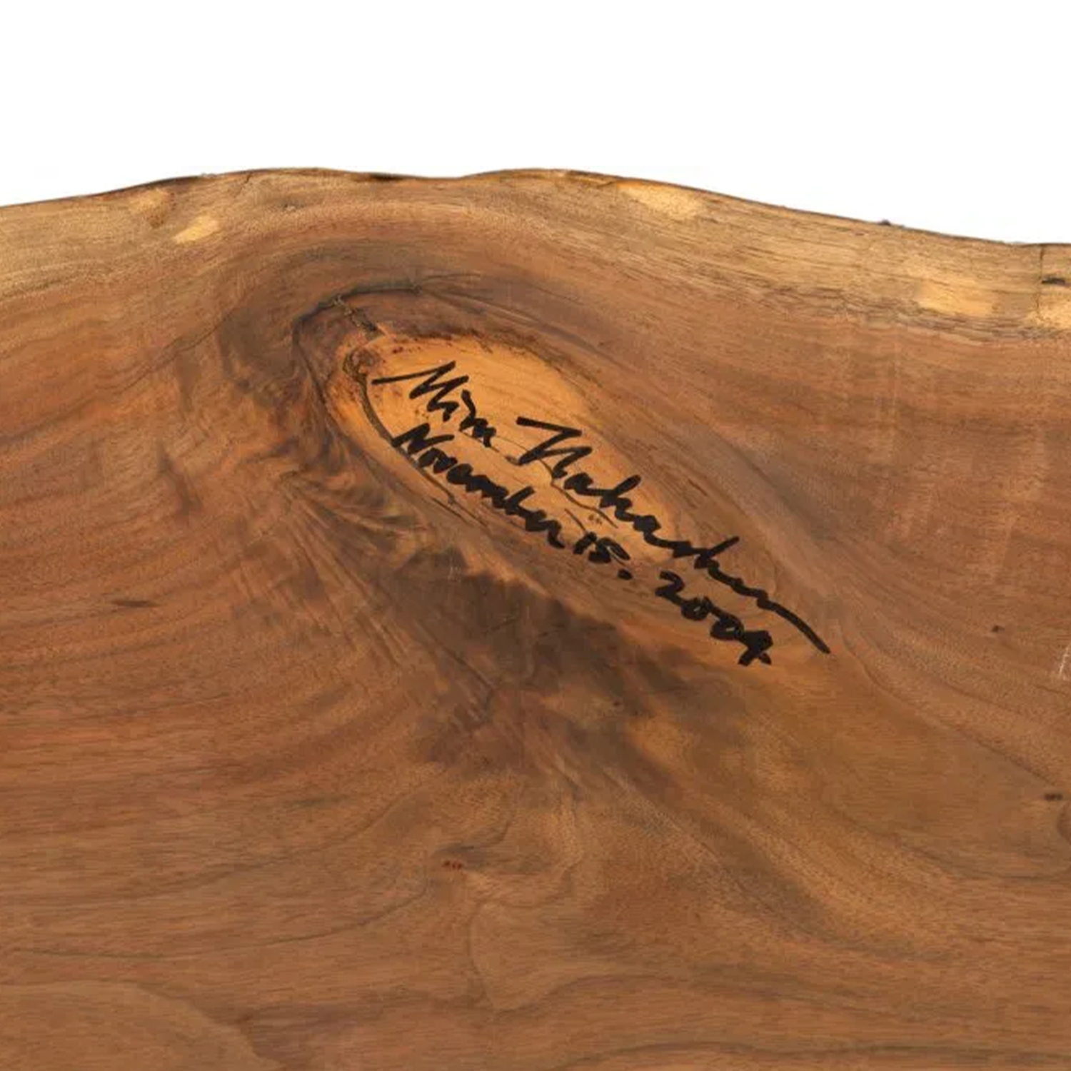 The Hyatt commission grew to include a significant number of works, many of them ambitious in size, including tables, benches, and credenzas. These pieces, made of solid walnut, are joined with Nakashima’s iconic butterfly keys and feature the design house’s characteristic freeform edges, thus highlighting the natural beauty of the organic material. Particular emphasis is placed on the exaggeration and extension of the horizontal plane. Mira Nakashima’s signature can be found on the underside of each piece in this collection, along with its respective date of completion. In the original design sketches accompanying these works, we see the attention to detail and respect for material so synonymous with the Nakashima name.