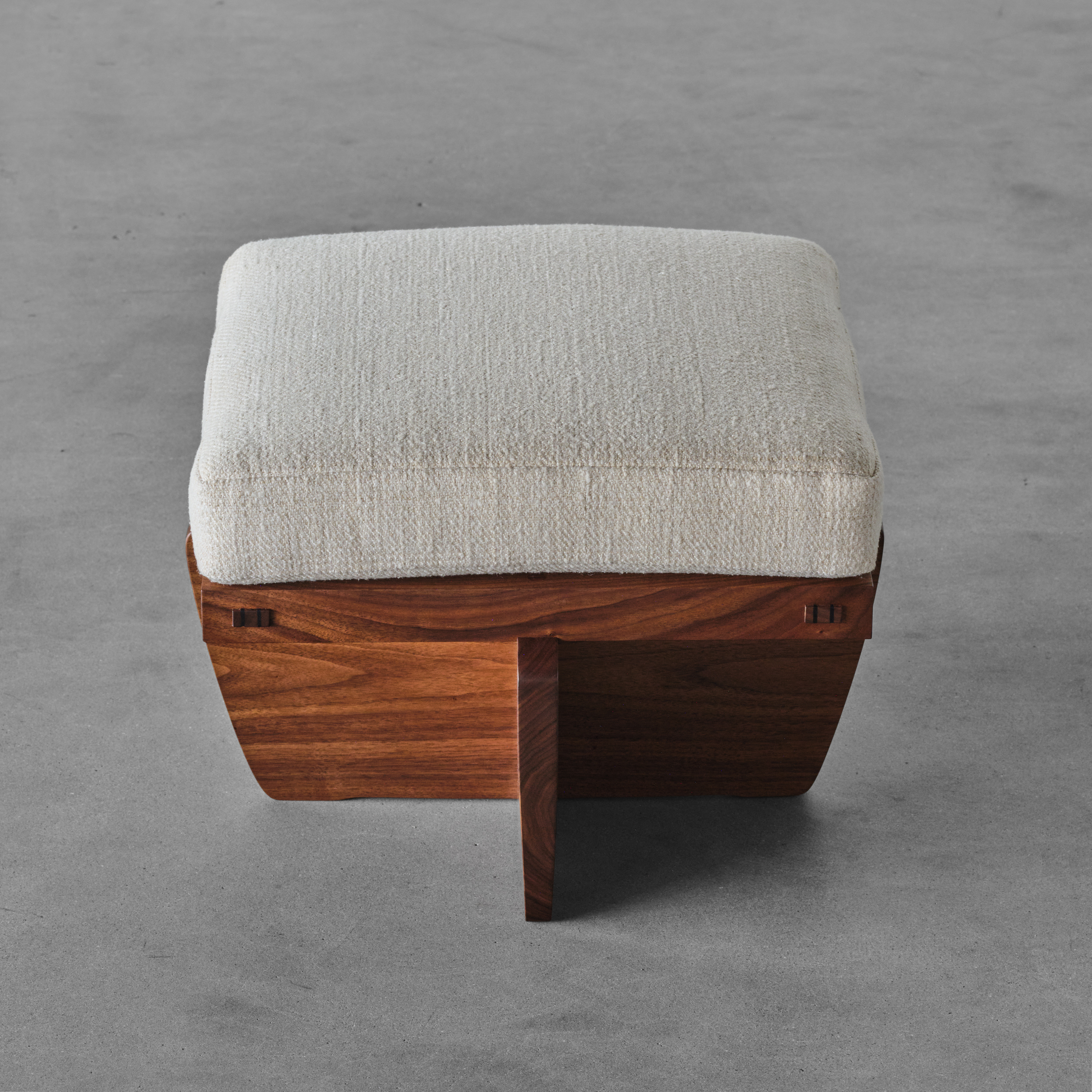 A set of Greenrock Ottomans by Mira Nakashima which include cushions upholstered with vintage Jack Lenor Larson fabric. The Greenrock Ottoman is an iconic George Nakashima design which came to fruition circa 1973.