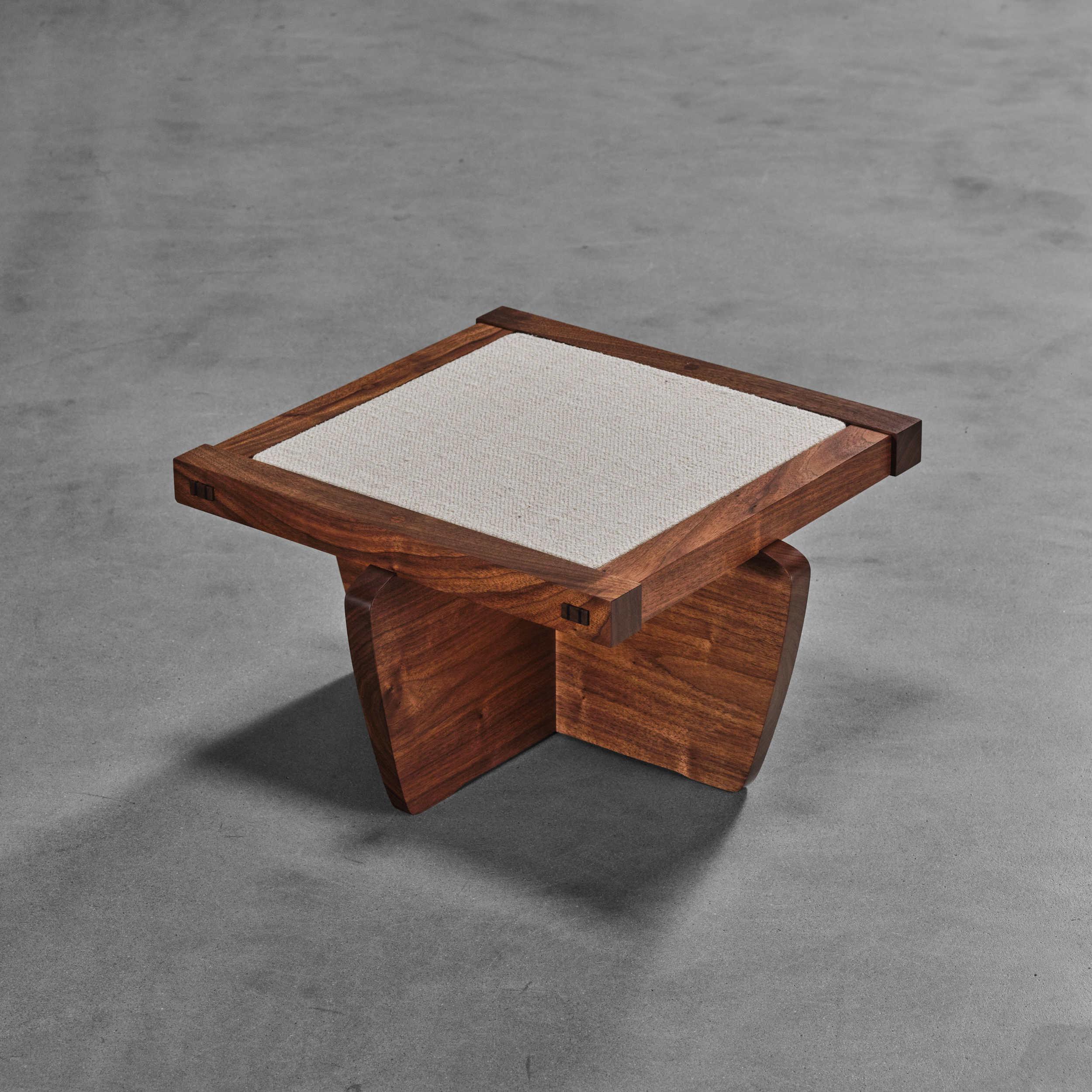 The ottoman’s interlocking cradle base relates closely to bases used by Nakashima on case pieces produced during this era. The more pronounced use of interchangeable architectonic devices for support elements in case pieces, tables, and chairs reveals a growing simplicity, an almost reductivist vocabulary, in much of Nakashima’s design work of the 1970s. The reduced differentiation between his designs coincides with an increasing interest in the free edge in tables, case pieces, and chairs. He began to abdicate his role in the design process, in the face of his respect for organic naturalism.
