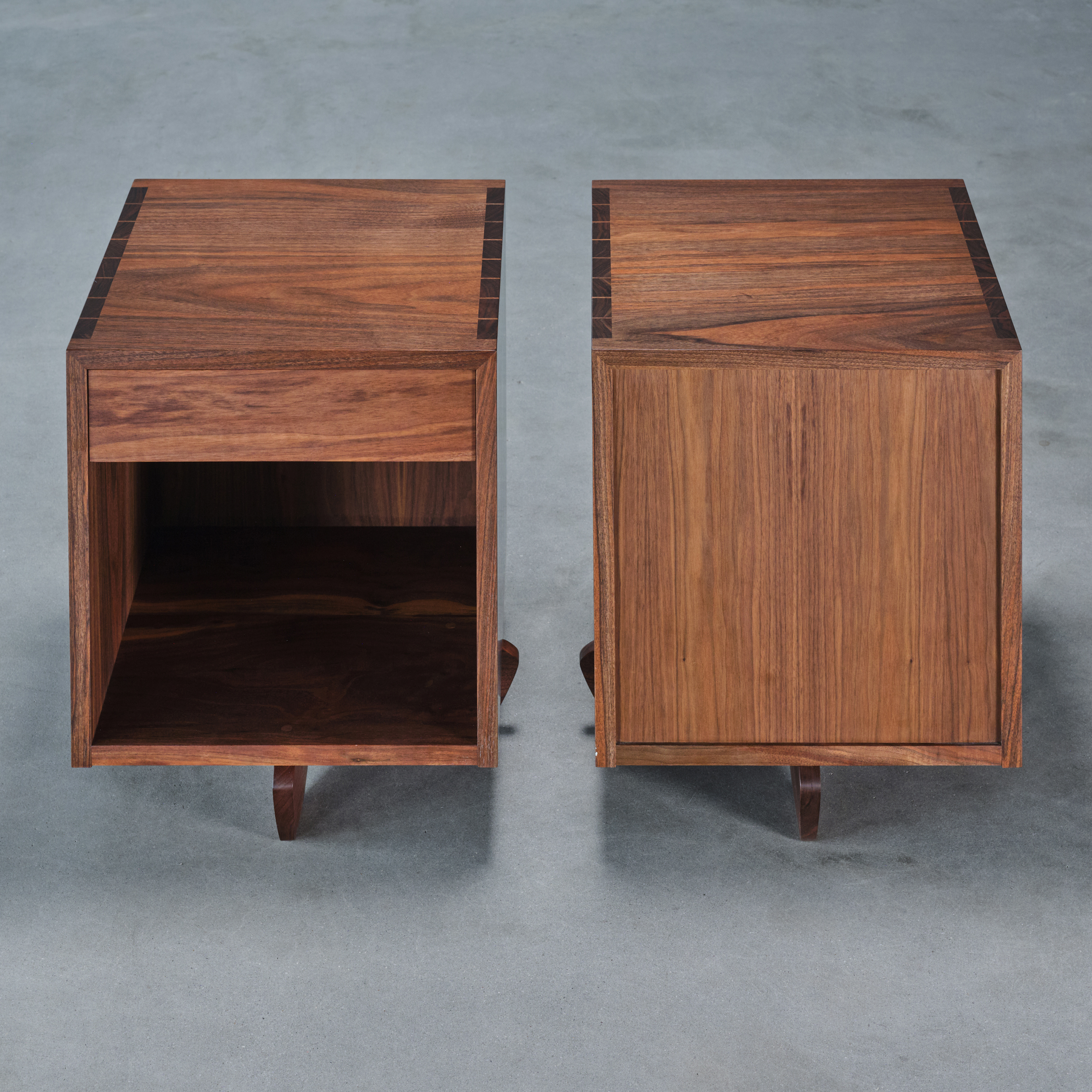 The pair of nightstands also feature Nakashima’s signature exposed, hand-worked dovetail joinery along the juncture of the top and sides of each case.