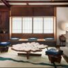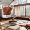 “Conoid” was originally designed in 1959 by George Nakashima and manufactured the same year by Edward Fields. The original square rug (8’10” x 8’10”) represents a stylized modernist landscape of crossing lines in retro yellow, taupe and dark blue colors all crafted in wool, with high and low pile heights. It was named after George Nakashima’s Conoid Studio located in New Hope Pennsylvania where the original rug is still displayed. Today the Nakashima rug collection features a replica of the Conoid design in its original colors, construction and size, Conoid I, as well as a new earth tone interpretation in 8’x10’ size, developed under Mira Nakashima’s creative lead, Conoid II. All designs in this edition are expertly tufted by skilled artisans.