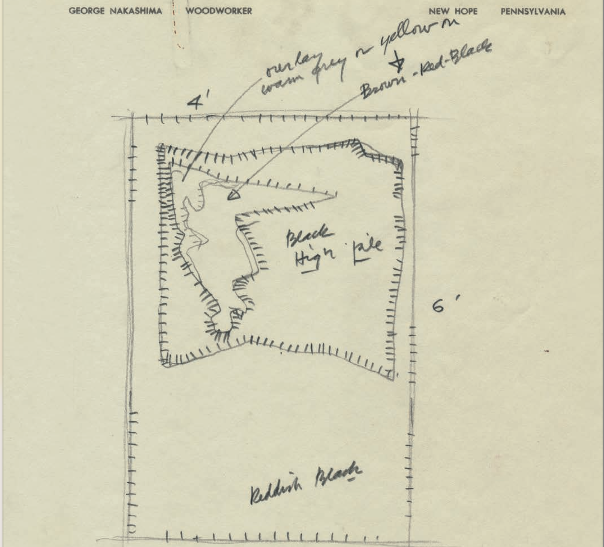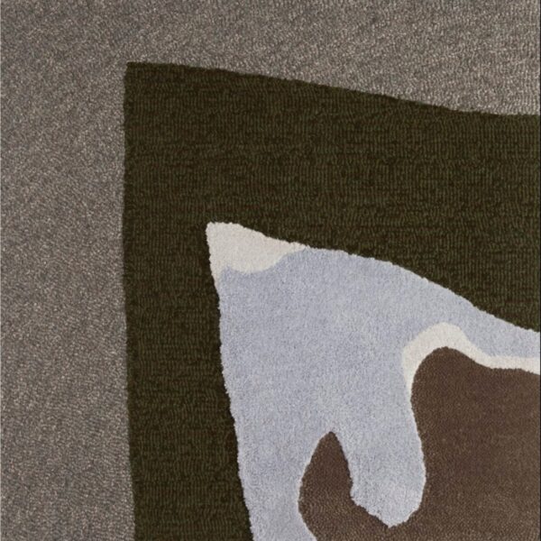 “Inner Island” means “Nakashima” in Japanese. The drawing featured a squarish island with a snow-topped angular mountain representing an example of George Nakashima’s profound inspiration from nature. This design was never manufactured as a rug but following Nakashima’s notes found on the sketch, an interpretation was crafted by the Edward Fields creative team and Mira Nakashima to create a piece made of different deniers of wools mixed with accents of silk in a color palette of forest green, brown and icy blue, Inner Island I. A second interpretation was made in textured wools in grey and blue tones juxtaposed to the shine of silk, Inner Island II. All designs in this edition are expertly tufted by skilled artisans.