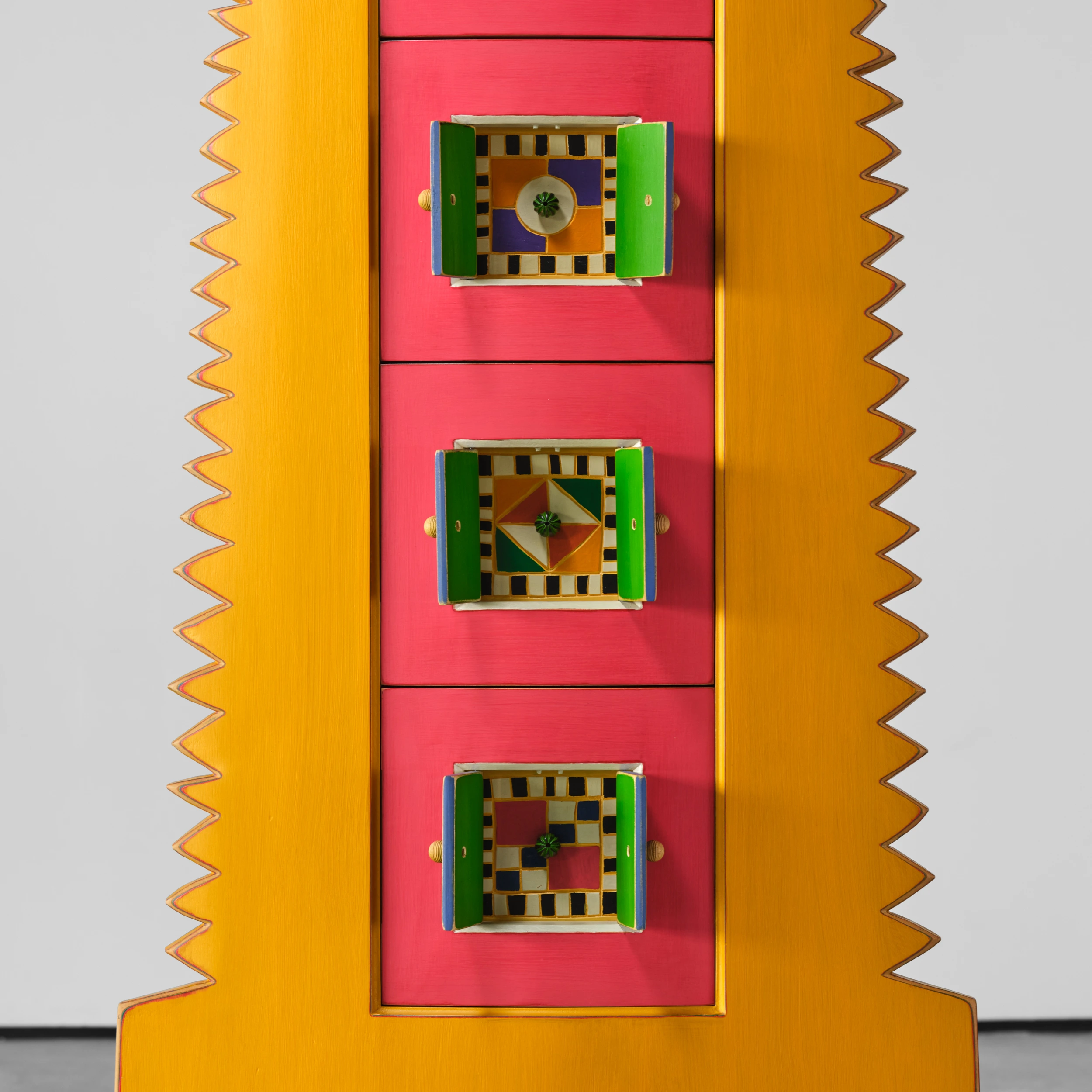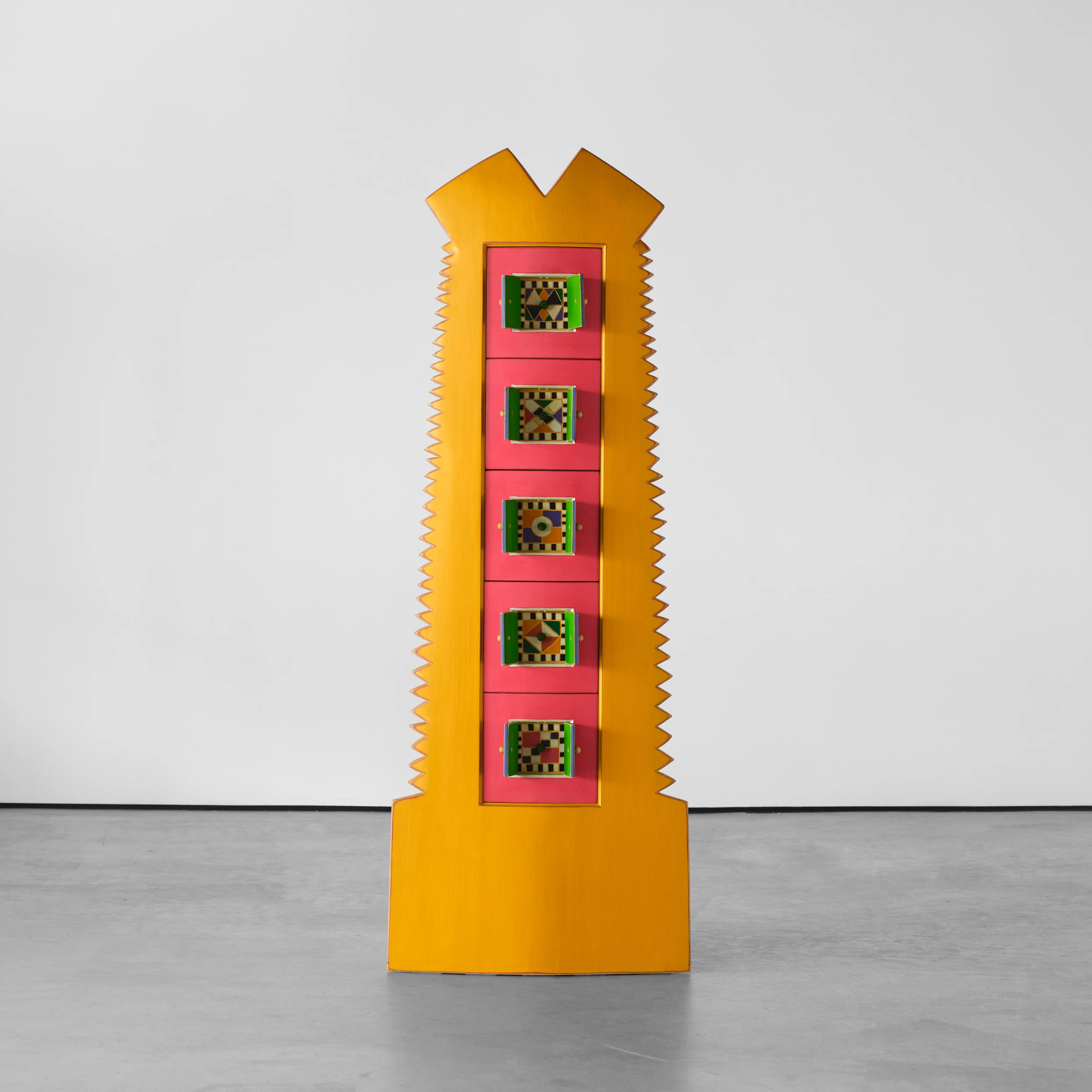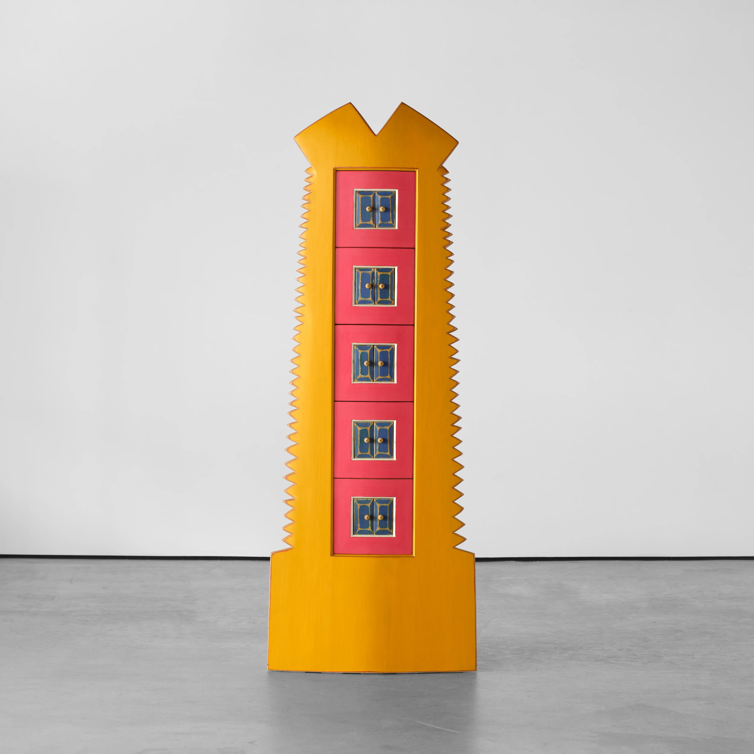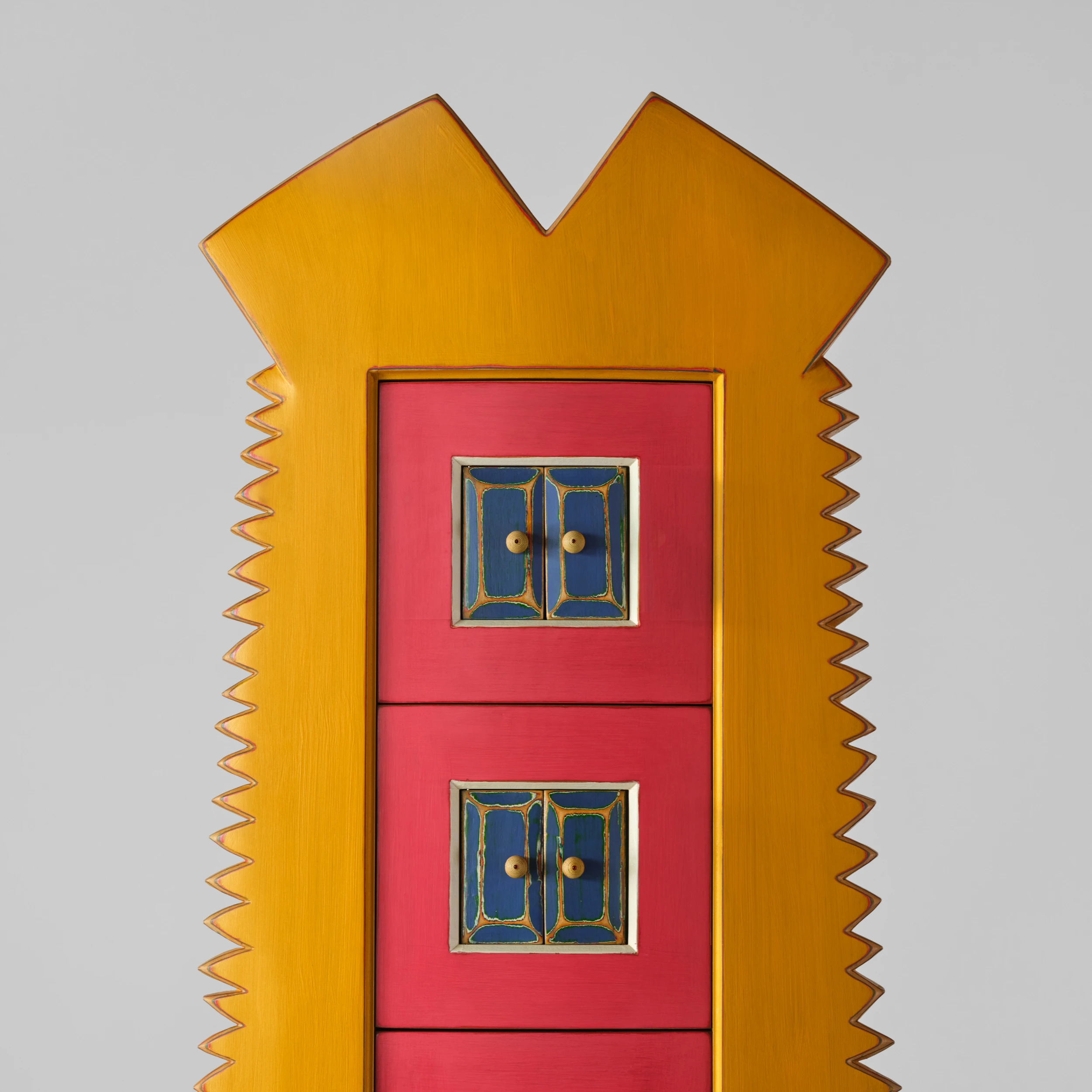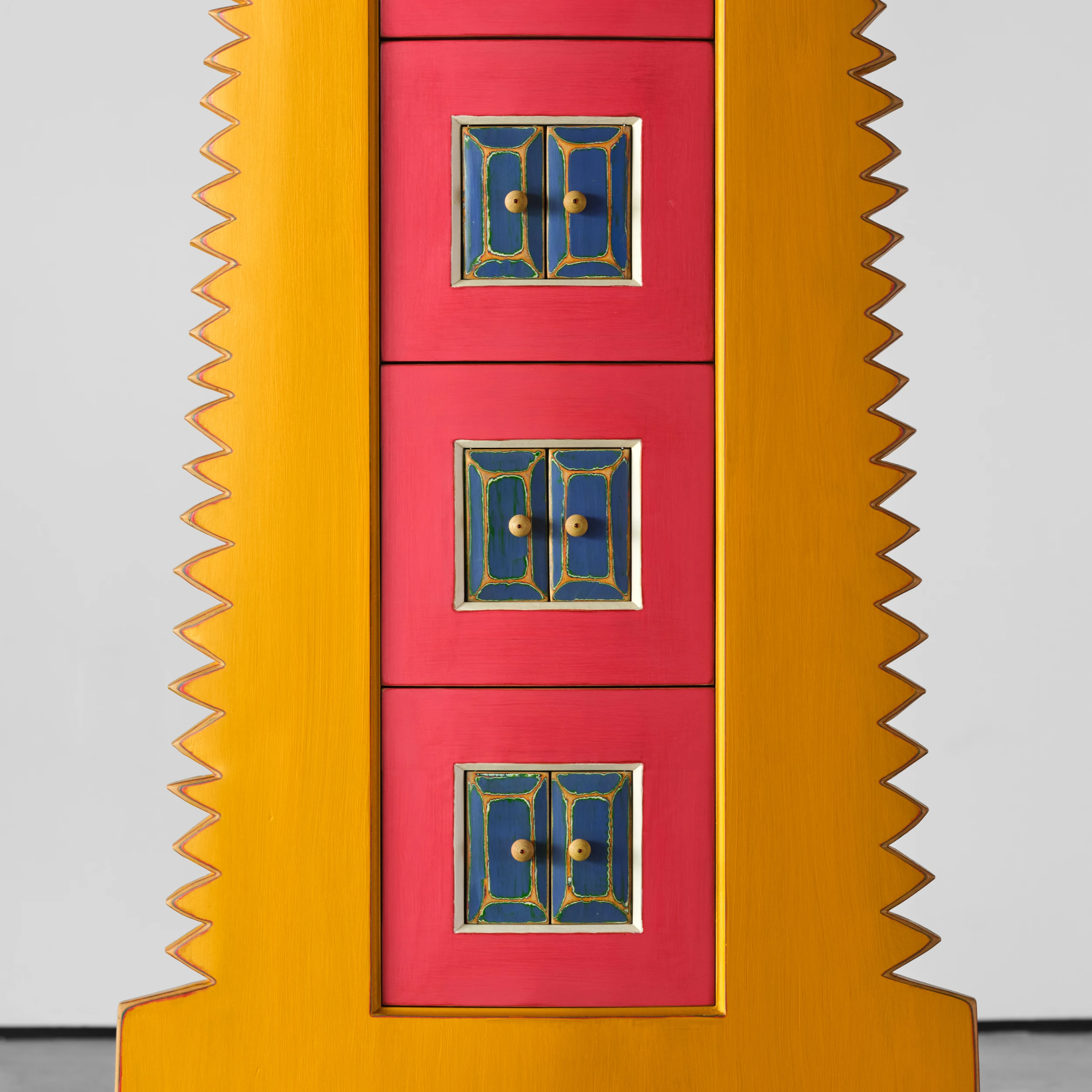Randy Shull’s “Six Secrets” is a whimsical cabinet/dresser form which features a center panel outfitted with drawers. The drawer pulls are accessible via the functional double door/shutter-like openings adding an additional layer of whimsy and interactivity.