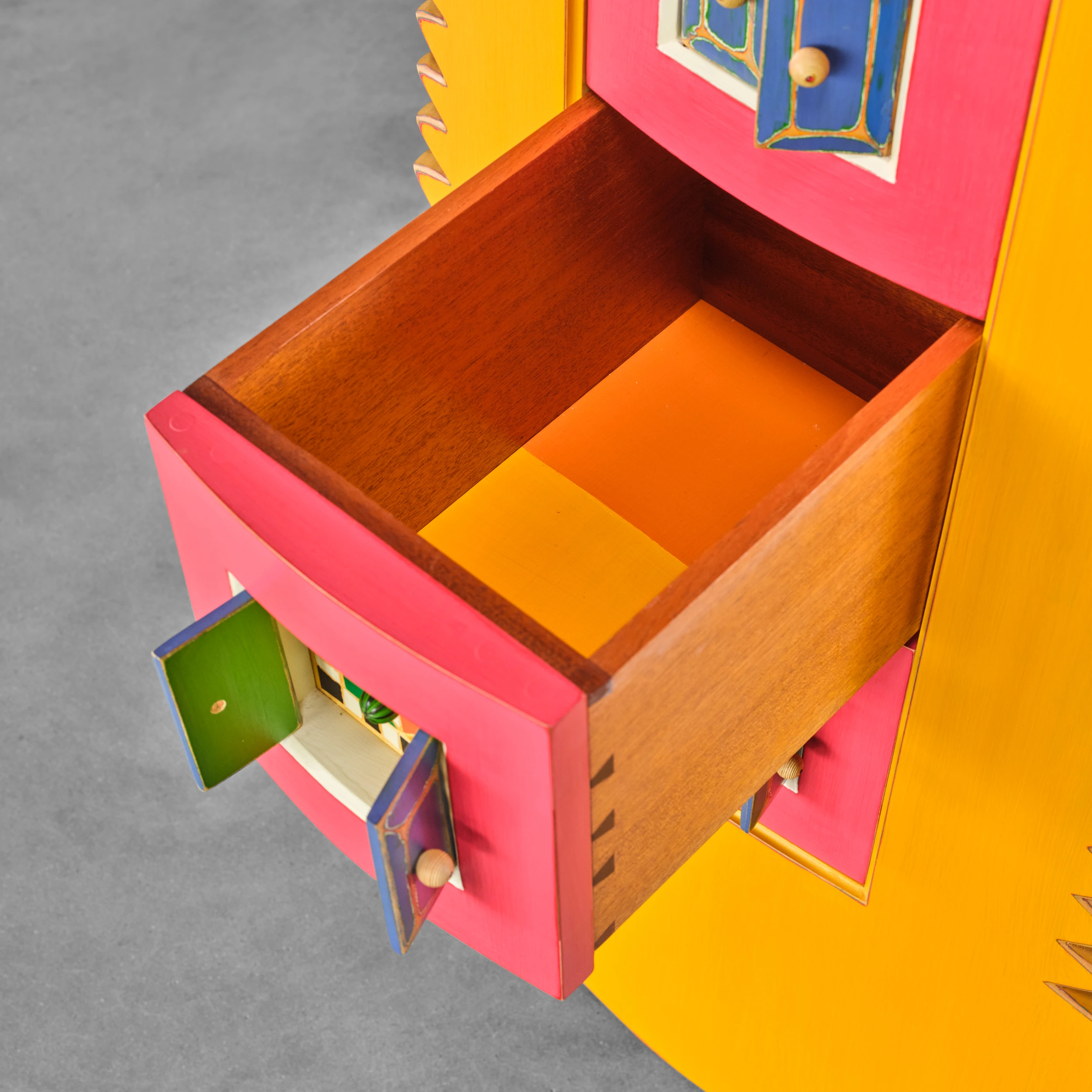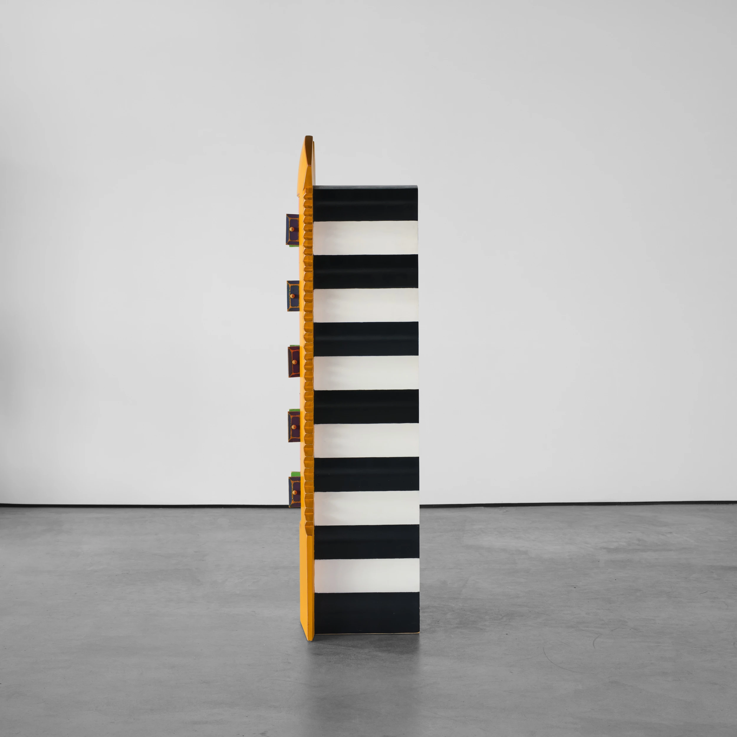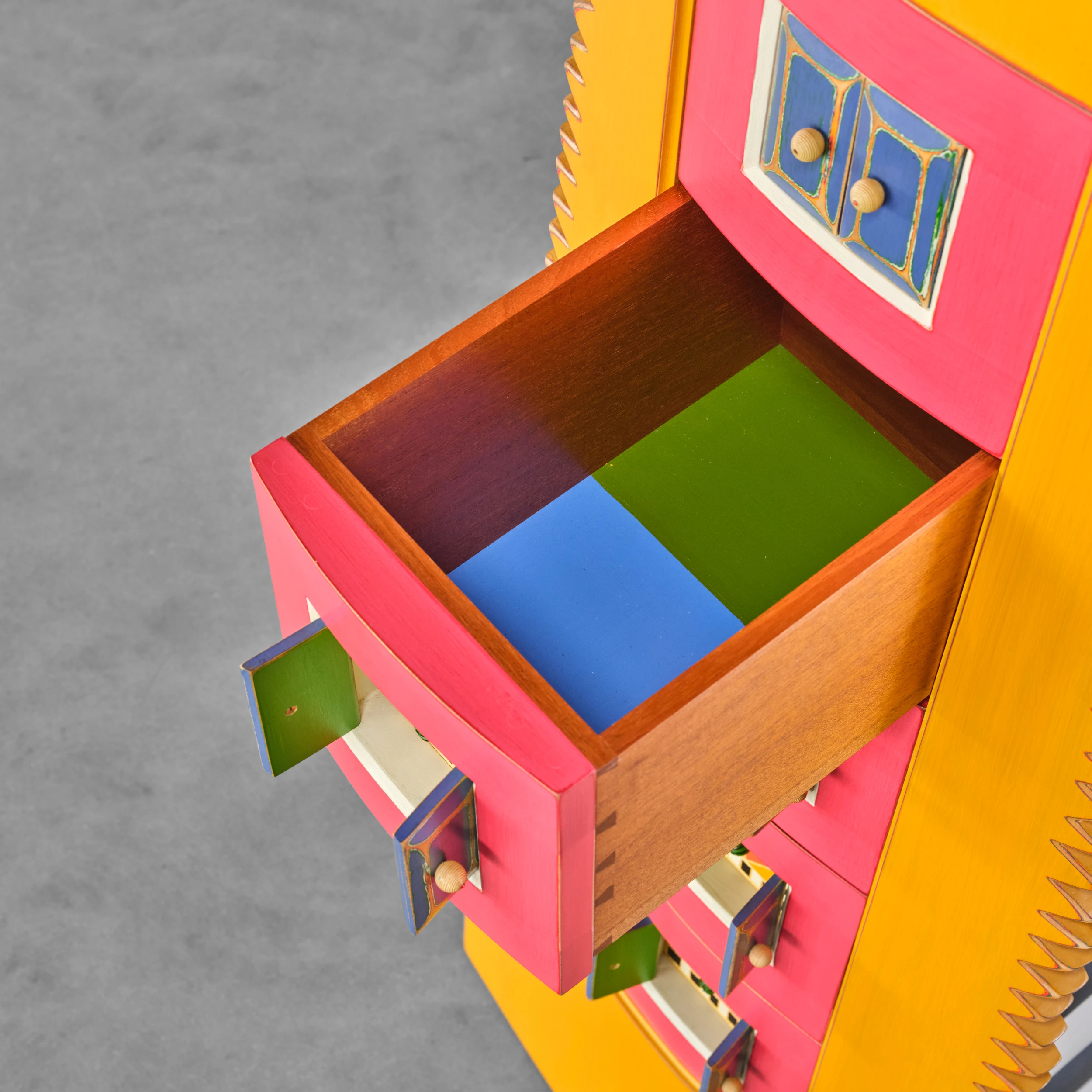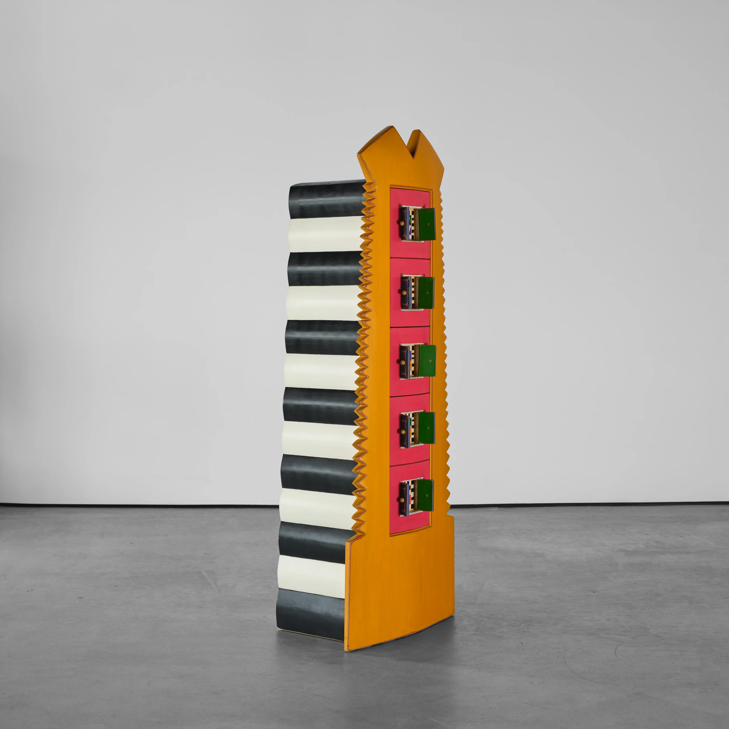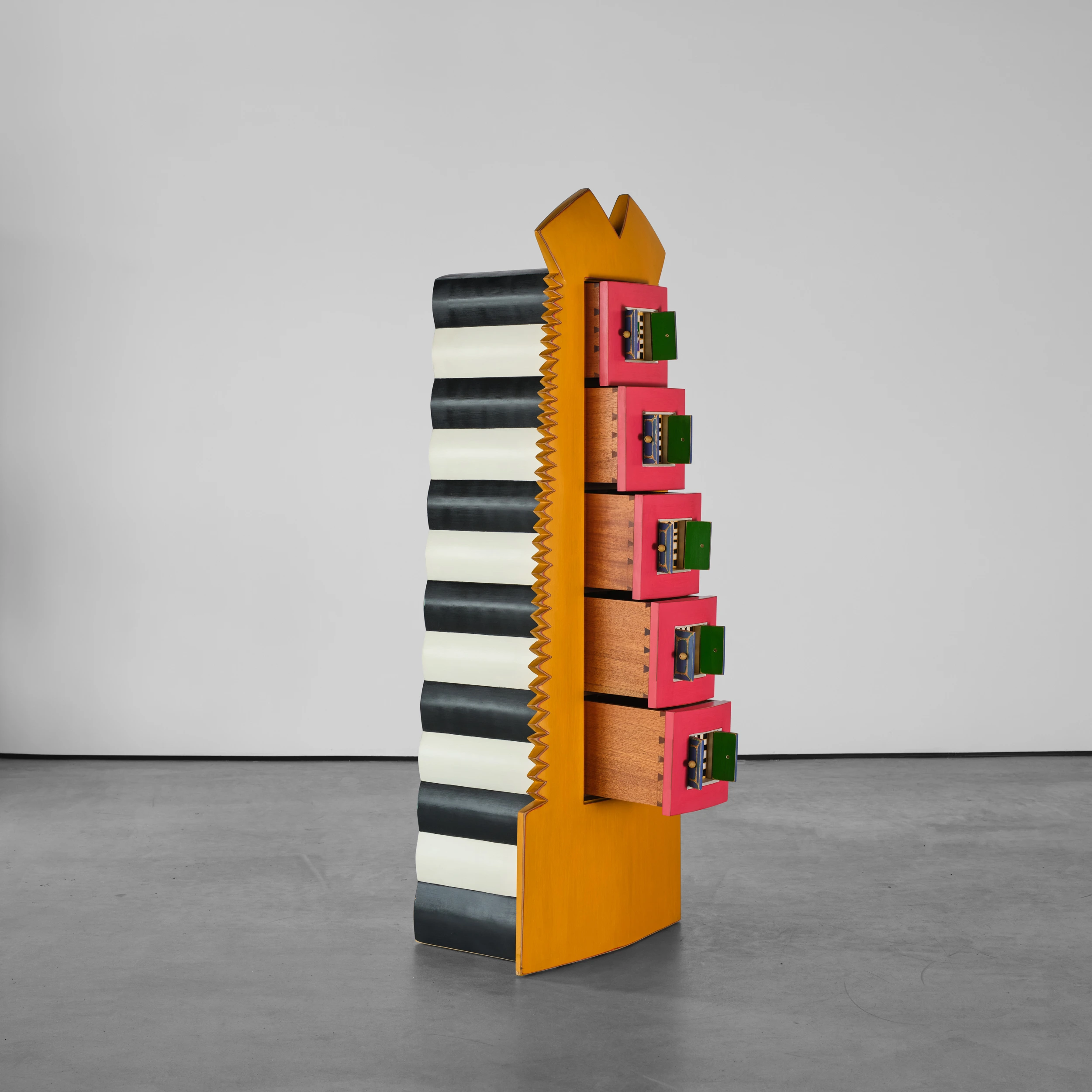 Randy Shull’s “Six Secrets” is a whimsical cabinet/dresser form which features a center panel outfitted with drawers. The drawer pulls are accessible via the functional double door/shutter-like openings adding an additional layer of whimsy and interactivity.