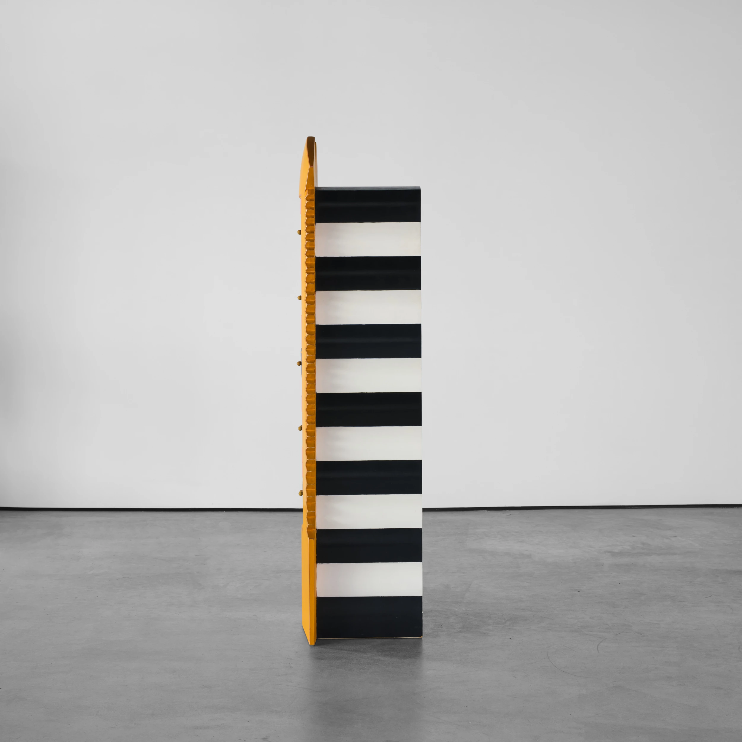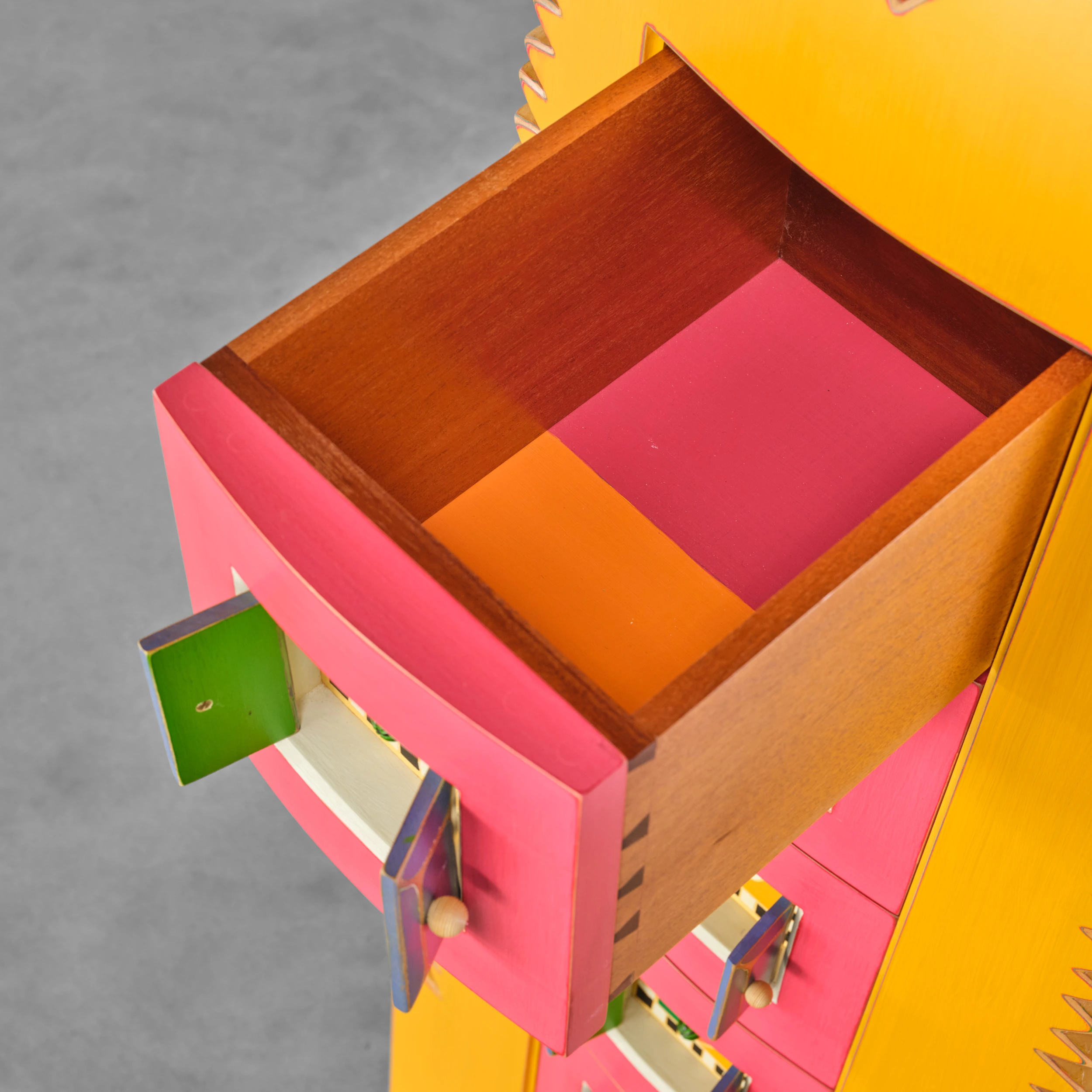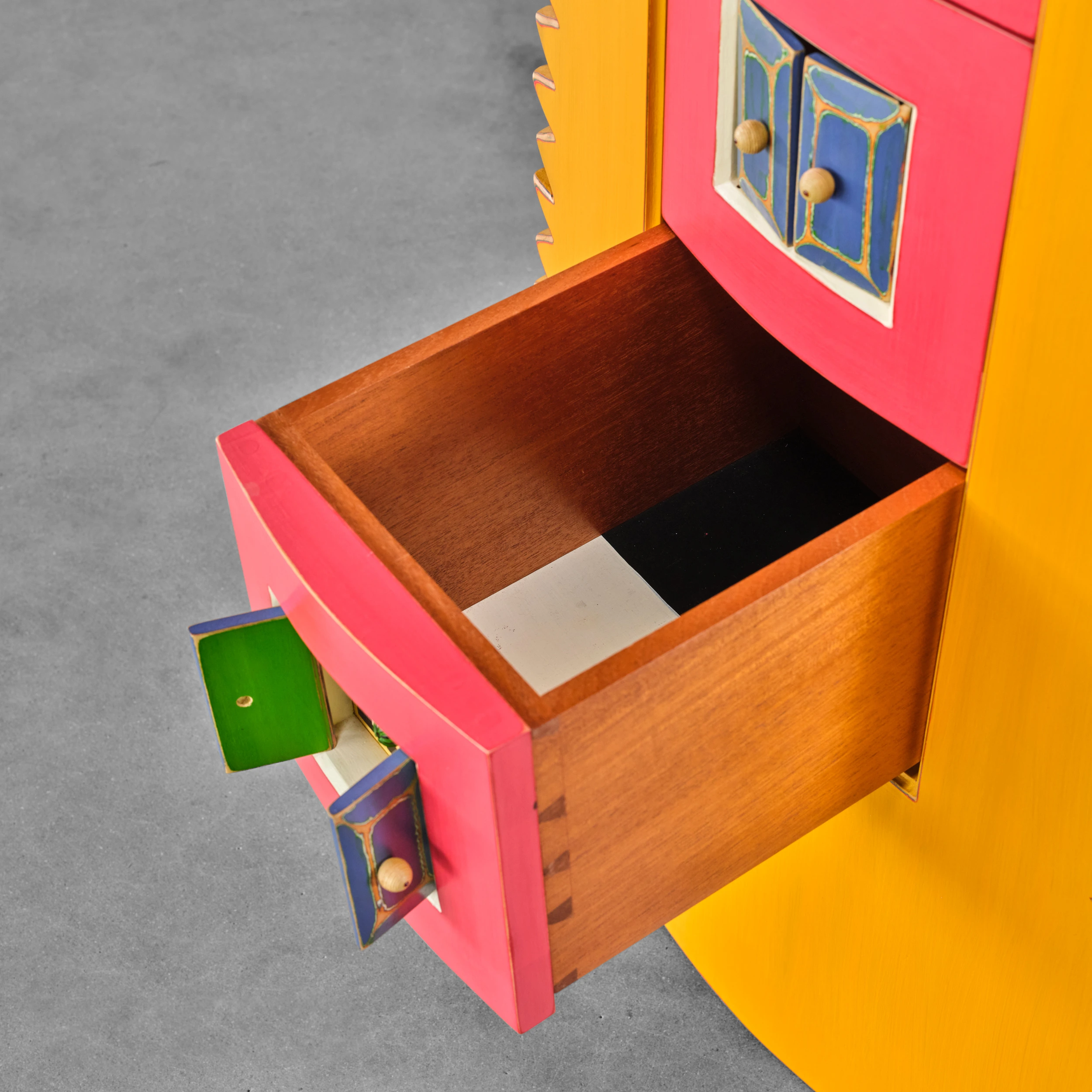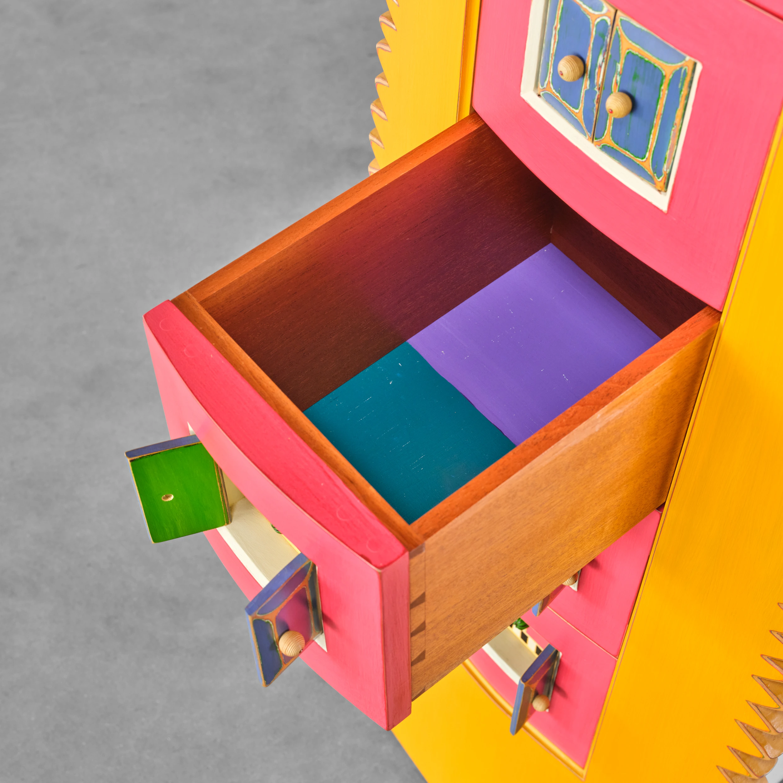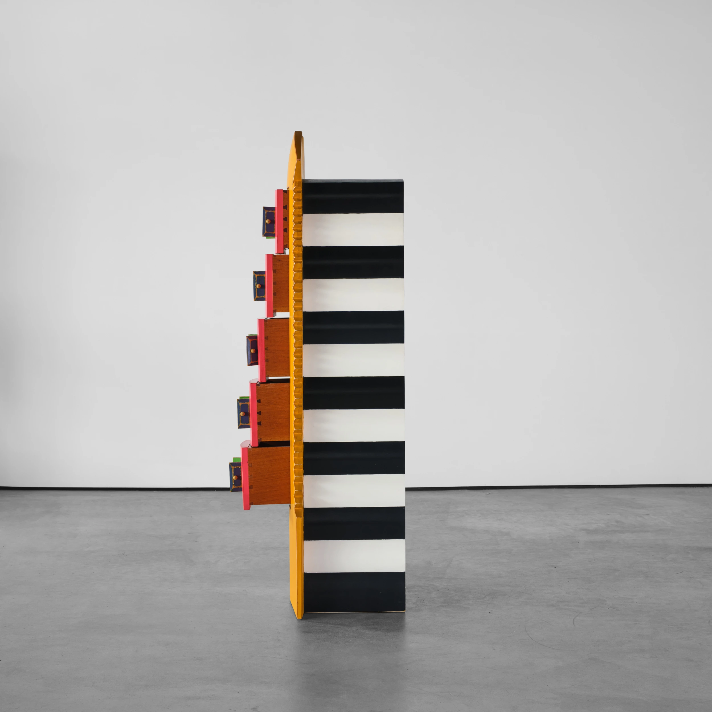 Randy Shull’s “Six Secrets” is a whimsical cabinet/dresser form which features a center panel outfitted with drawers. The drawer pulls are accessible via the functional double door/shutter-like openings adding an additional layer of whimsy and interactivity.