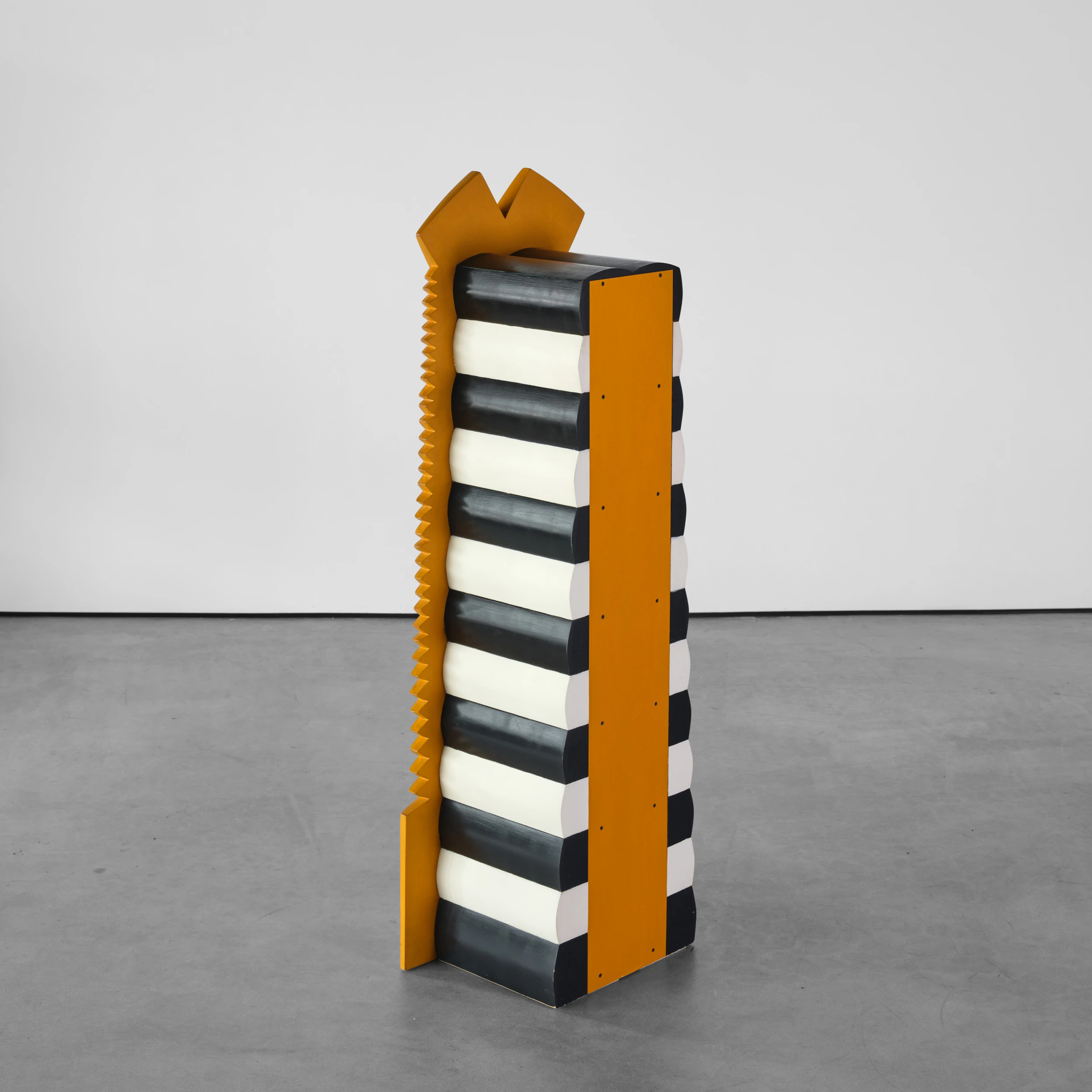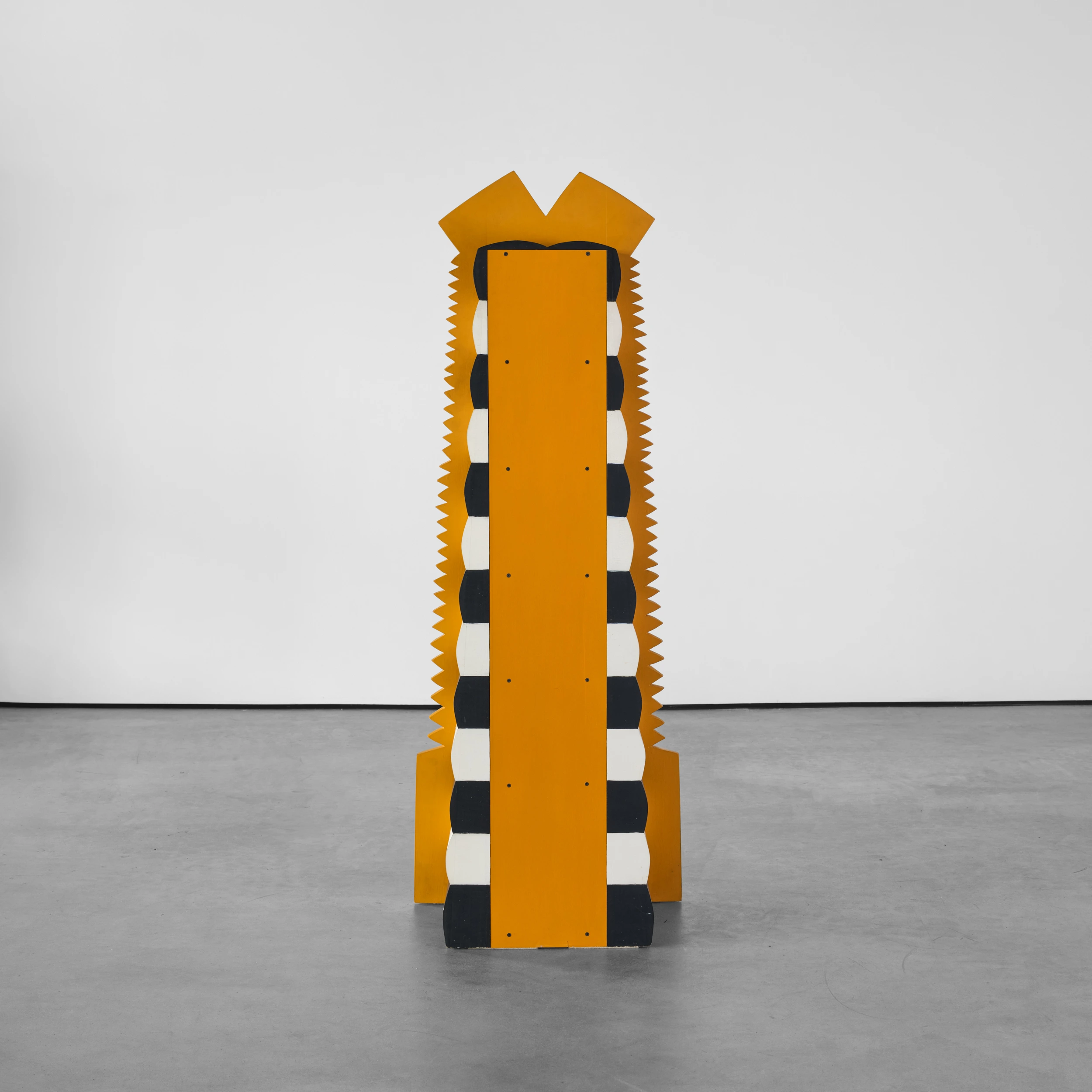 The work’s totem-like form is outlined with architectural motifs and saw-tooth-like edges. Additionally, “Six Secrets” features accumulated layers of milk paint which are subsequently etched along the edges and outlines of the work to reveal the colorful stratification. These revealed edges and outlines engender a sketch-like quality in the work.
