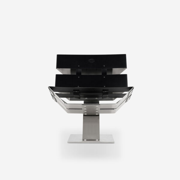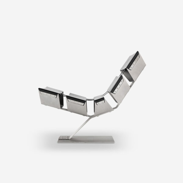 Handcrafted in full grain leather and brushed stainless steel, the elements of the seat, all extremely mobile, stretched, turned and bent, to hug the body and give it a feeling of weightlessness. All you have to do is to close your eyes to escape to other horizons.