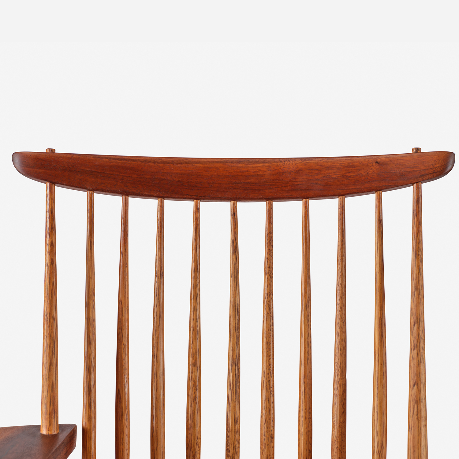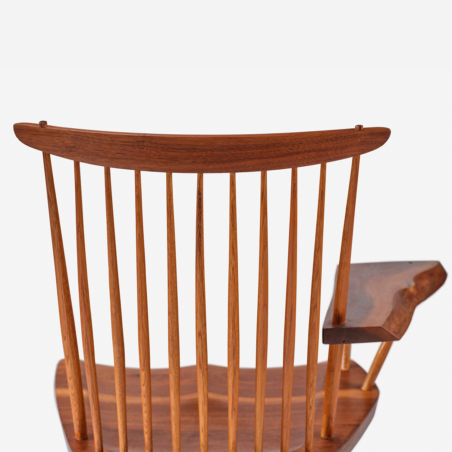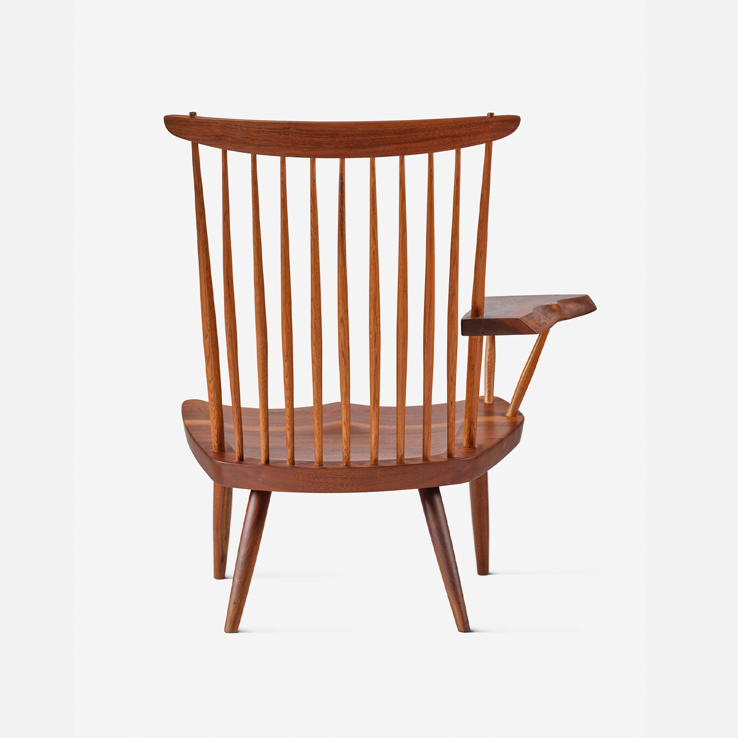George Nakashima’s “New” lounge chair is an iconic example of American-Japanese design. Through the use of free form arm, which accentuates the wood’s natural characteristics, he reveals nature’s beauty. The form of the chairs and the hand-carved spindles are a reference to a traditional American design, the Windsor chair.