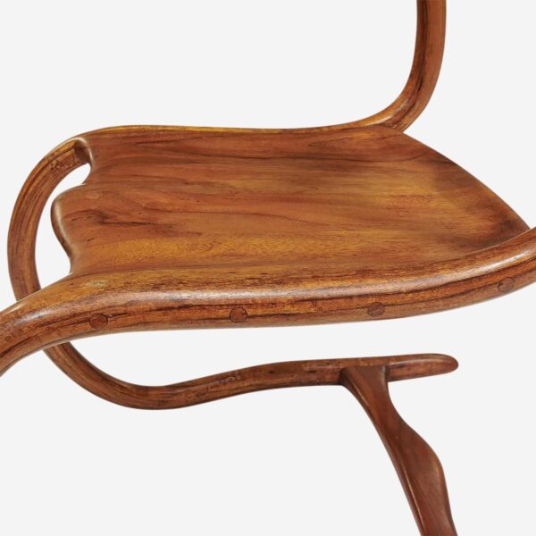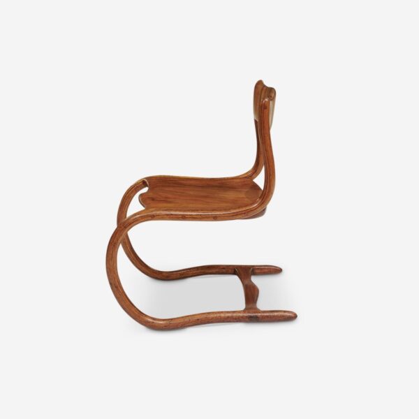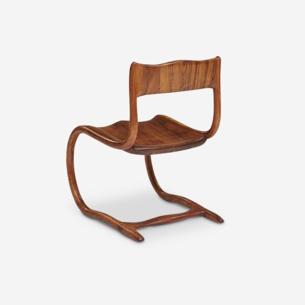 A 1981 Cantilevered Chair by American woodworker and designer Steven Spiro; the form is made from sculpted and bent-laminated wood.
