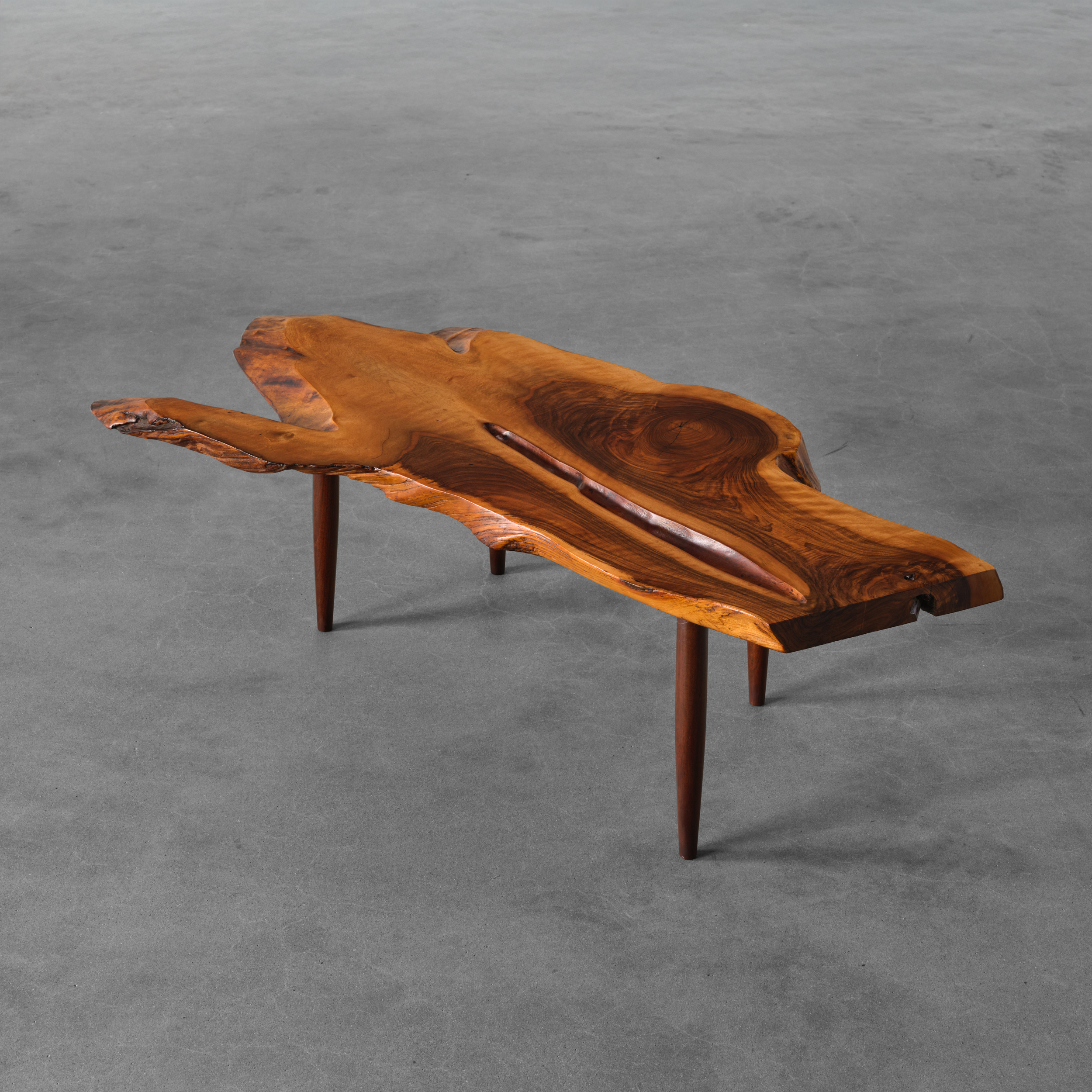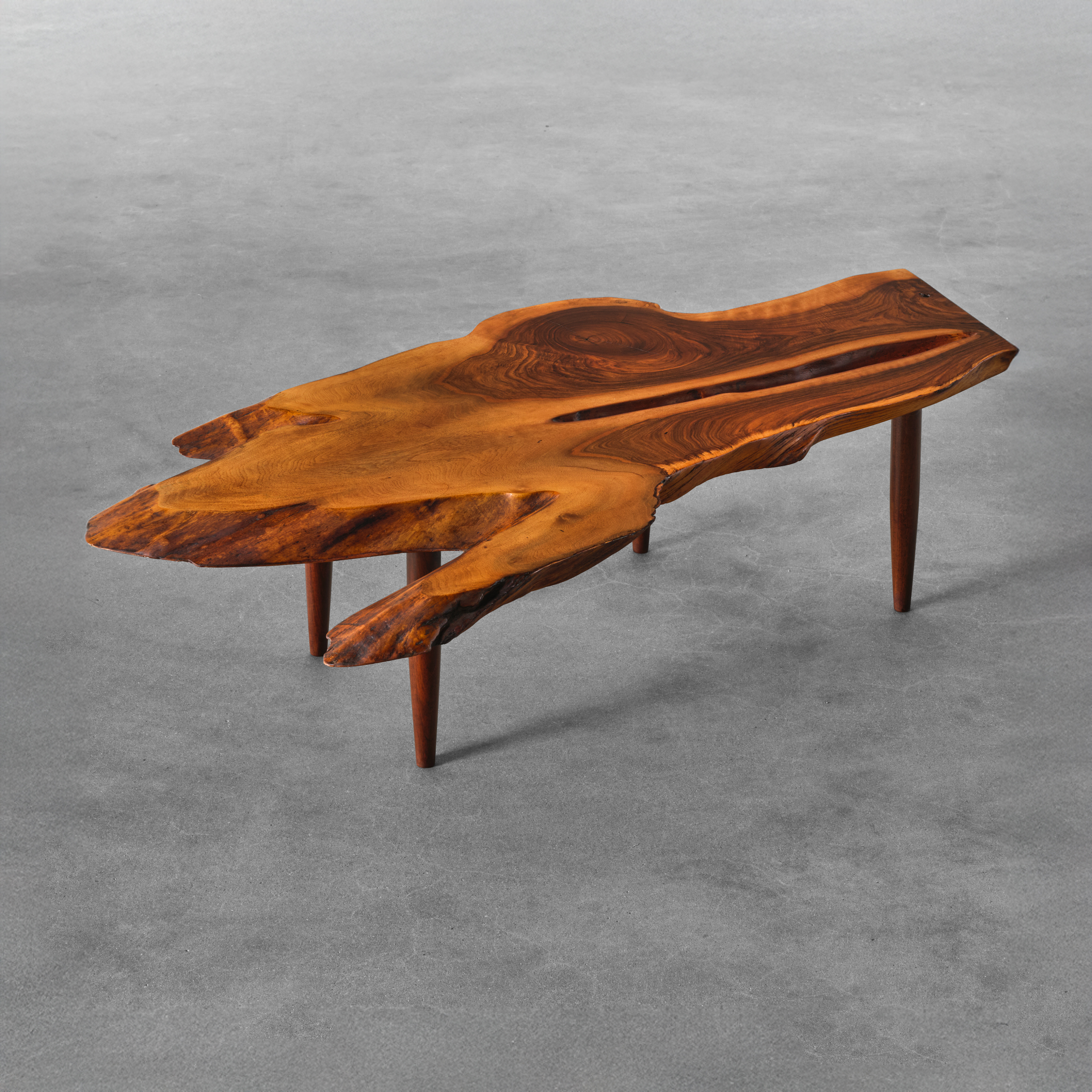 Mira Nakashima, on reflecting on the conceptual basis of the Slab style coffee table, notes the works were “designed to express the character of a particular slab. Crotch figures, knots, rotted-out sections, and interesting profiles are used as expressions and not considered defects” (‘Nature, Form, and Spirit’, Mira Nakashima, 2003, p. 106).