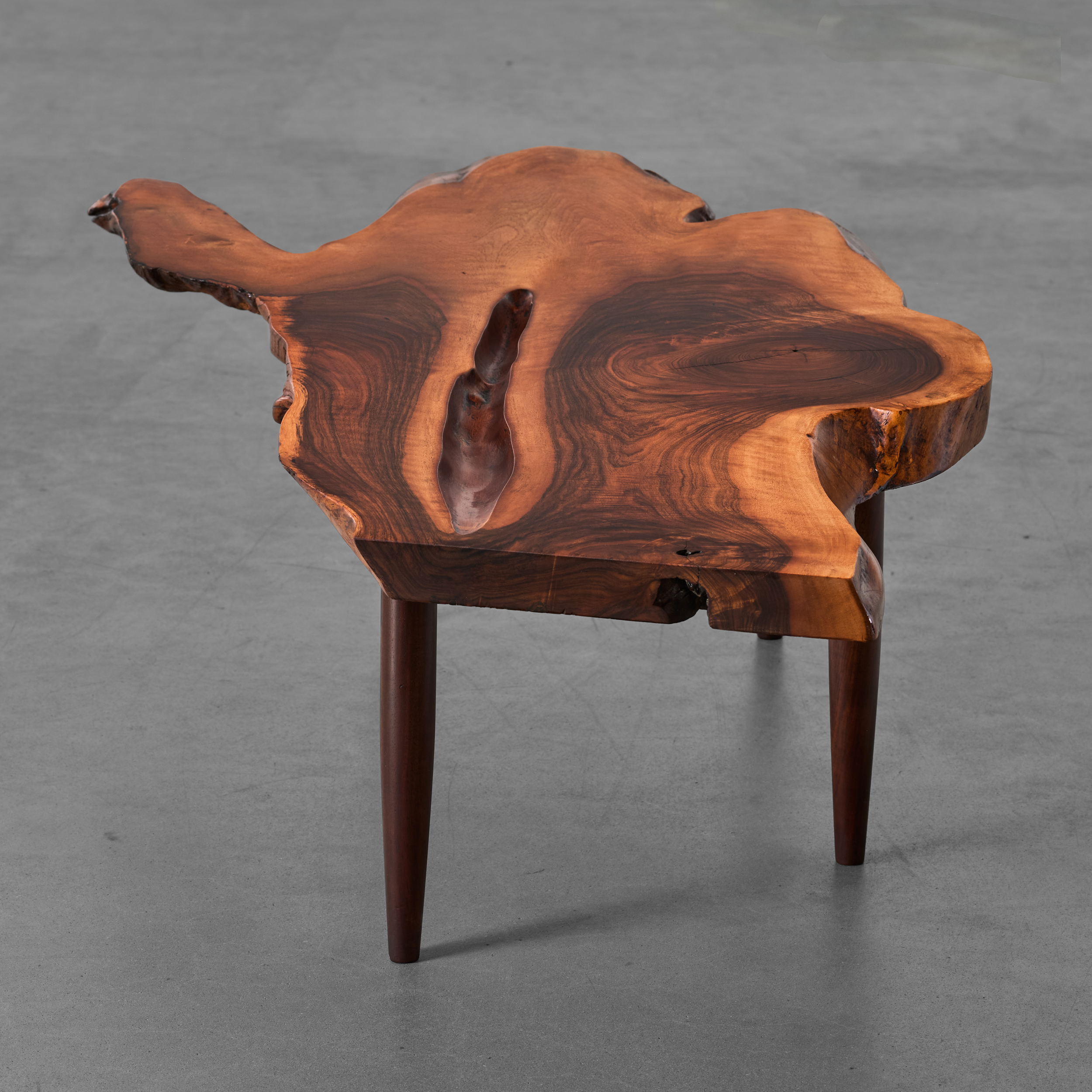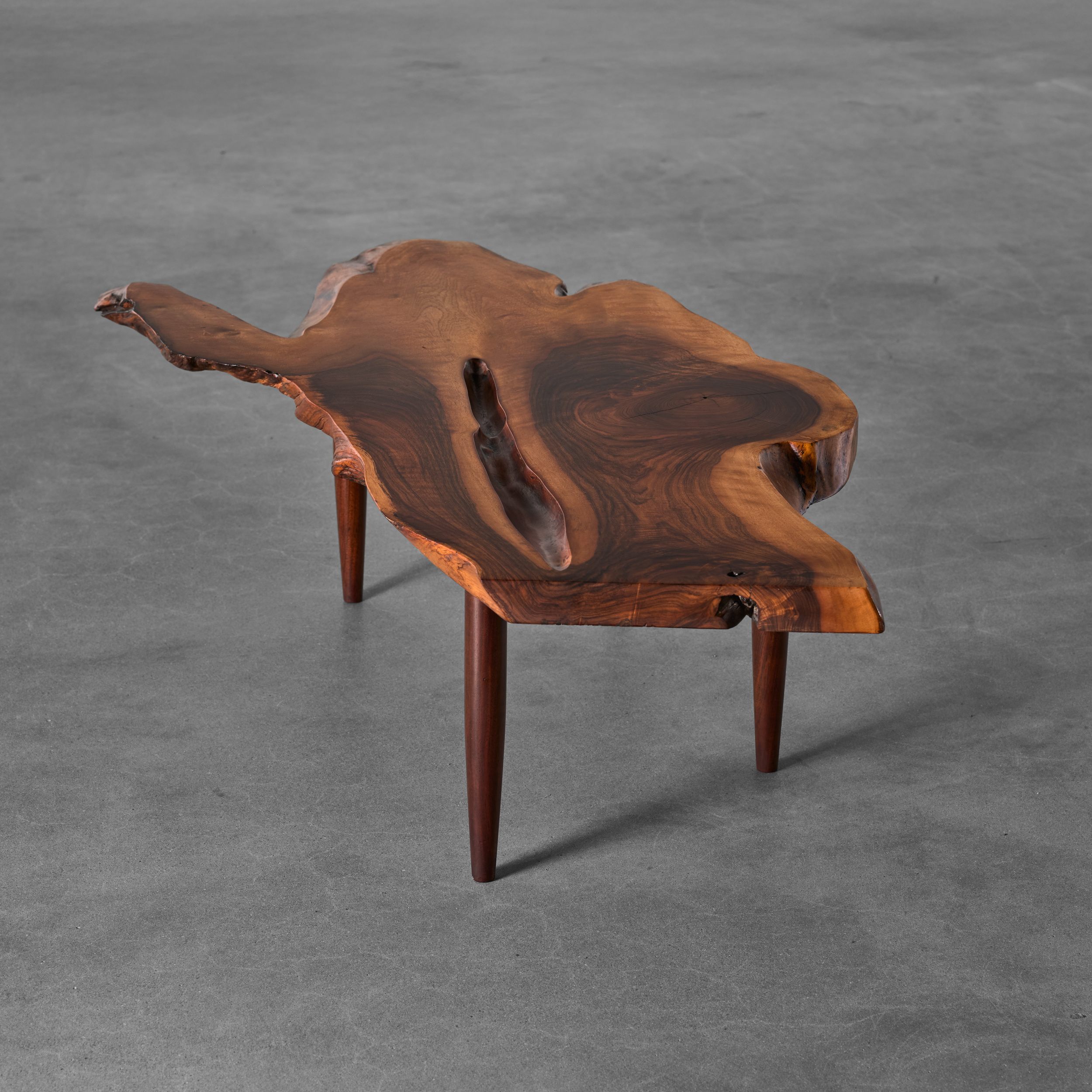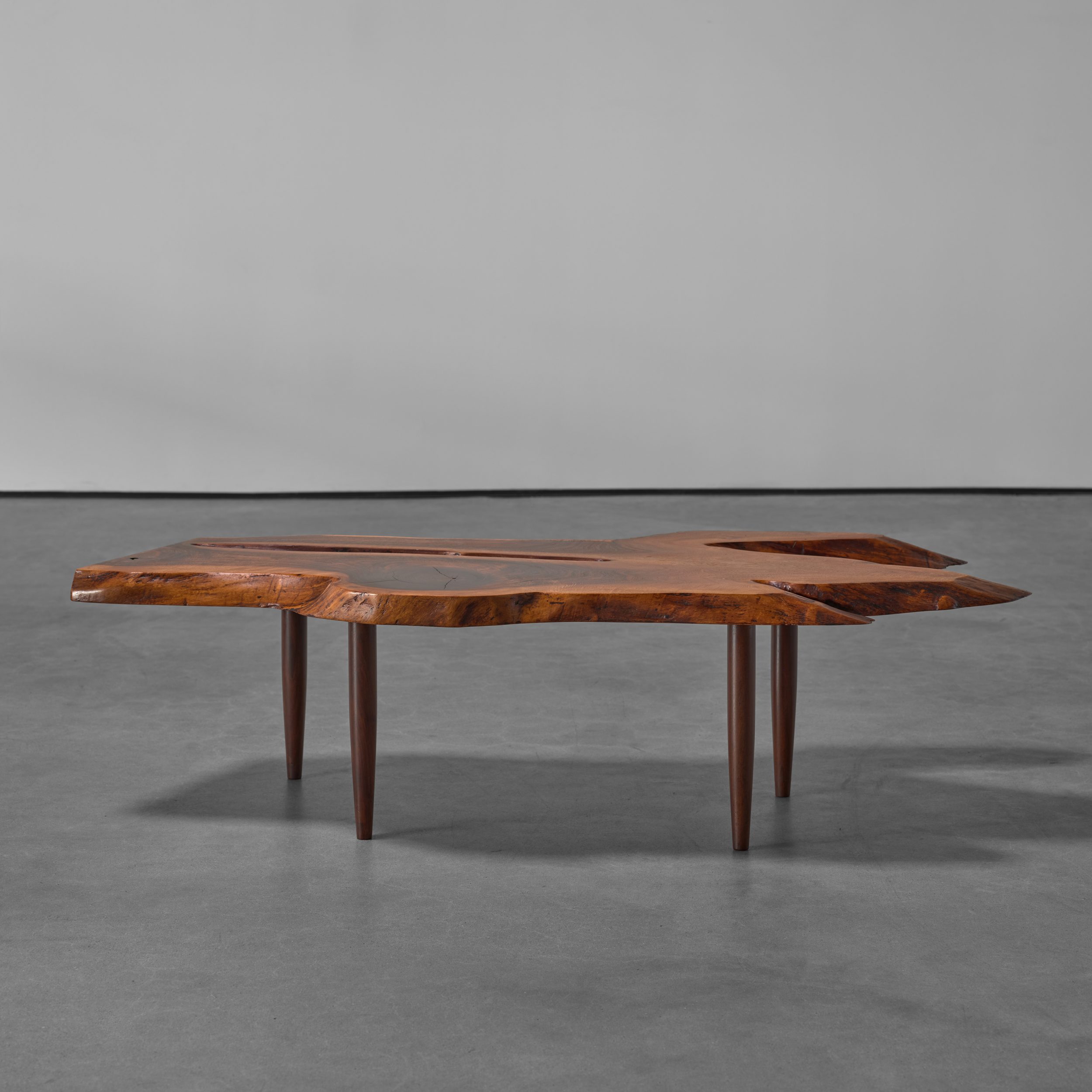 A Slab Coffee Table by George Nakashima dating to 1958. The work features an exceptional, free-form single board top of English Walnut. This example also includes turned legs made from American Black Walnut.