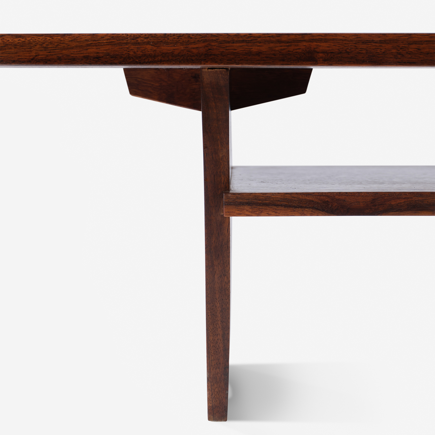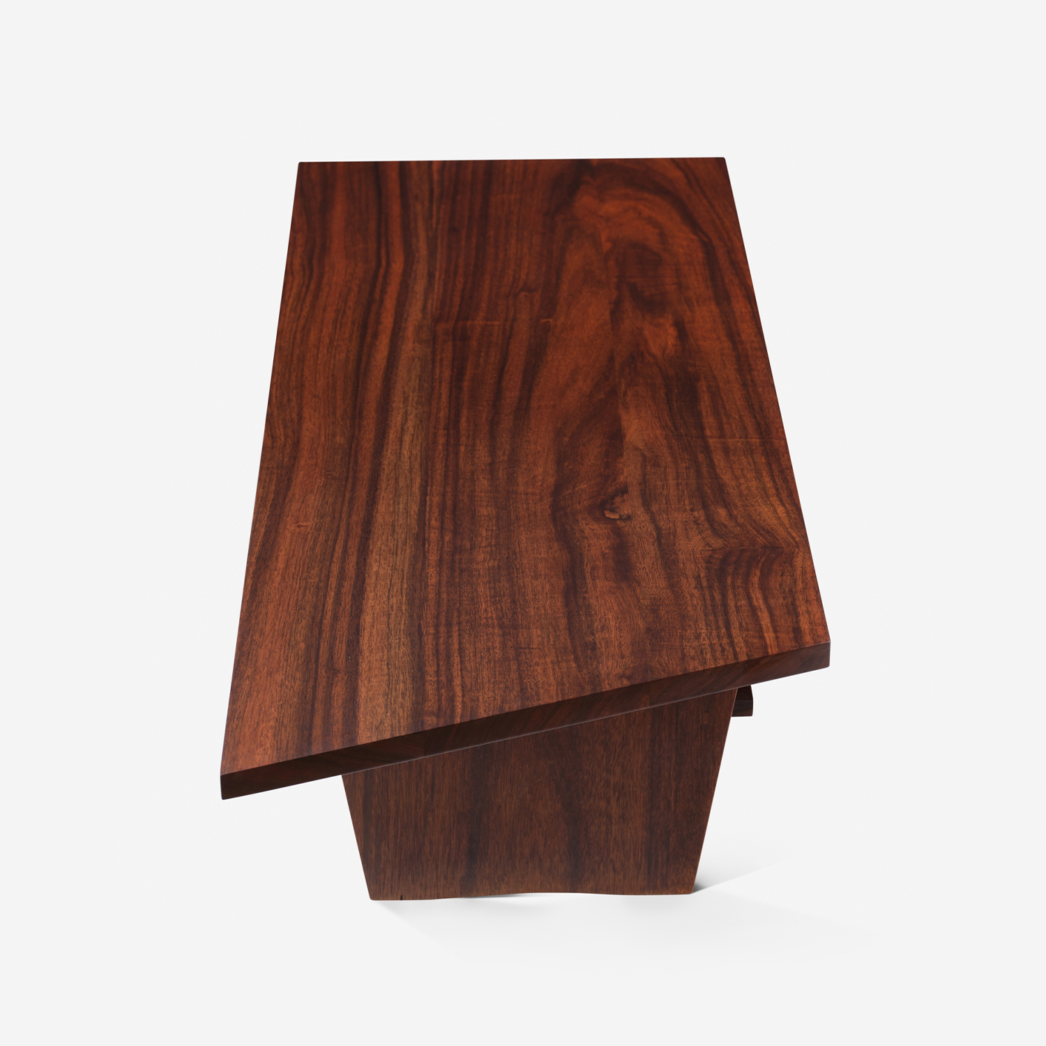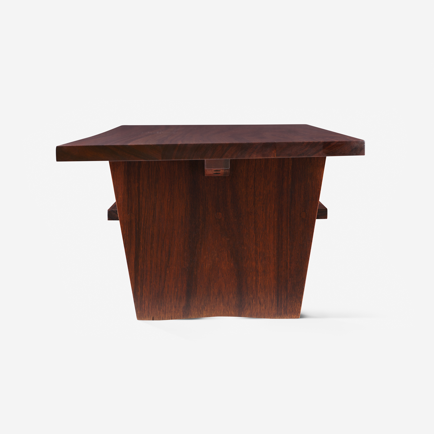 This coffee table, originally referred to as ‘Table with Shelf’ by Nakashima, features a warm, rich brown East Indian Laurel wood top with a gorgeous organic grain pattern. The legs and shelf are elegantly designed to match the top and provide additional storage or display space, balancing form and function. It embodies Nakashima’s love for merging traditional Japanese woodworking and modern design.