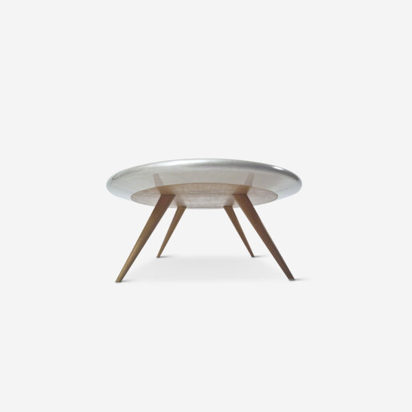 The Surf table is built in nacreous and structured artisanal lacquer, and raised by a turned zebra wood base.