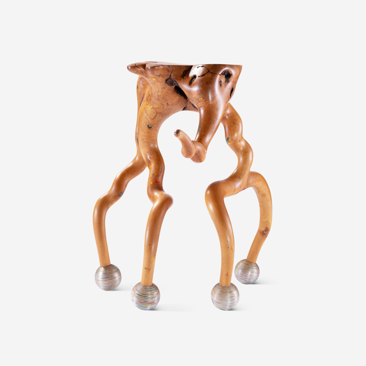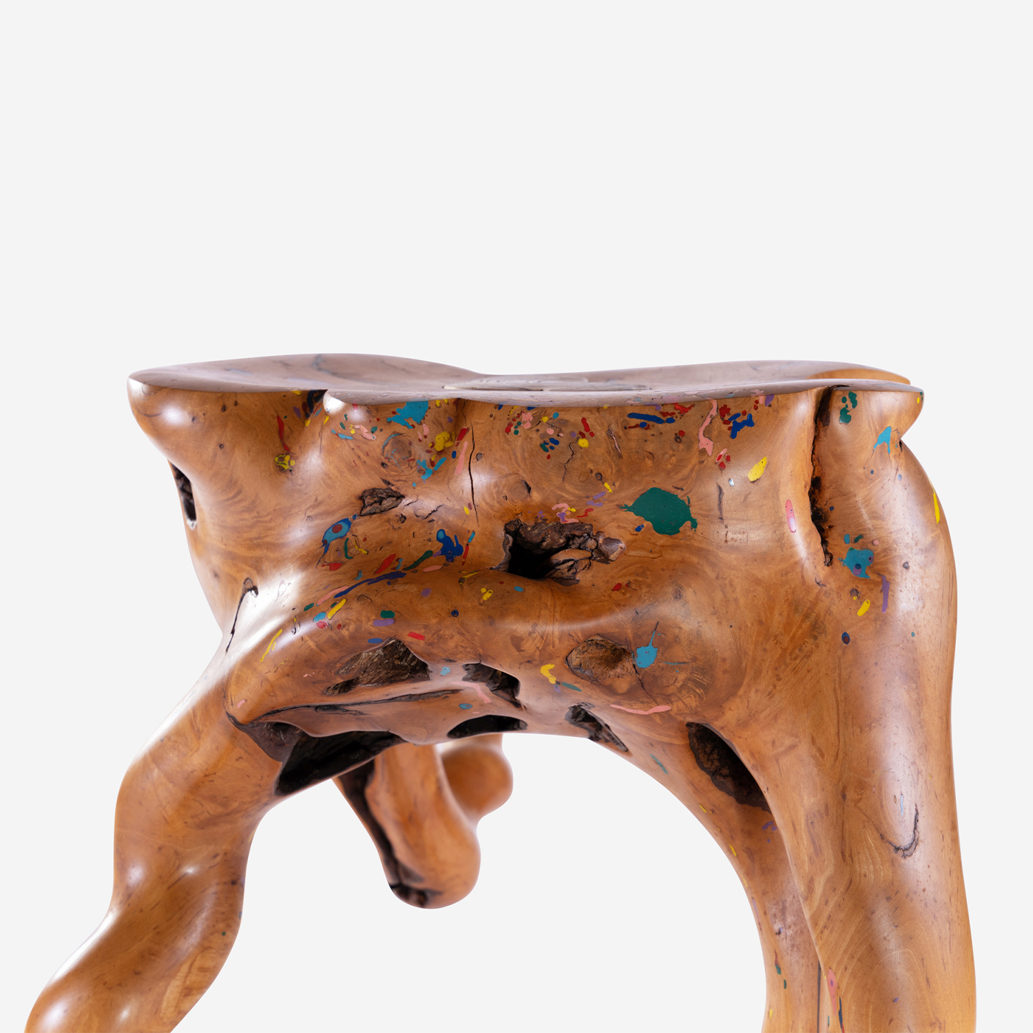 A unique and striking piece of furniture, crafted from the root of a tree and combined with metal elements. The organic and irregular shape of the root forms the base of the table, adding natural texture and character to the piece. The metal accents complement the wood, adding a modern and industrial touch. This end table is not only functional but also serves as a statement piece in any living space, showcasing the talent and creativity of the artist. The combination of wood and metal creates a harmonious balance, making this end table a beautiful and functional addition to any room.