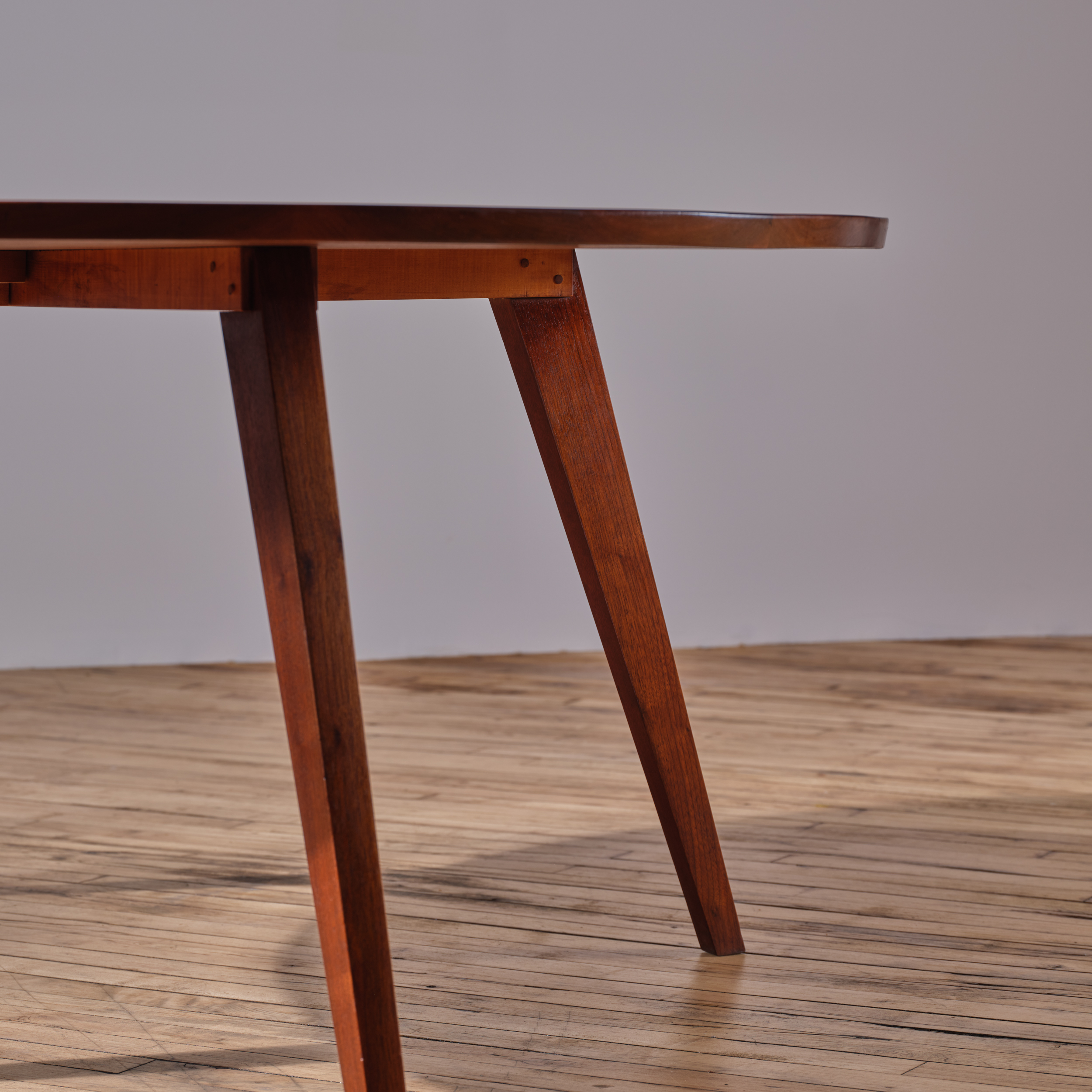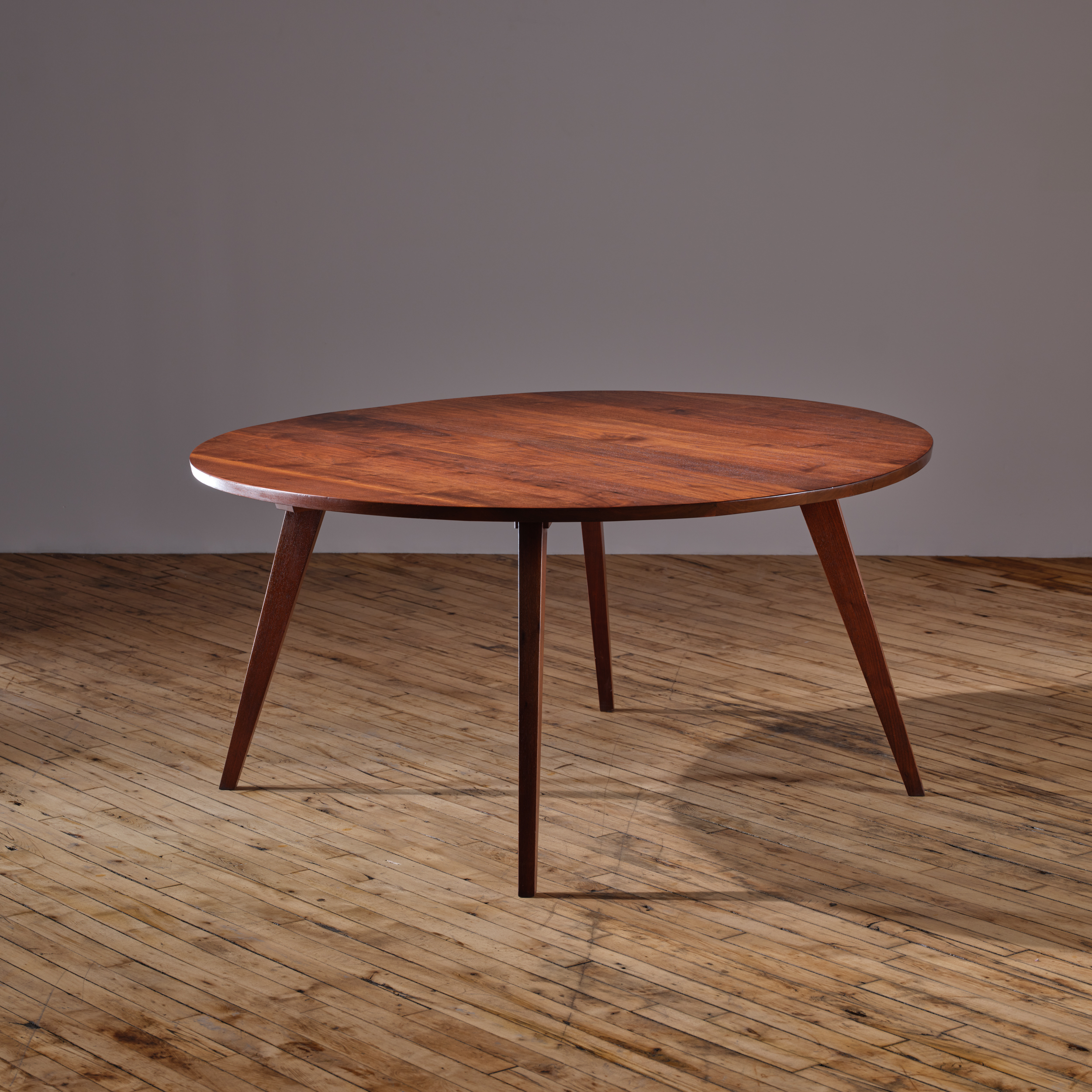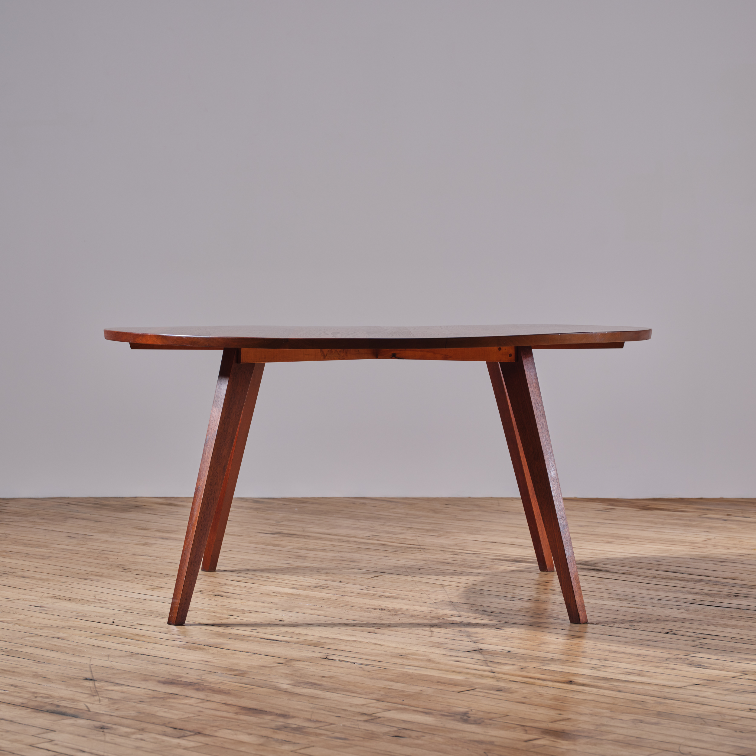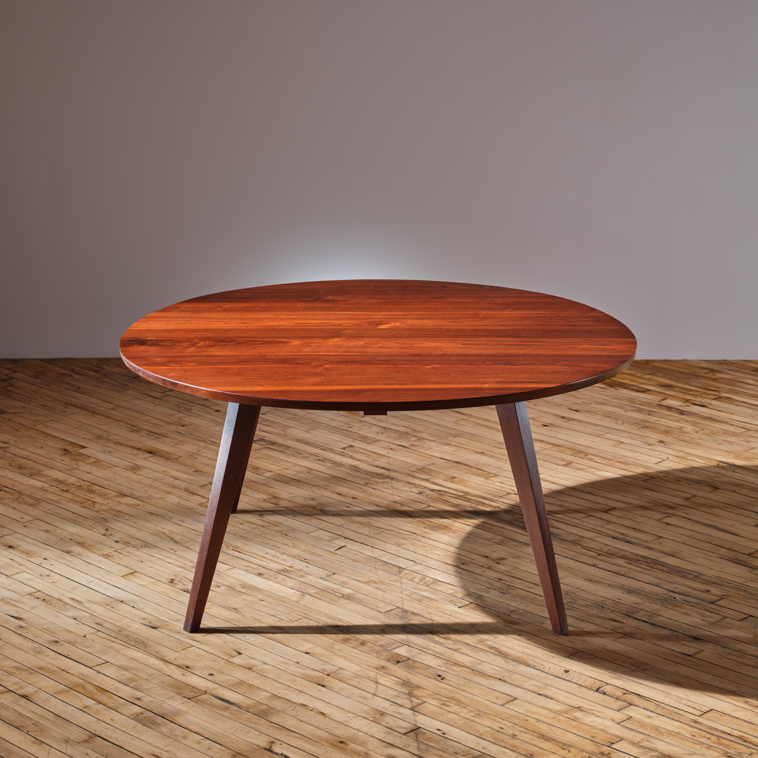 An early example of a round dining table by George Nakashima, showcasing splay-legs.   The Splay-Leg, introduced in 1946, was one of George Nakashima’s initial base designs. He later transitioned to using the turned leg.  This table is a rare example of the evolution of Nakashima’s design process.