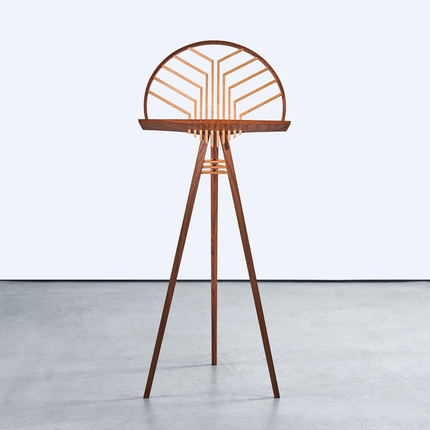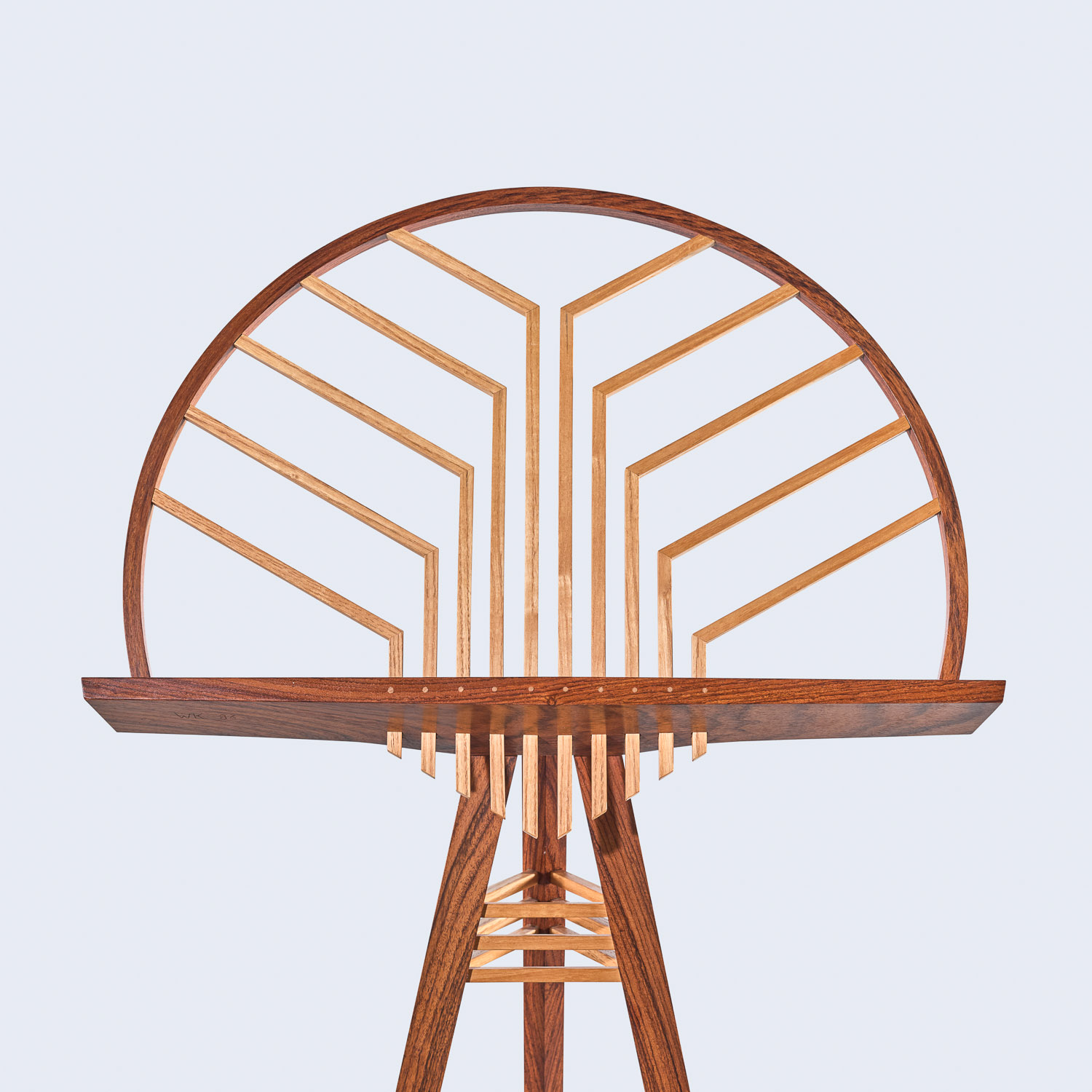 Crafted from contrasting Wenge and Ash, this music stand demonstrates Keyser’s interest in both material dynamics and visual harmony. The slender tripod base supports a cantilevered shelf and semicircular frame, within which ash spindles radiate outward in a visually striking pattern.