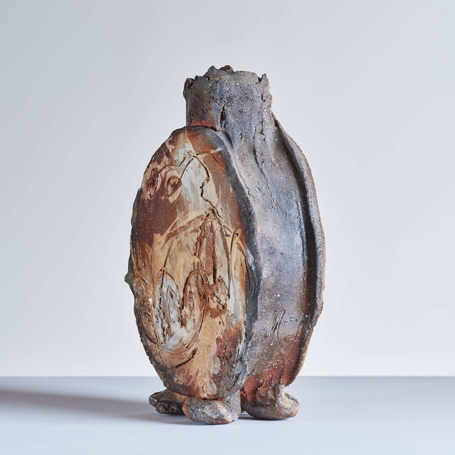 Peter Callas is an acclaimed ceramic artist known for his pioneering work in wood-fired ceramics and his innovative approaches to glaze and form. Callas' work is characterized by his mastery of the anagama kiln, a traditional Japanese wood-fired kiln, which he uses to create dynamic, textured surfaces on his ceramic pieces. His pieces often feature organic forms and complex, vibrant glazes that result from the unique firing process.