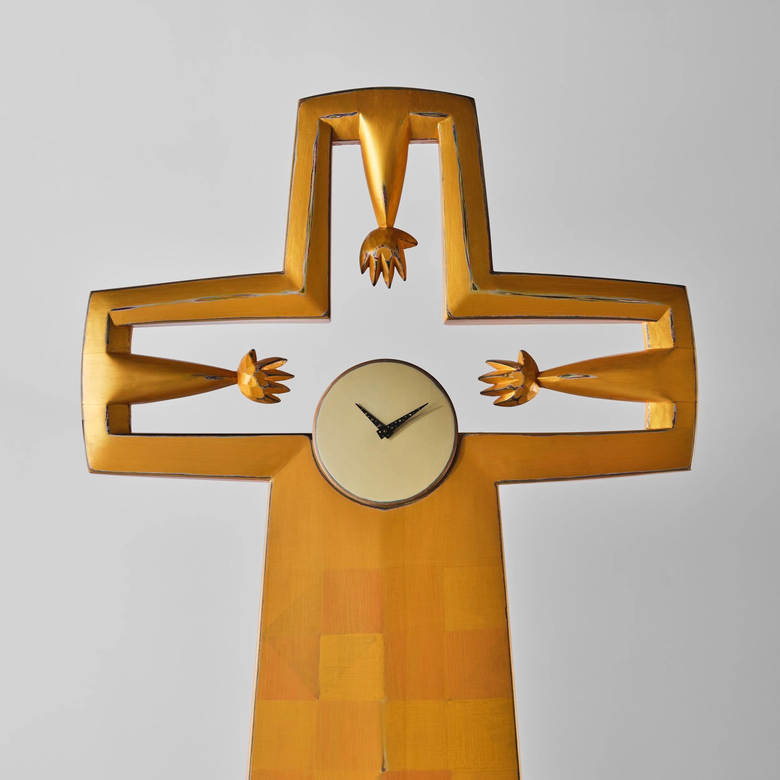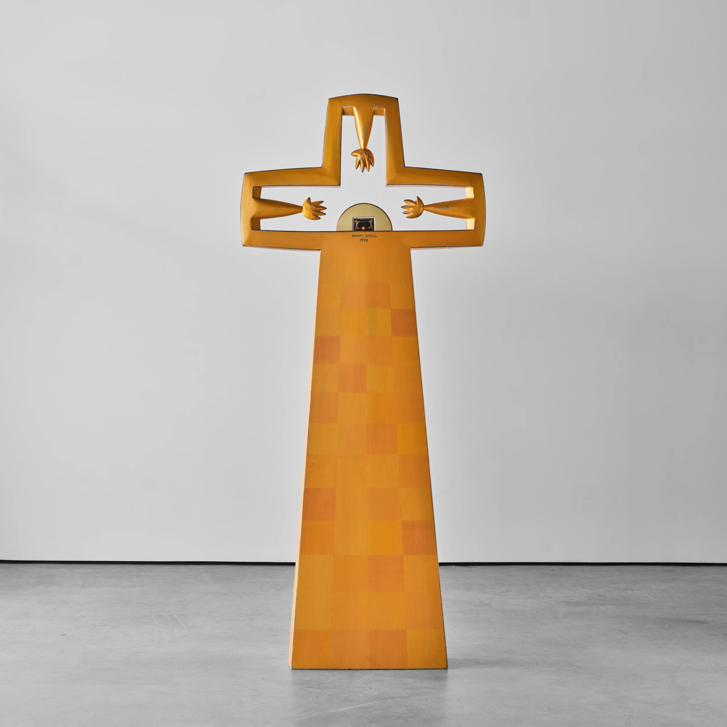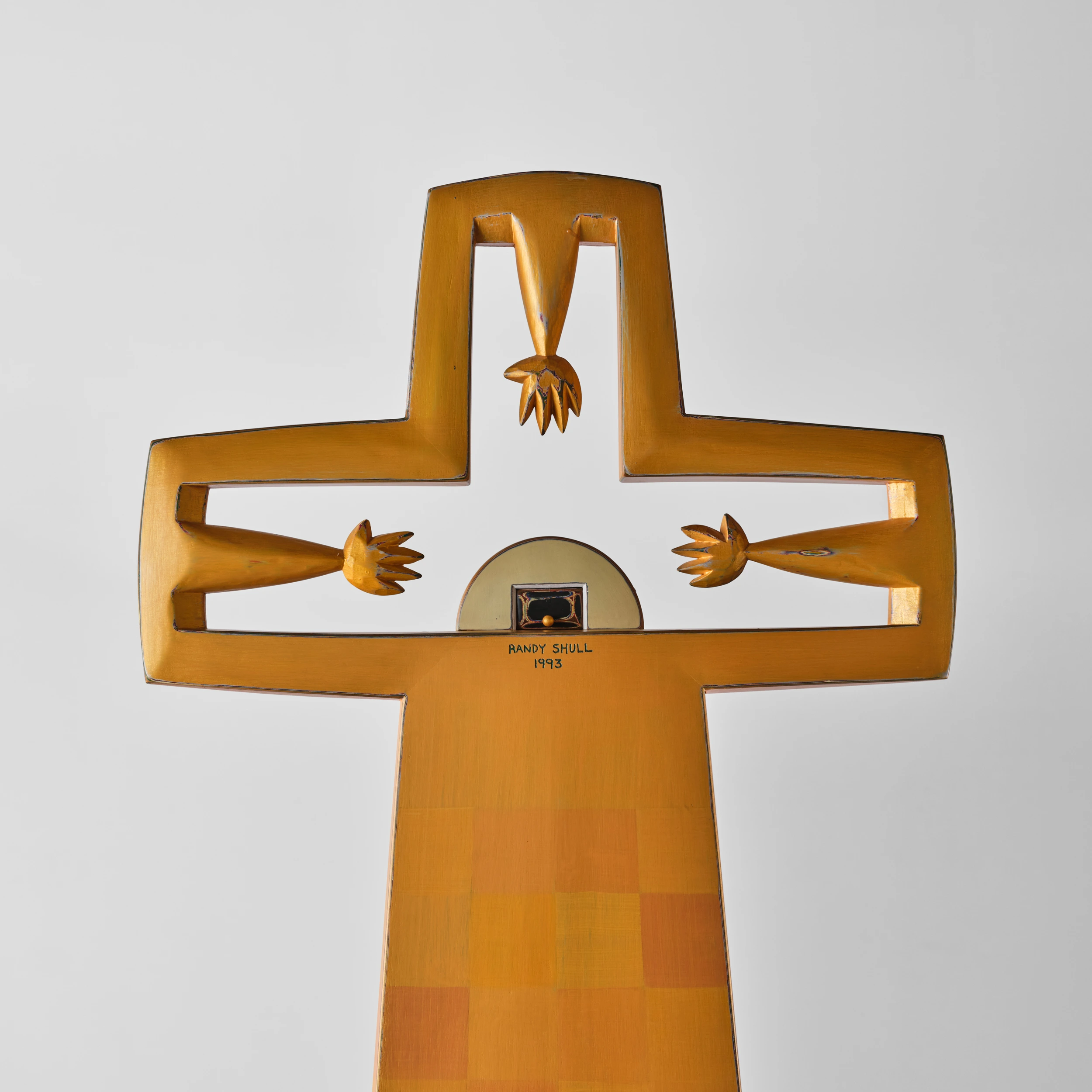 Randy Shull’s “Clock” is a large, cross-like form which features accumulated layers of milk paint which are subsequently etched along the edges and outlines of the work to reveal the colorful stratification. These revealed edges and outlines engender a sketch-like quality in the work. At the focal point of the piece is a functional clock which three outstretched hands appear to grasp for.